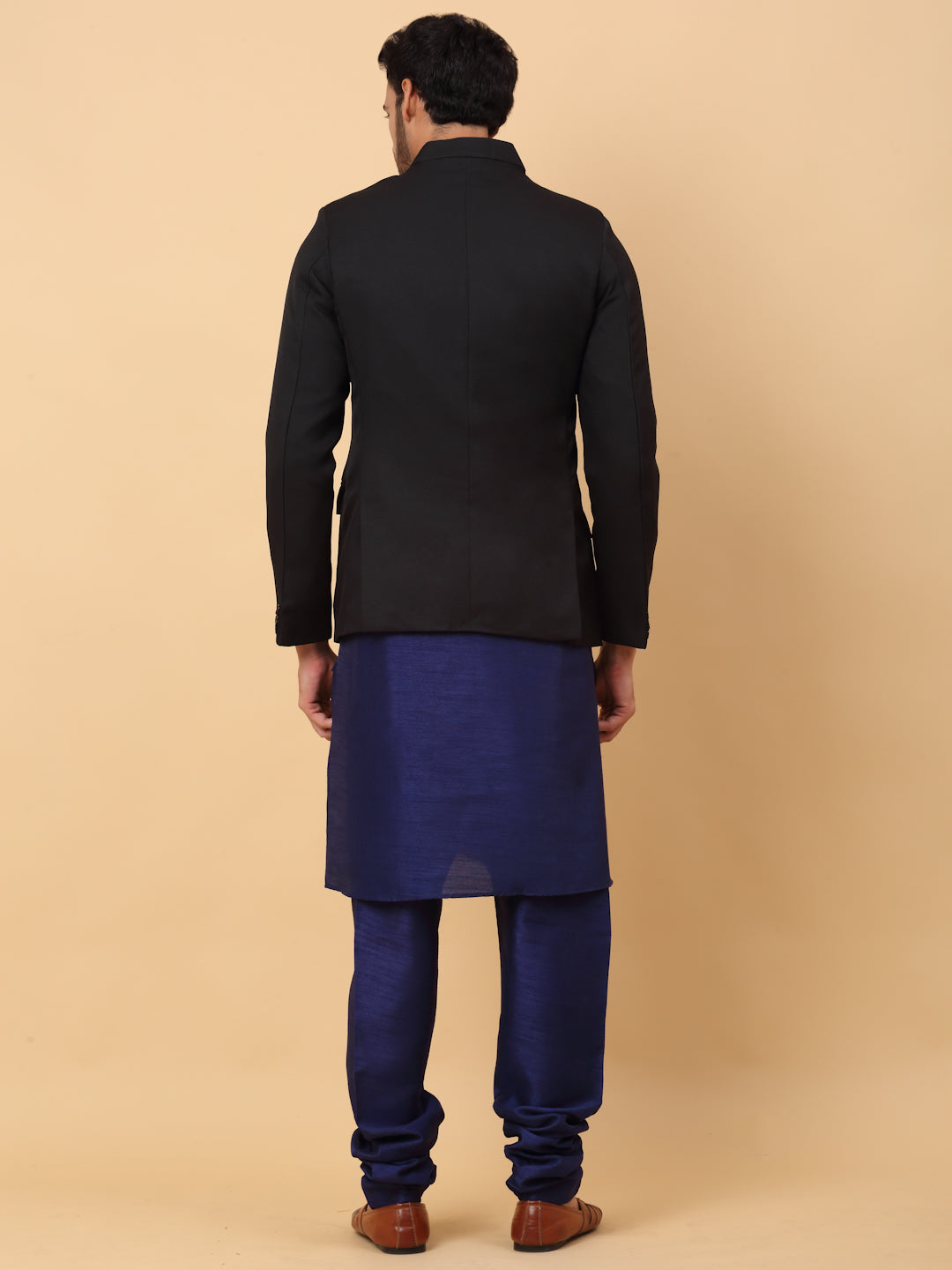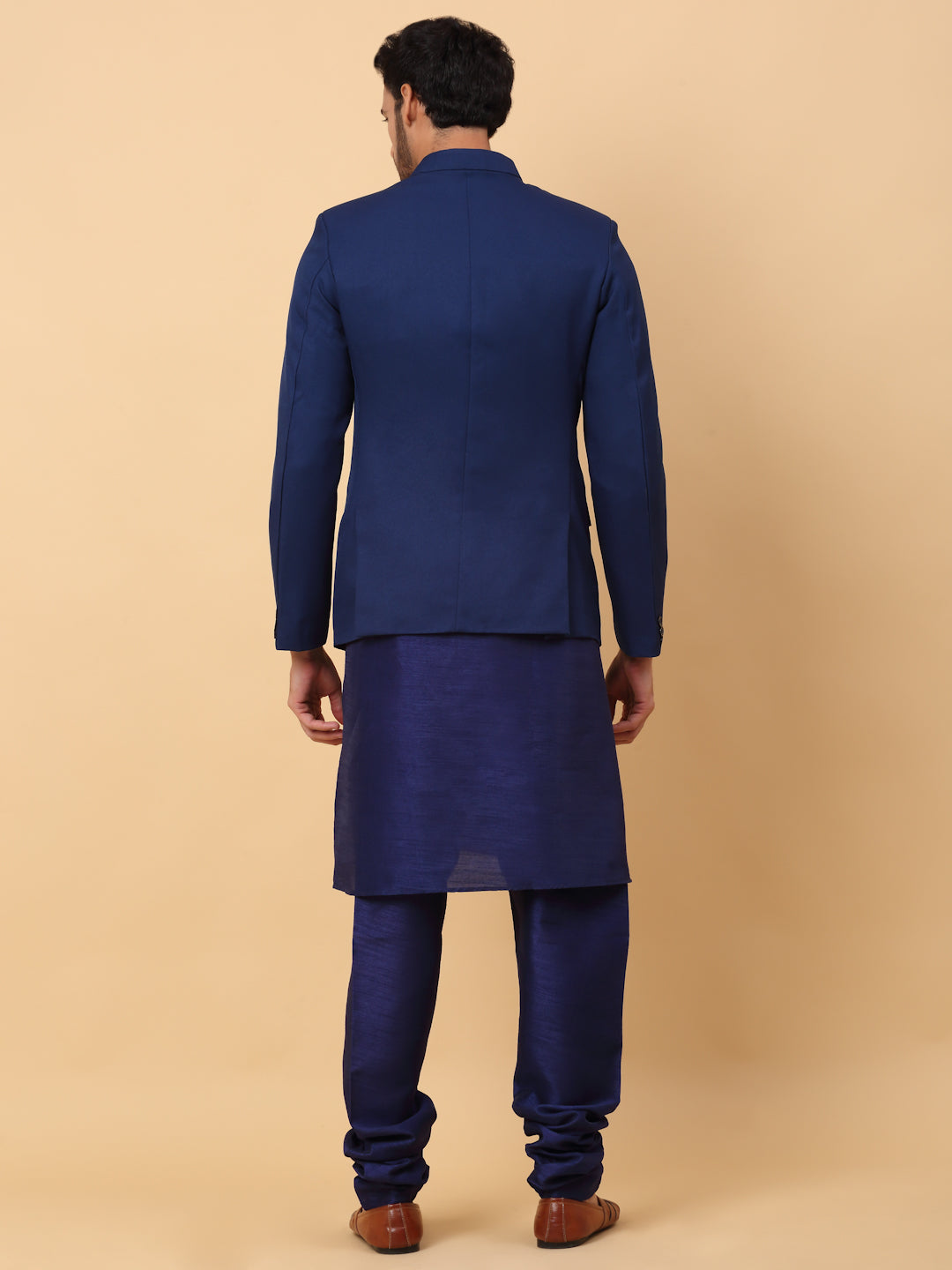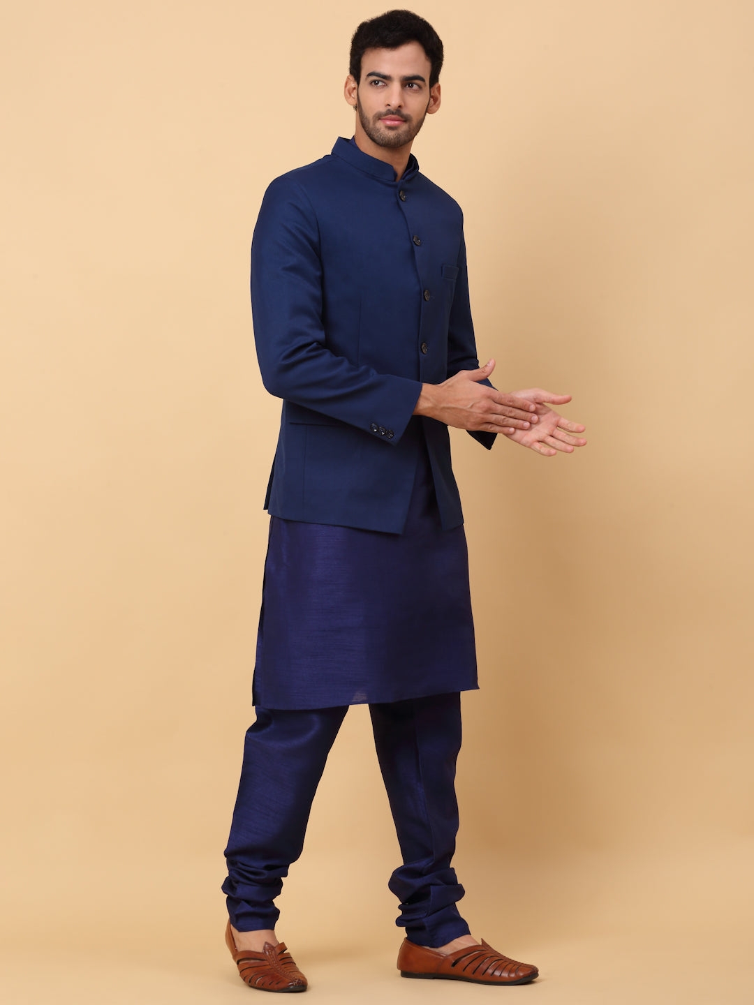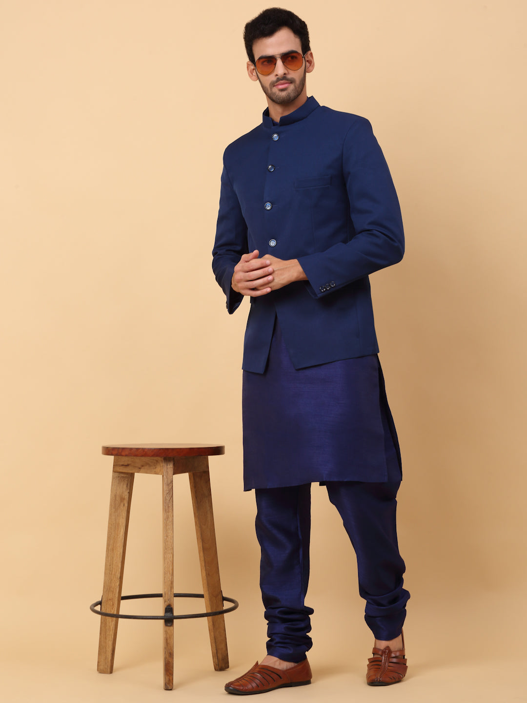 KRAFT INDIA Men's Silk Navy Blue Kurta Churidar With Solid Twill Bandhgala Suit/Coat