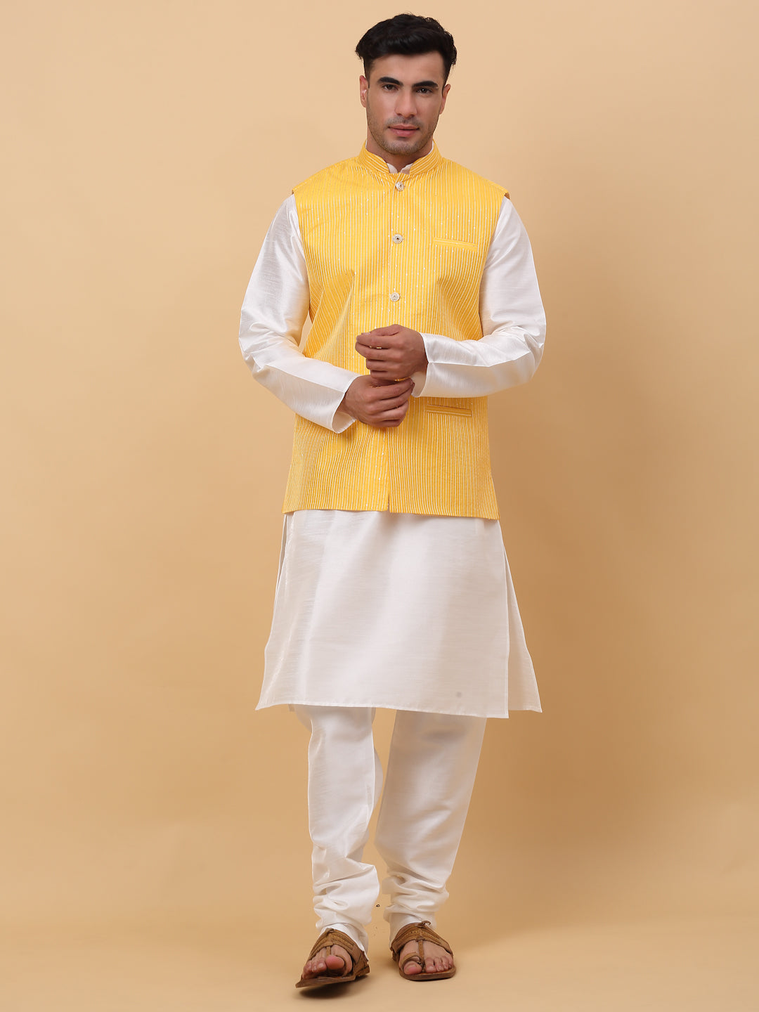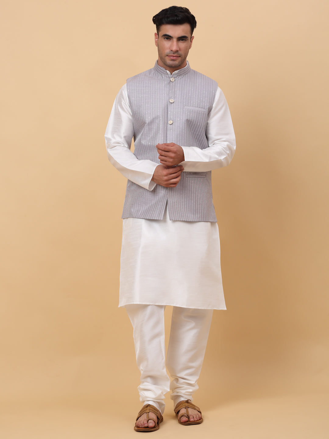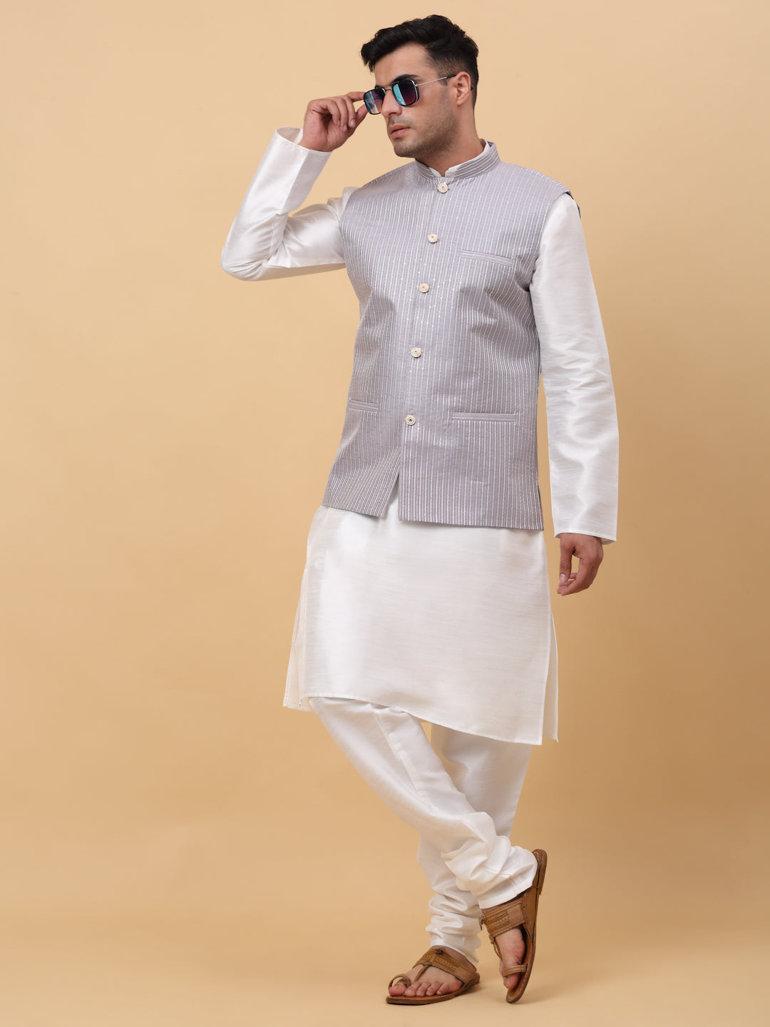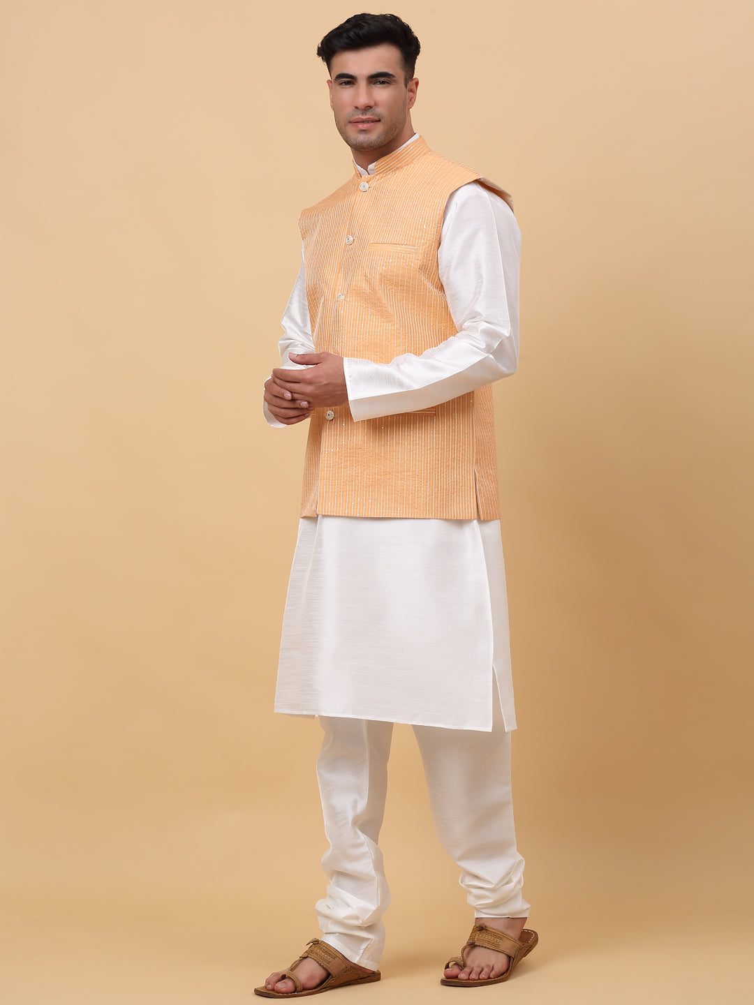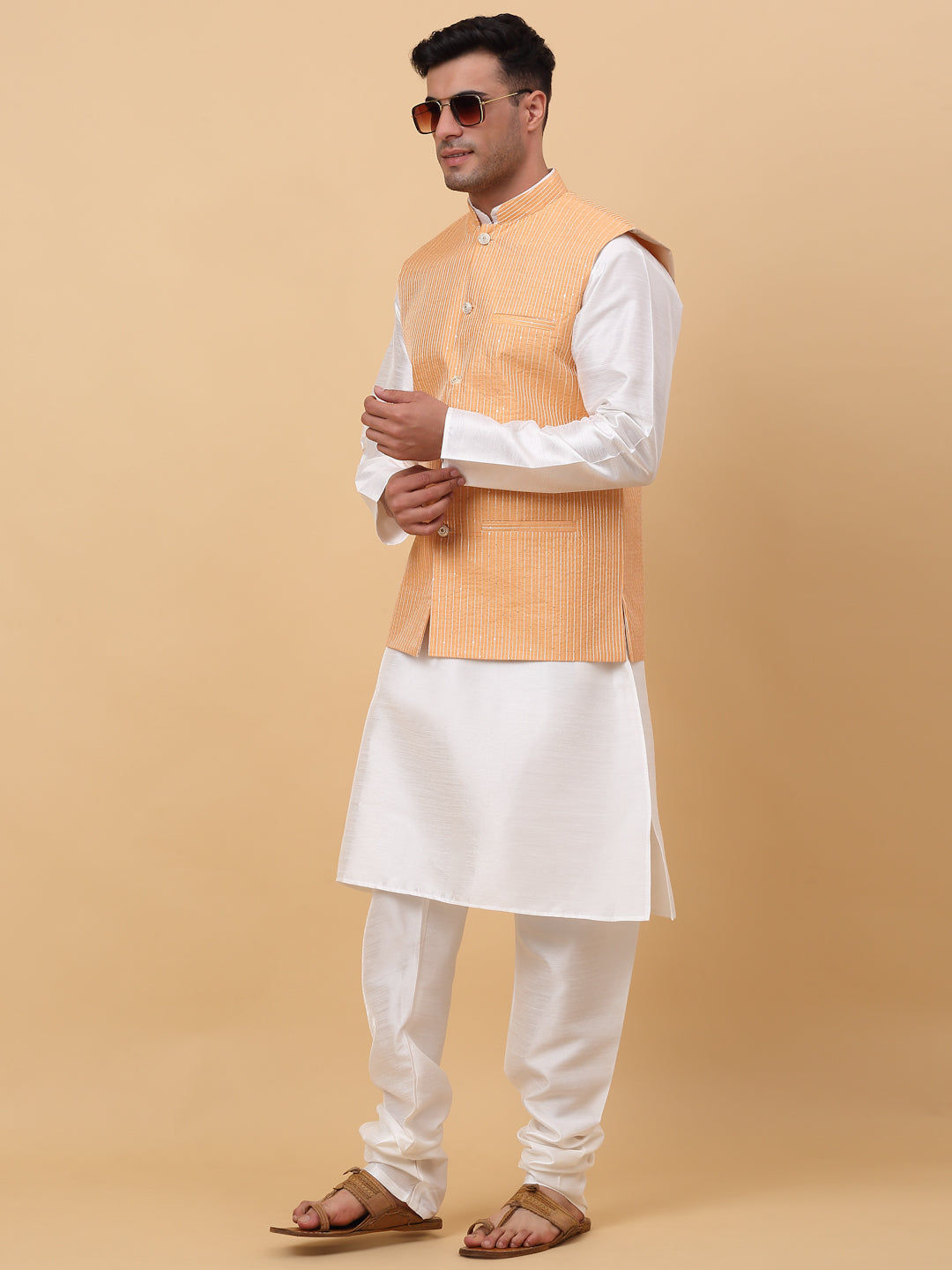 Men Cream Silk Blend Kurta, Churidar With SIlk Striped Nehru Jacket