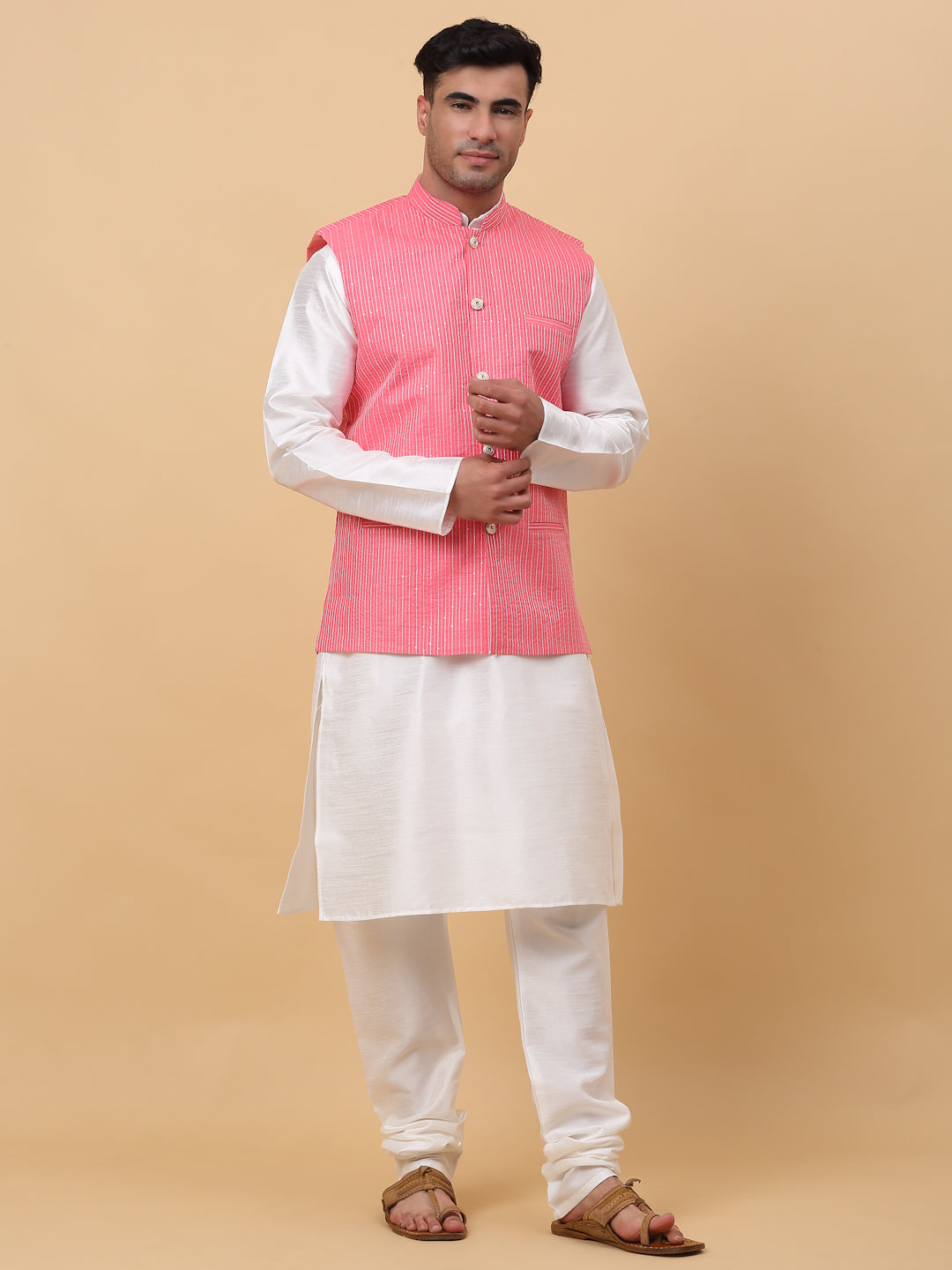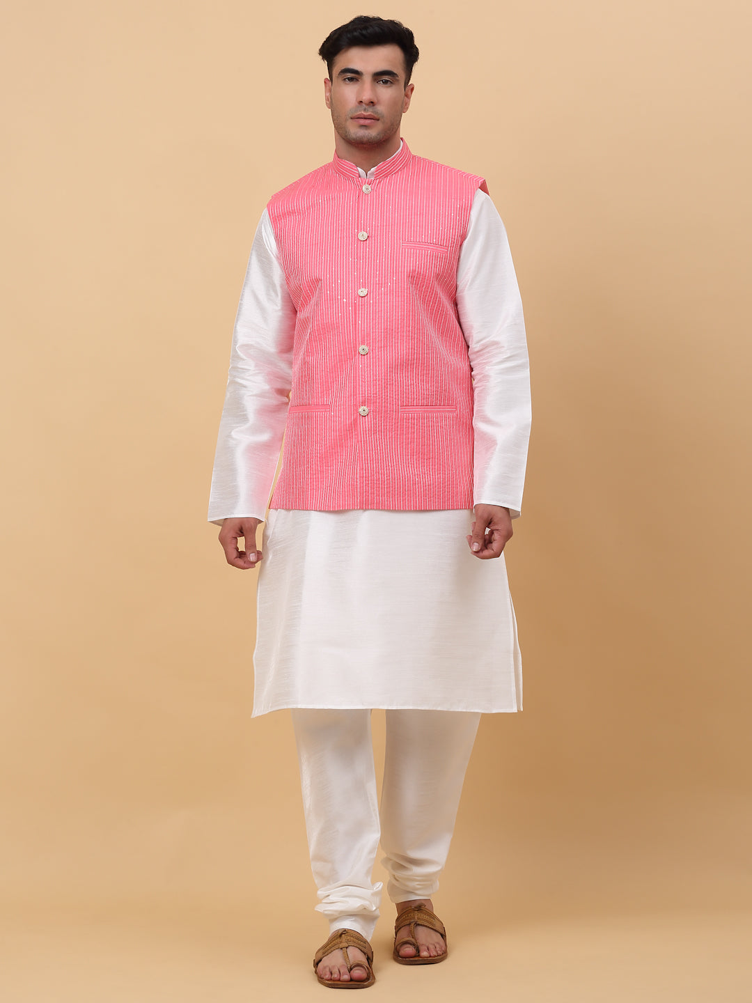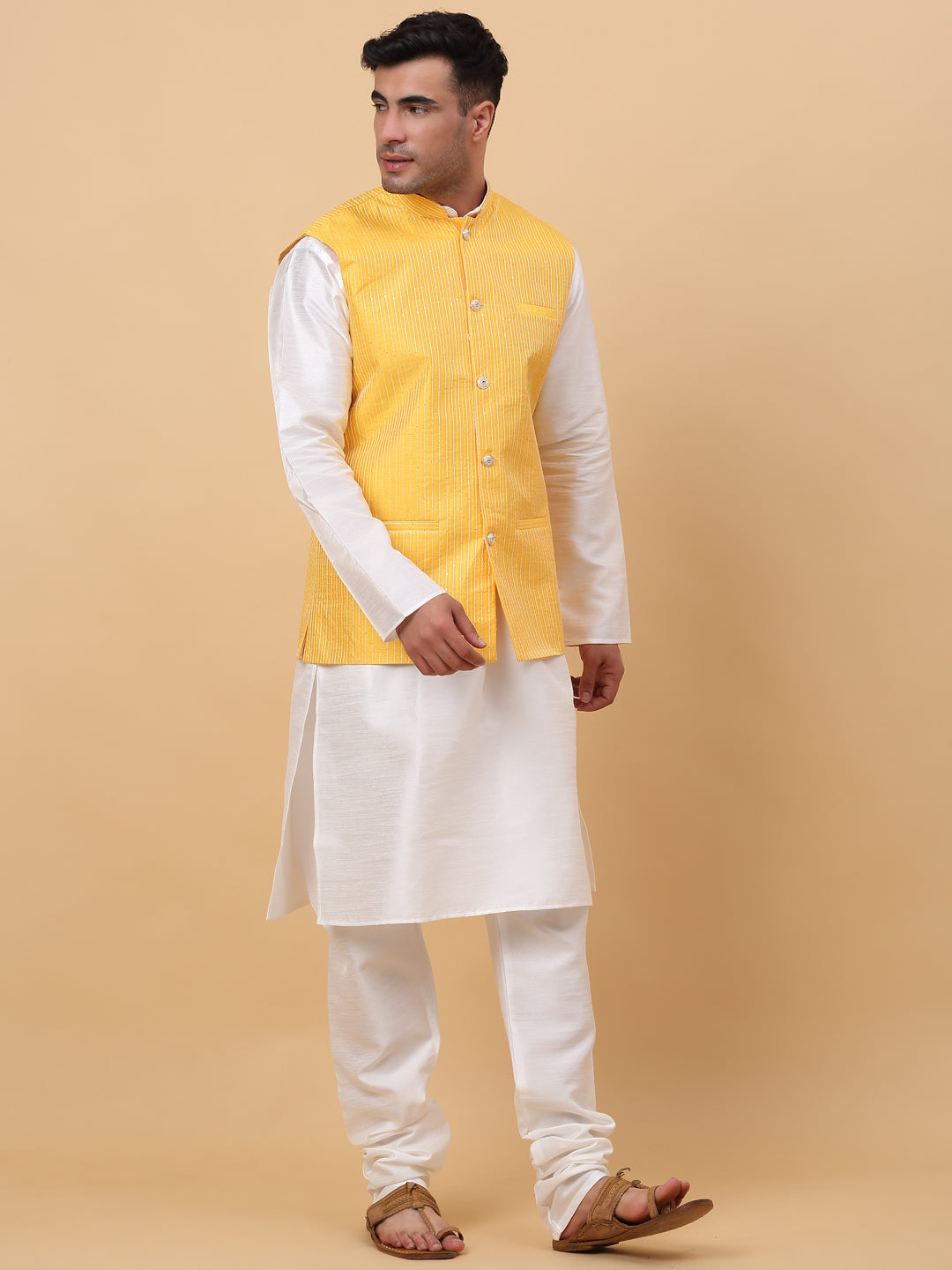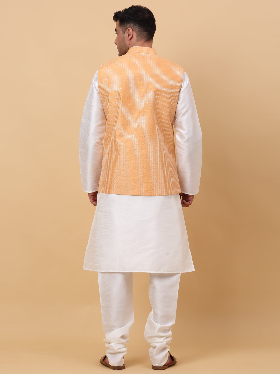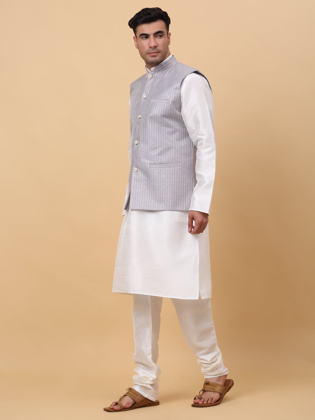 Men Cream Silk Blend Kurta, Churidar With SIlk Striped Nehru Jacket
