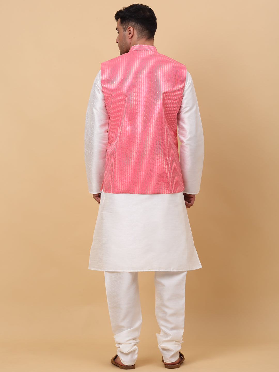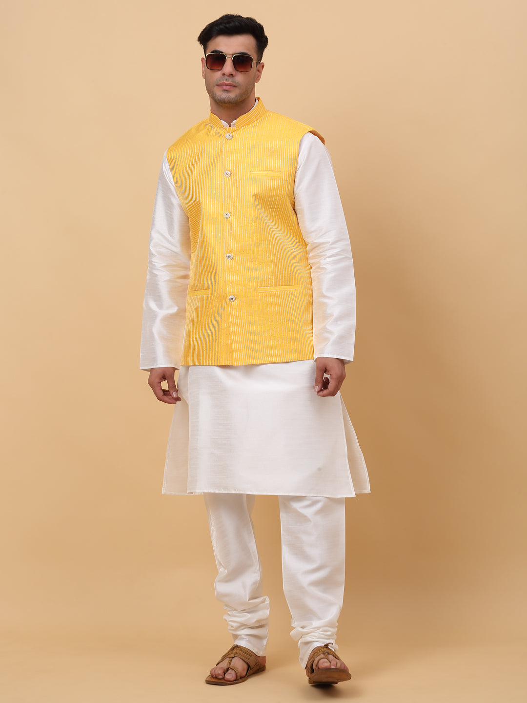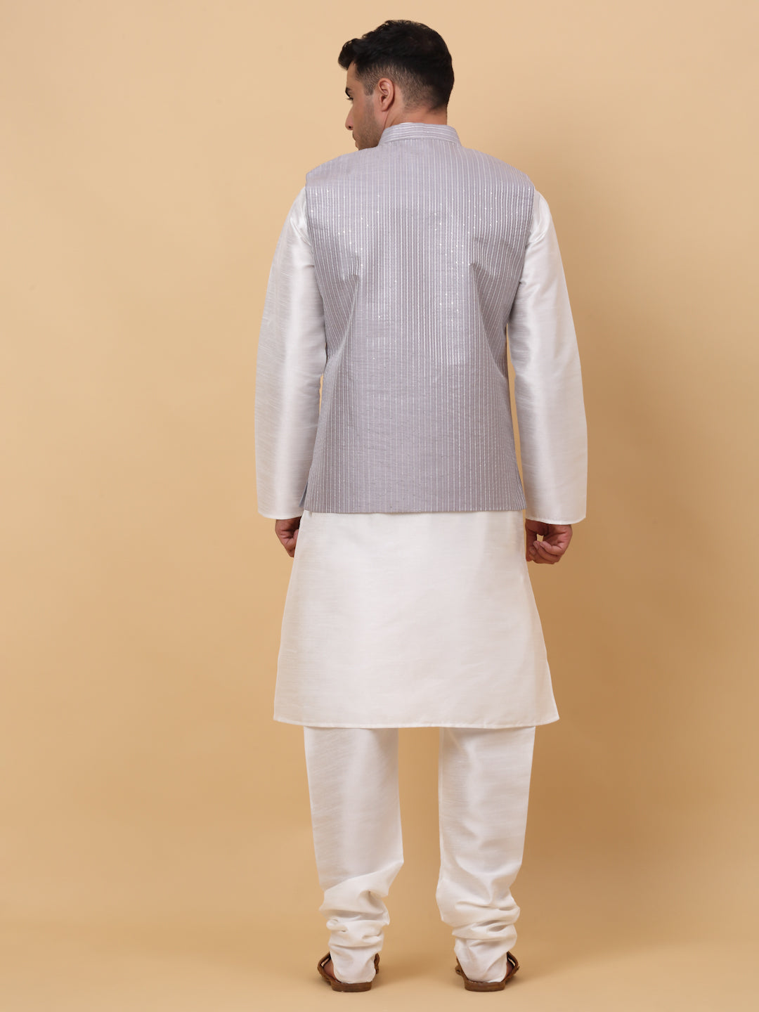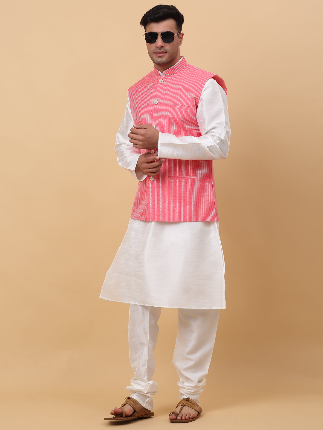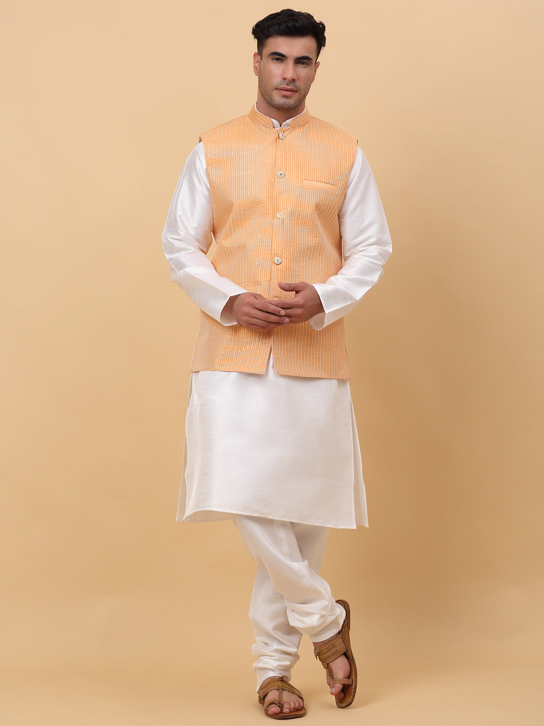 Men Cream Silk Blend Kurta, Churidar With SIlk Striped Nehru Jacket