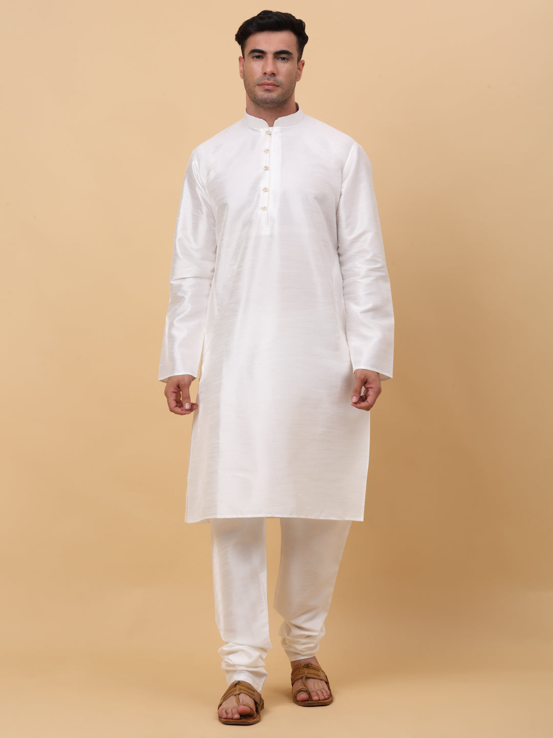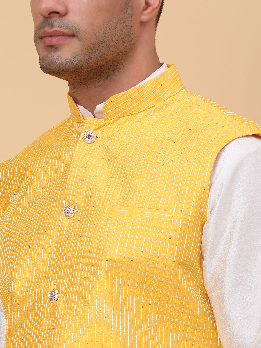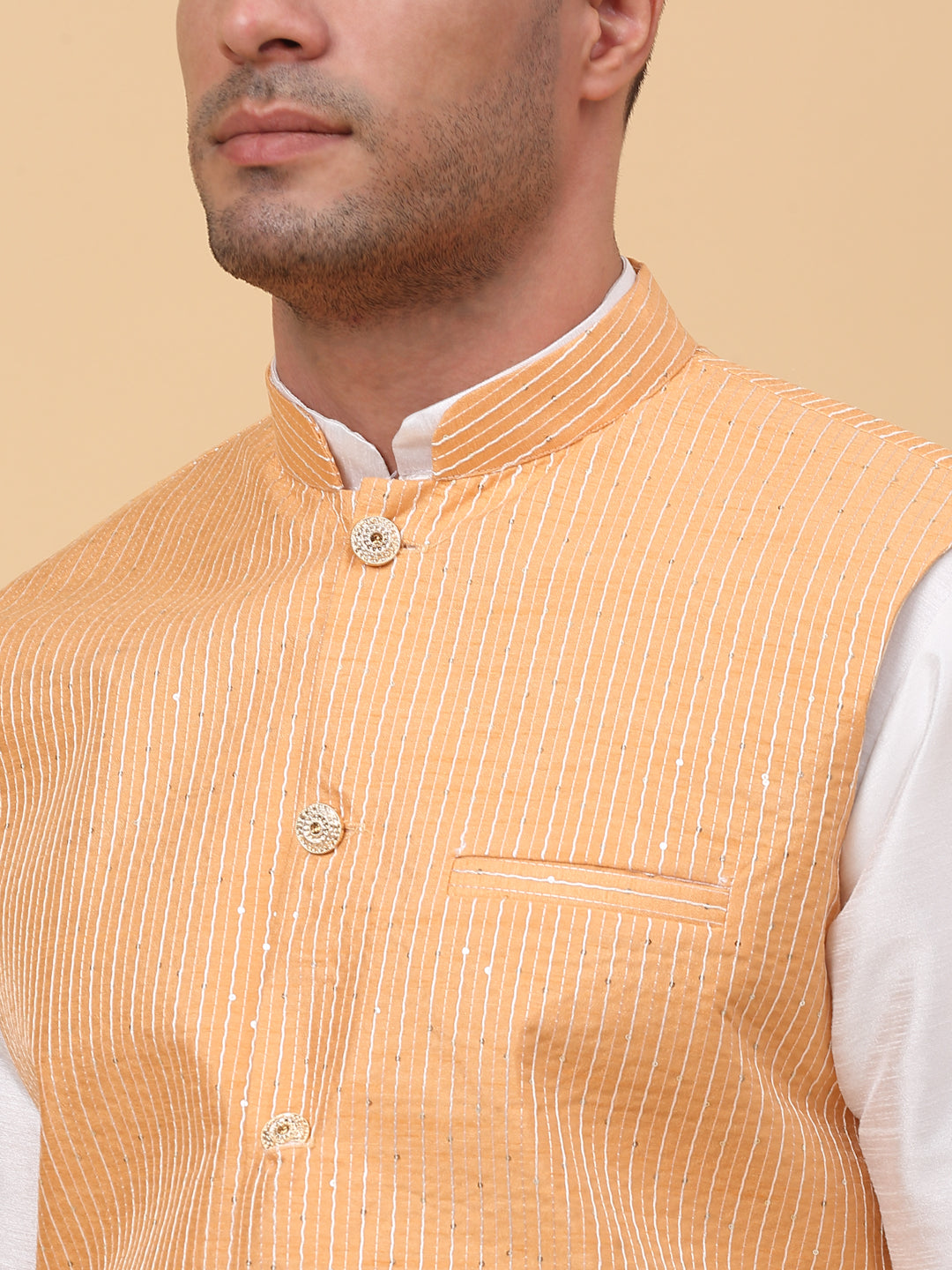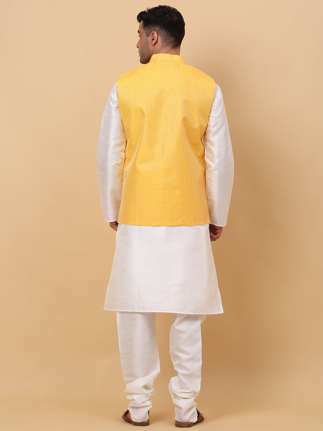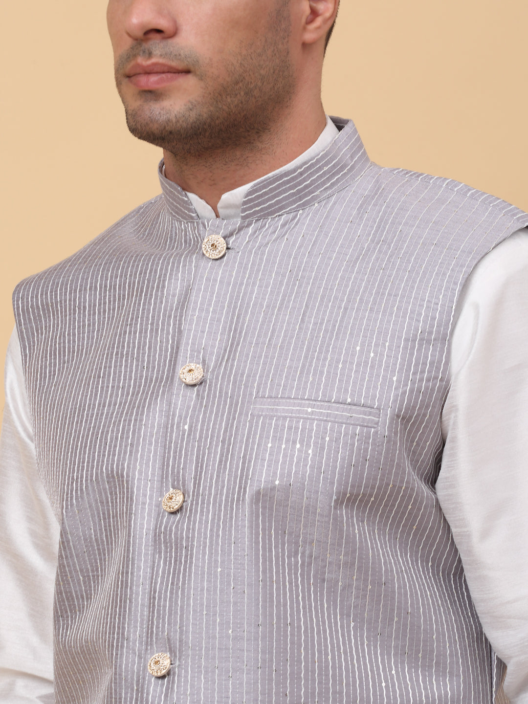 Men Cream Silk Blend Kurta, Churidar With SIlk Striped Nehru Jacket