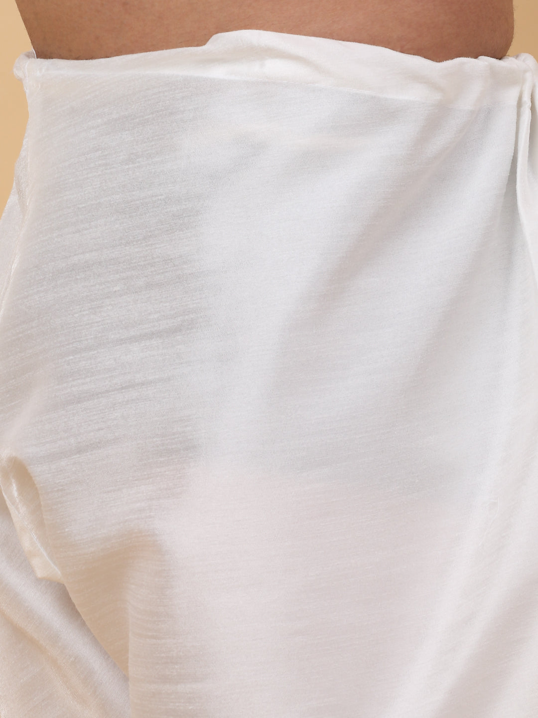Cream Solid Kurta & Churidar with Nehru jacket Cream solid straight knee length kurta has mandarin collar, long sleeves, side pockets, straight hem, loopi button closure, side slits, with drawstring closure Cream churidar Striped Nehru jacket, has a mandarin collar, sleeveless, button closure, three pockets, an attached lining