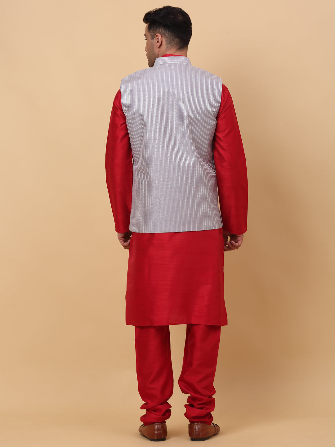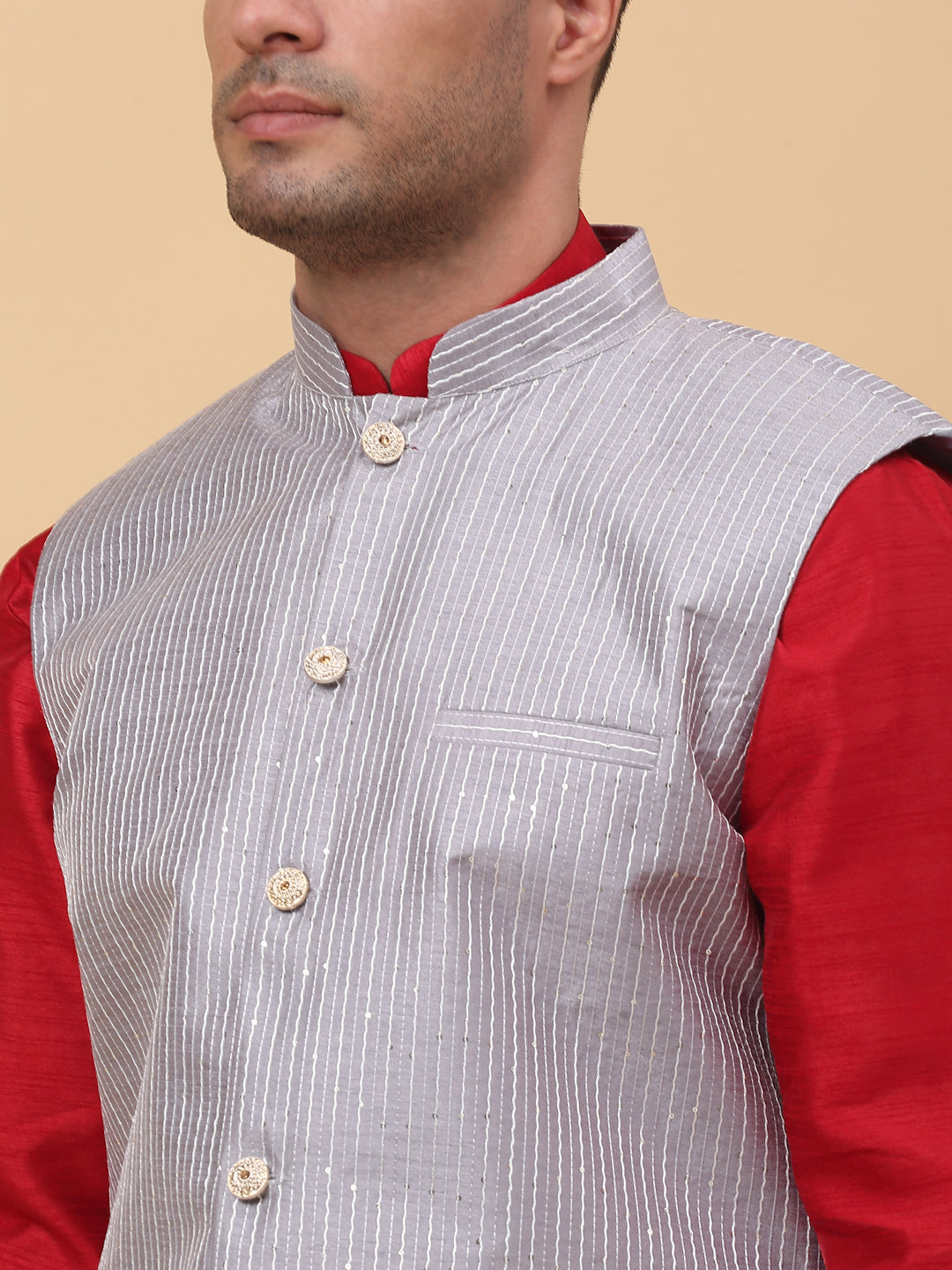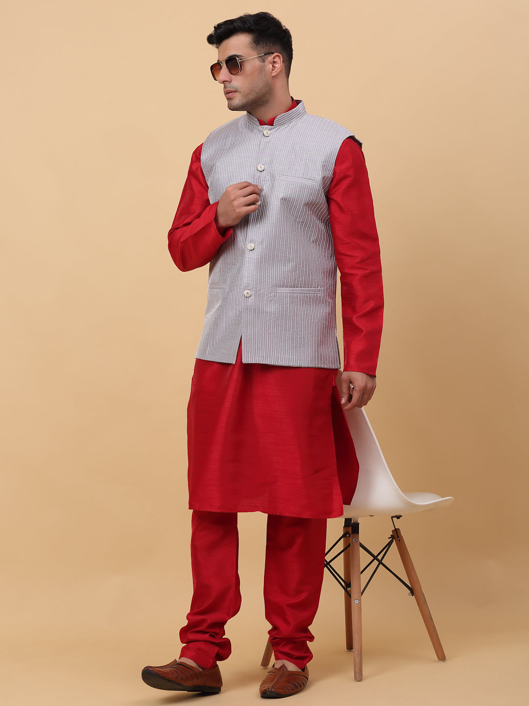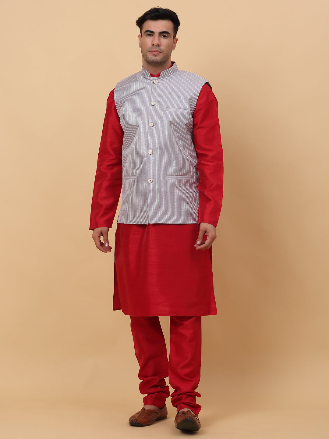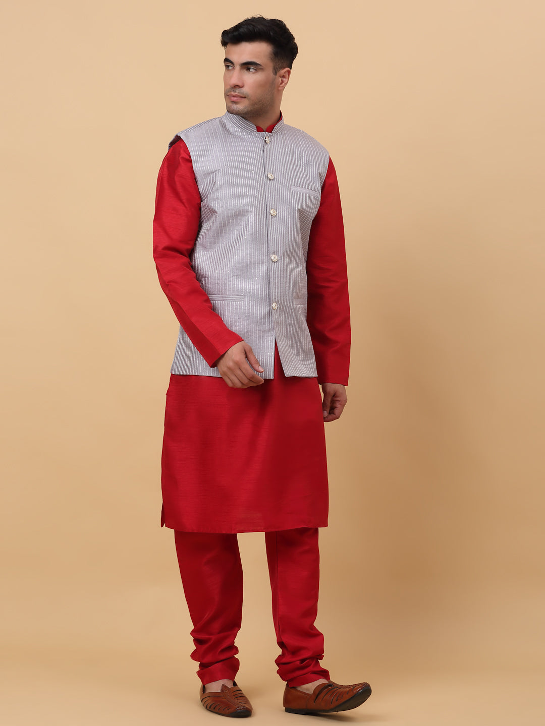 Men Maroon Silk Blend Kurta, Churidar With Grey SIlk Striped Nehru Jacket