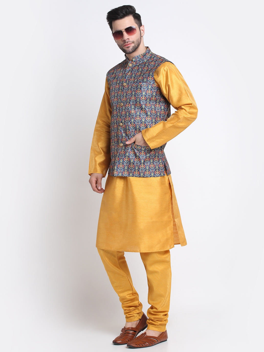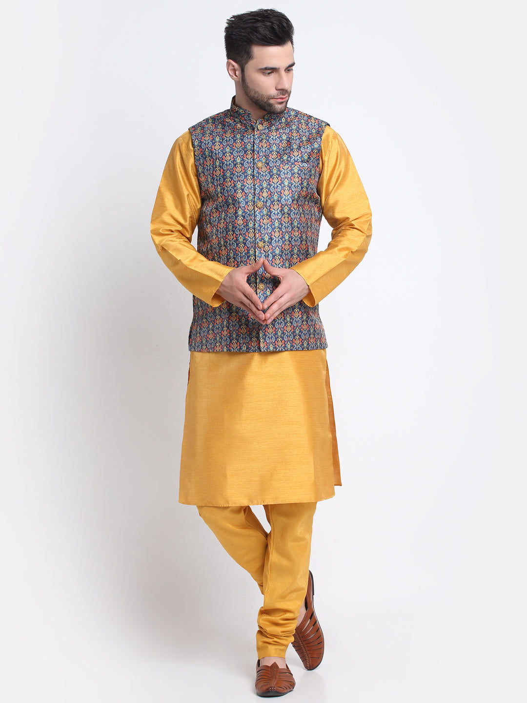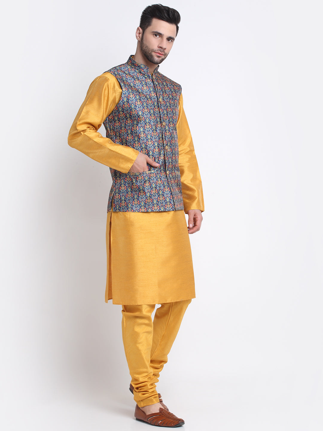 KRAFT INDIA Men Mustard Silk Kurta Churidar With Blue Printed Nehru Jacket
