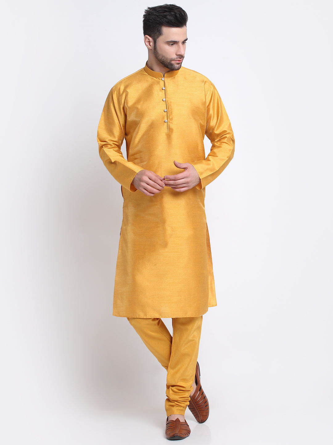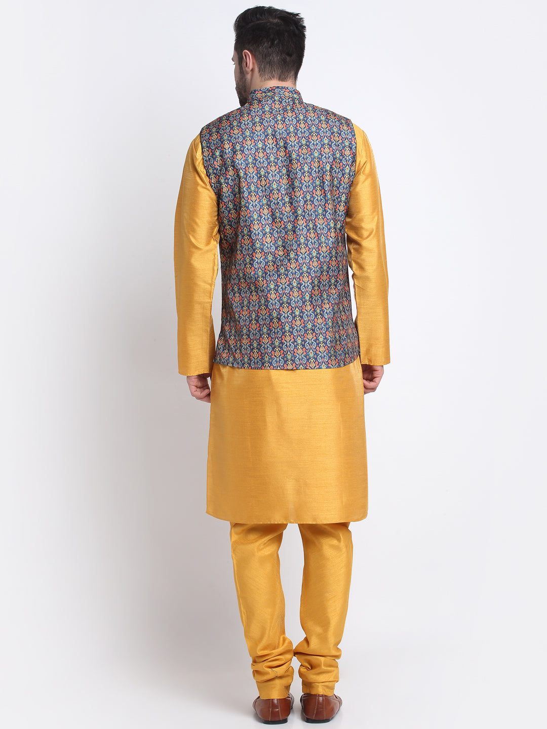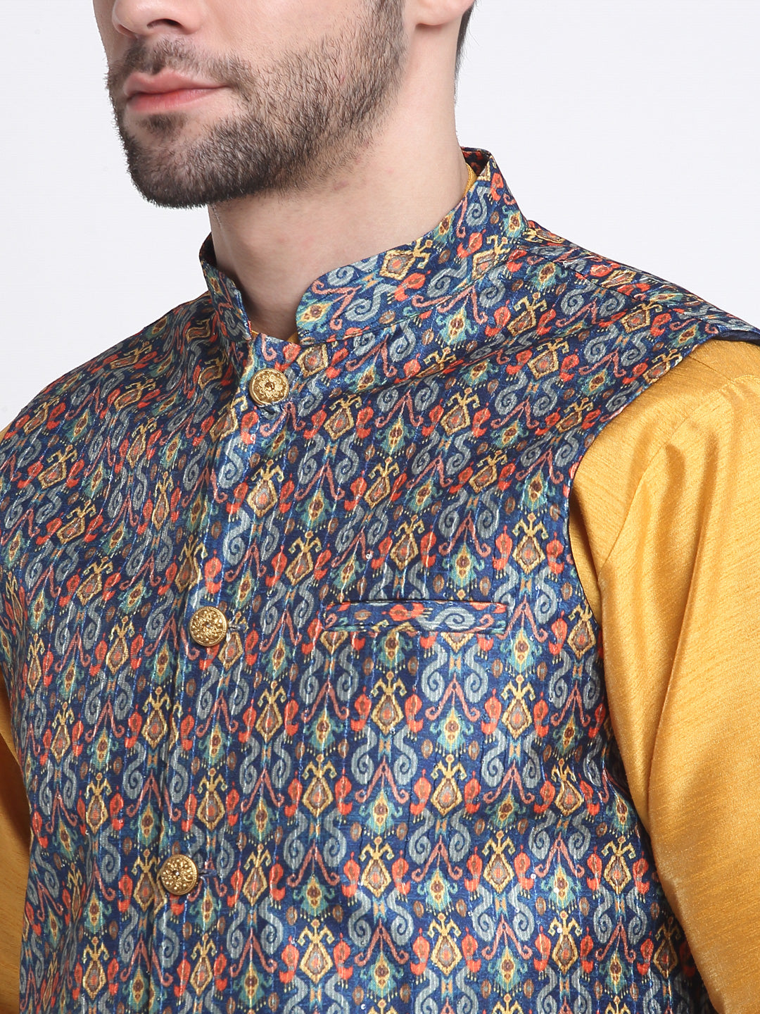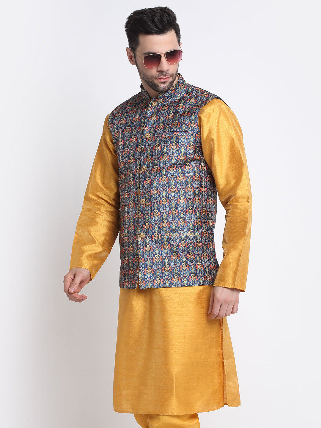 KRAFT INDIA Men Mustard Silk Kurta Churidar With Blue Printed Nehru Jacket