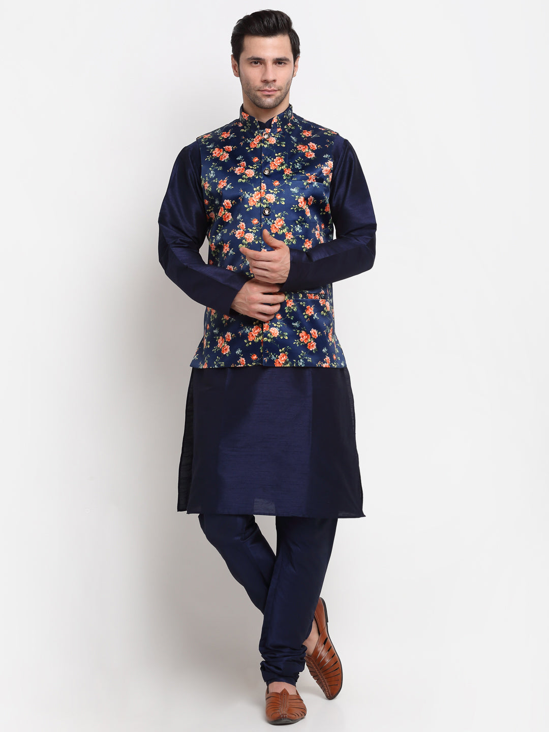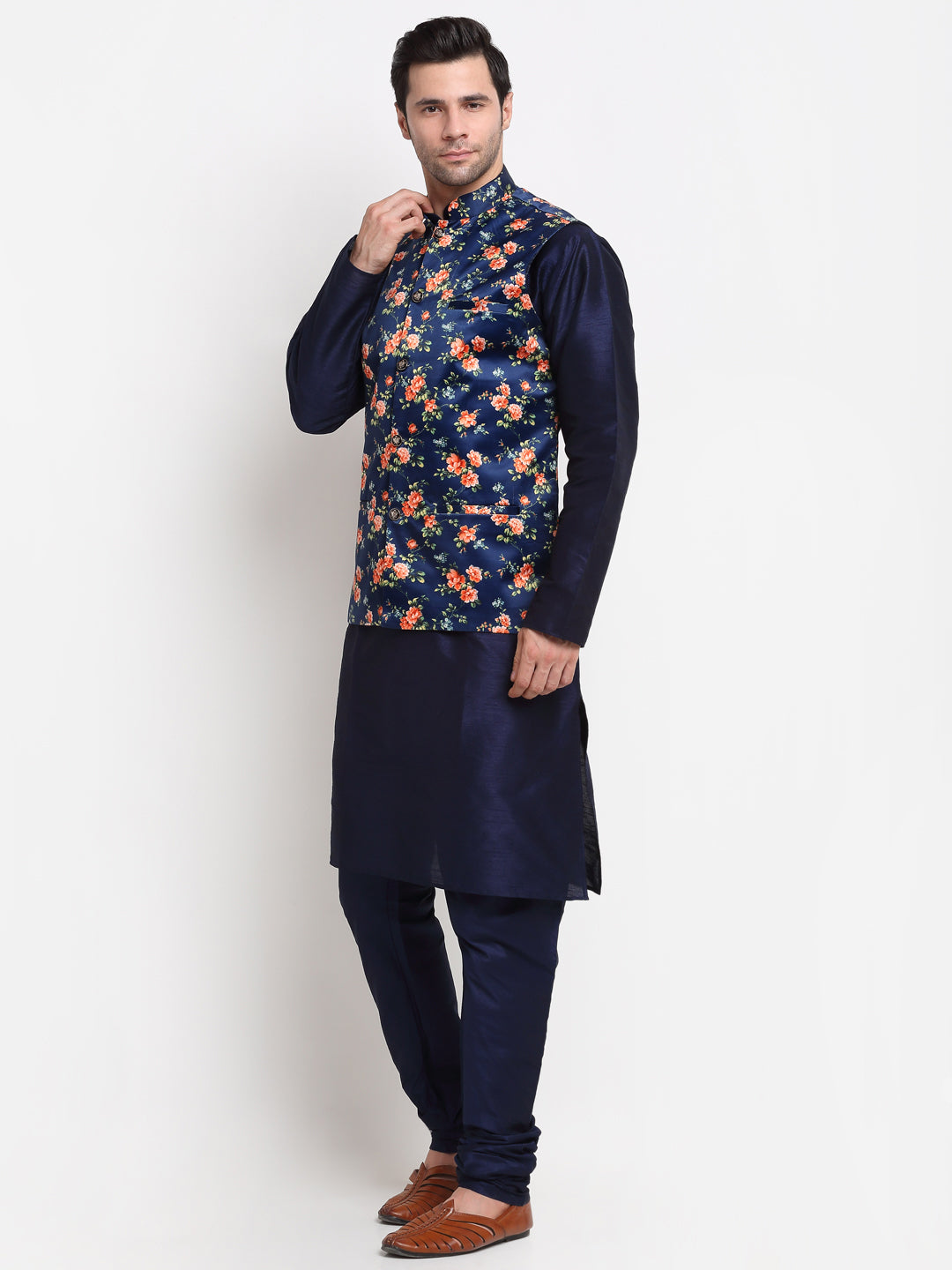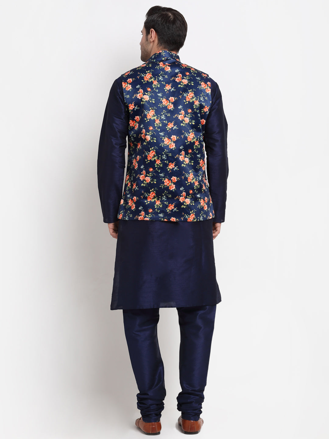 KRAFT INDIA Men Navy Blue Kurta Churidar With Navy Blue Floral Print Satin Nehru Jacket