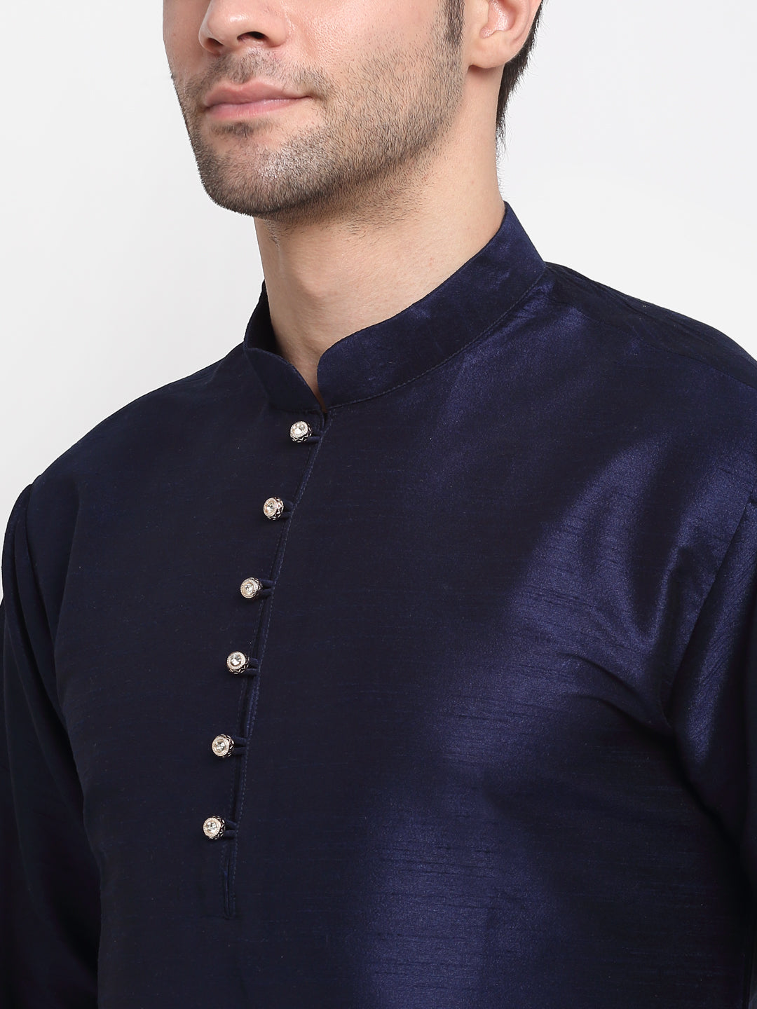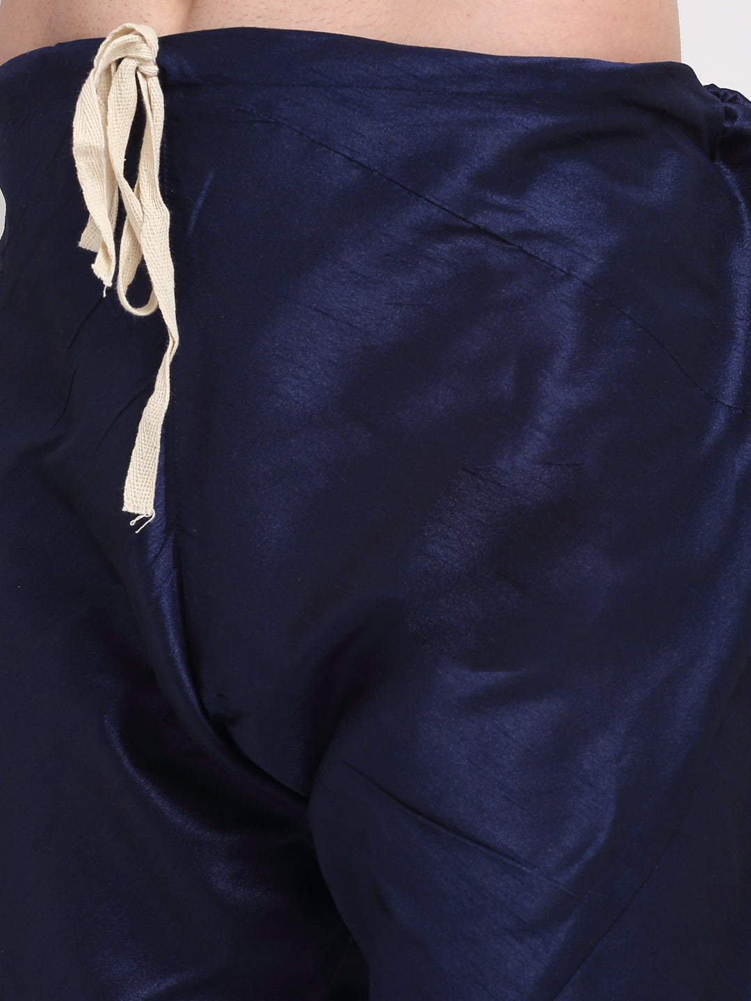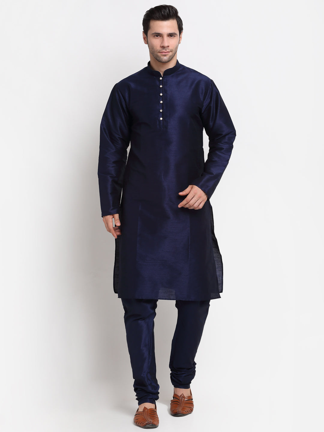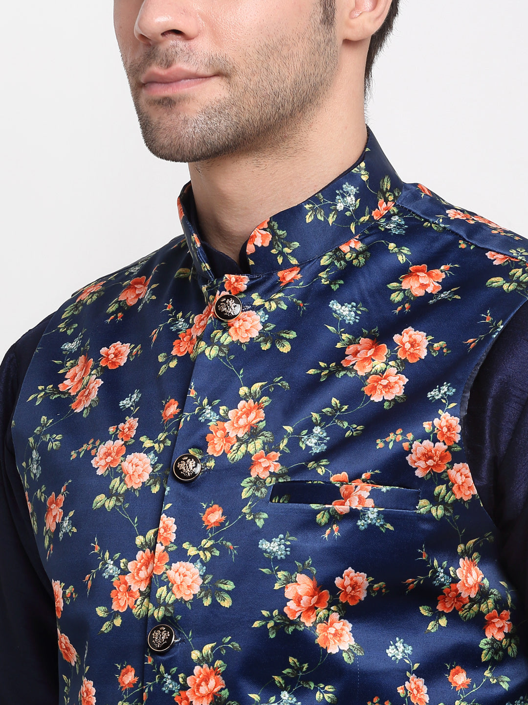 KRAFT INDIA Men Navy Blue Kurta Churidar With Navy Blue Floral Print Satin Nehru Jacket