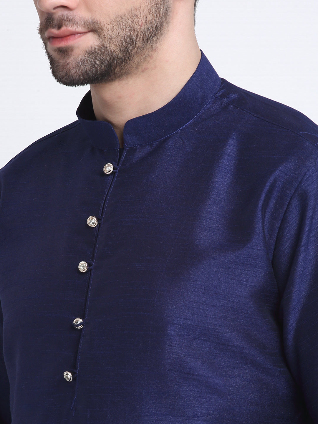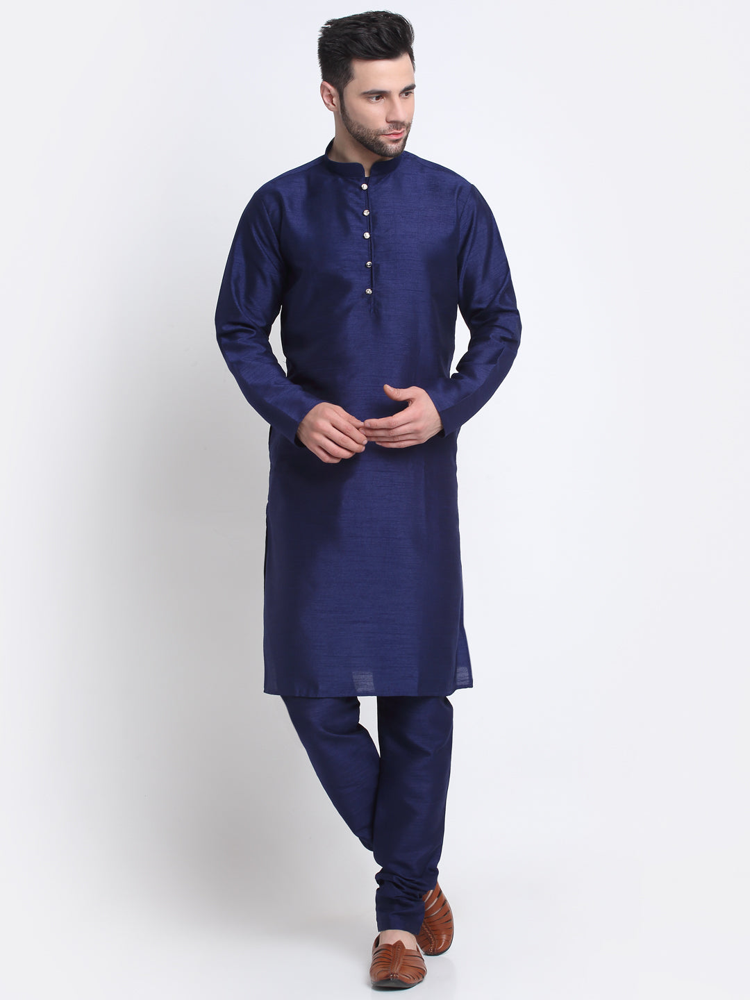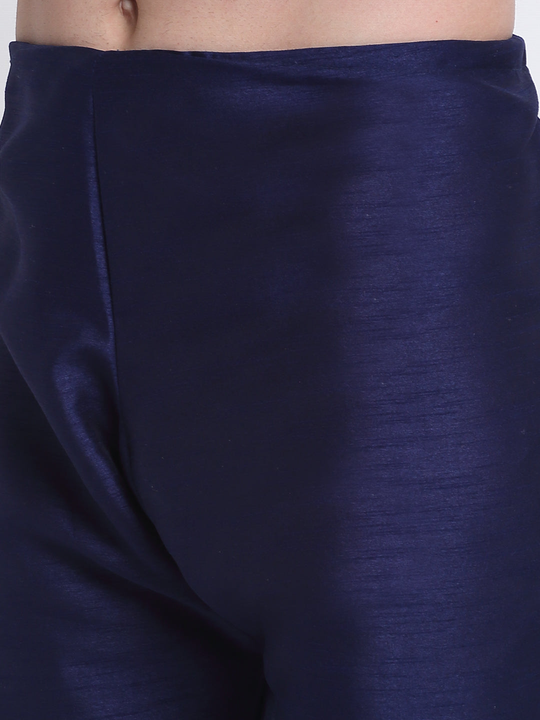Navy Blue Solid Silk Kurta & Churidar with Blue Nehru jacket Navy Blue solid straight knee length kurta has mandarin collar, long sleeves, side pockets, straight hem, loopi button closure, side slits, with drawstring closure Navy Blue churidar Blue Tussar Silk Printed Nehru jacket, has a mandarin collar, sleeveless, button closure, three pockets, an attached lining