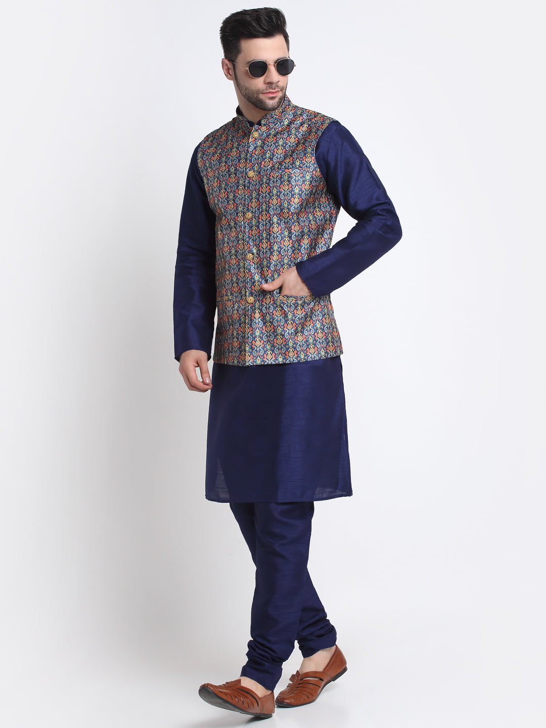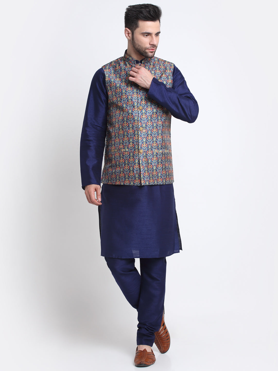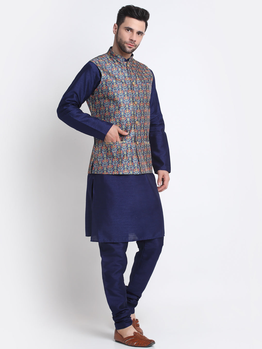 KRAFT INDIA Men Navy Blue Silk Kurta Churidar With Blue Printed Nehru Jacket