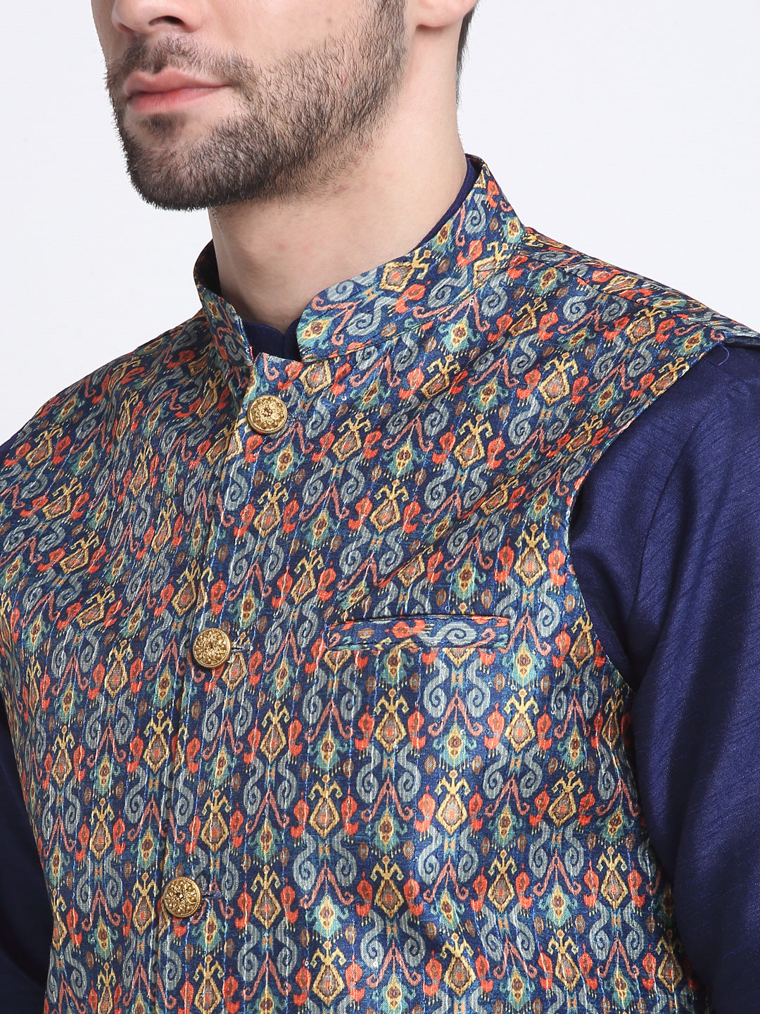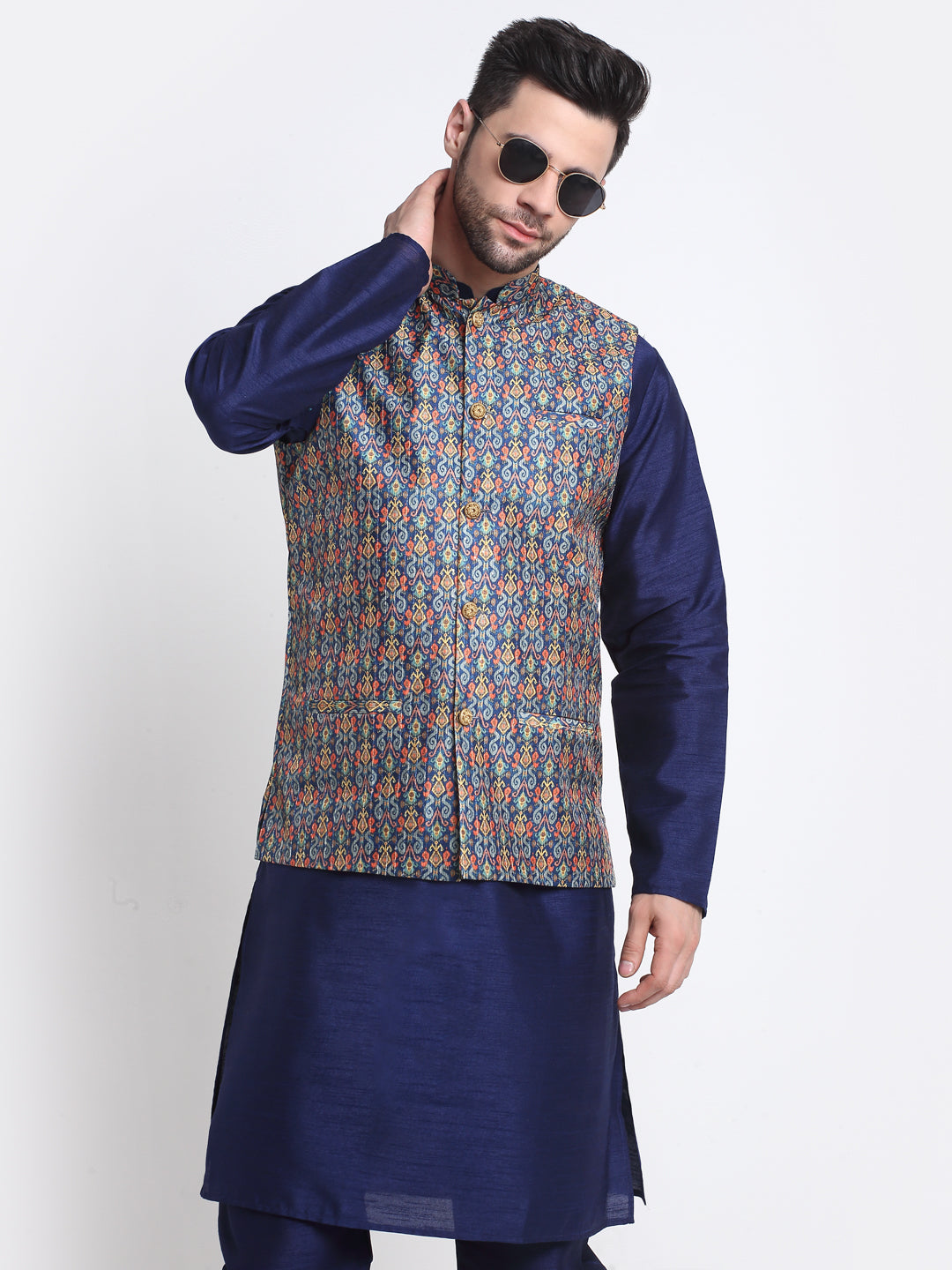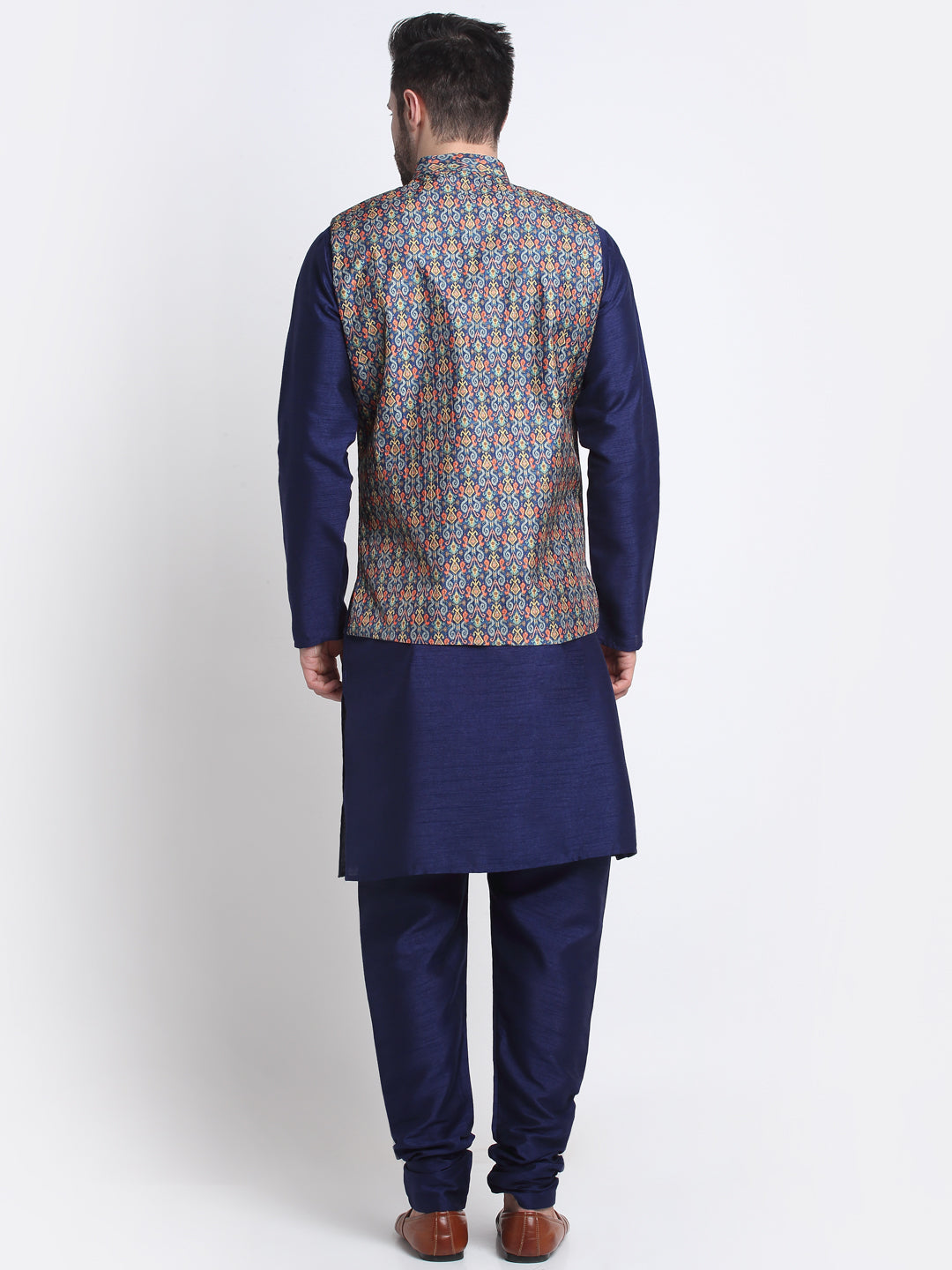 KRAFT INDIA Men Navy Blue Silk Kurta Churidar With Blue Printed Nehru Jacket