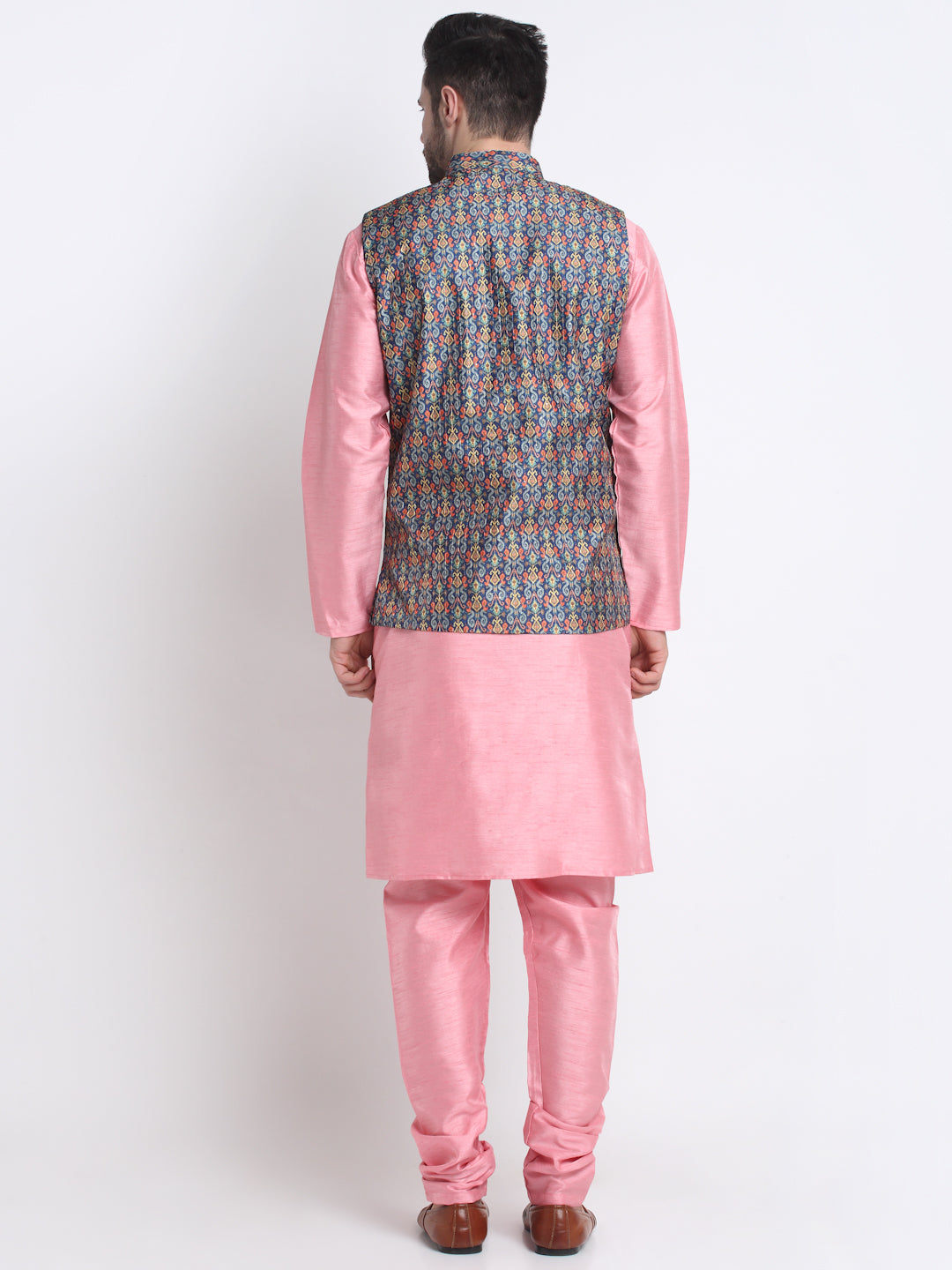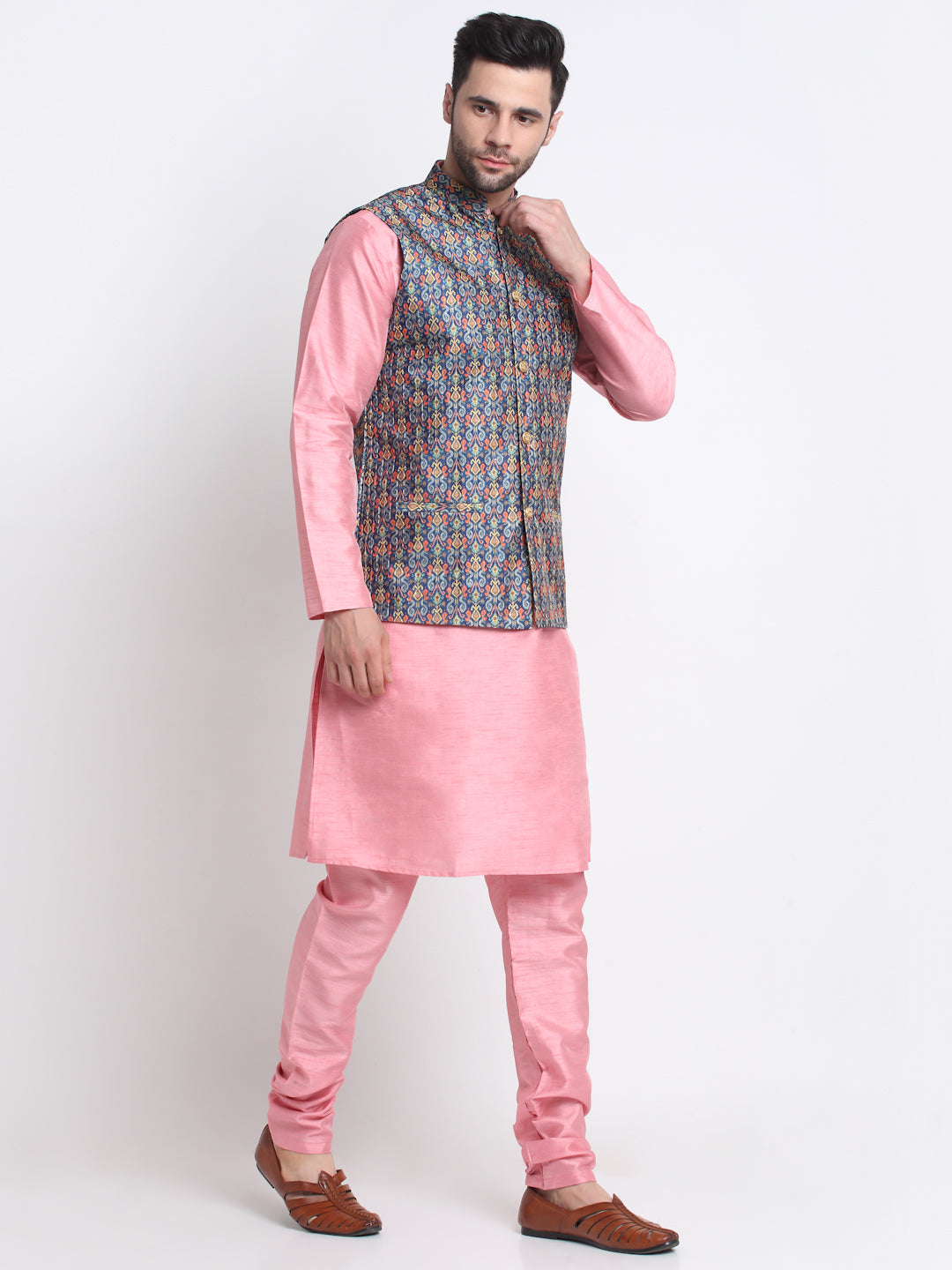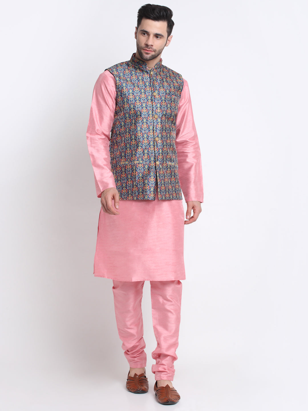 KRAFT INDIA Men Pink Silk Kurta Churidar With Blue Printed Nehru Jacket