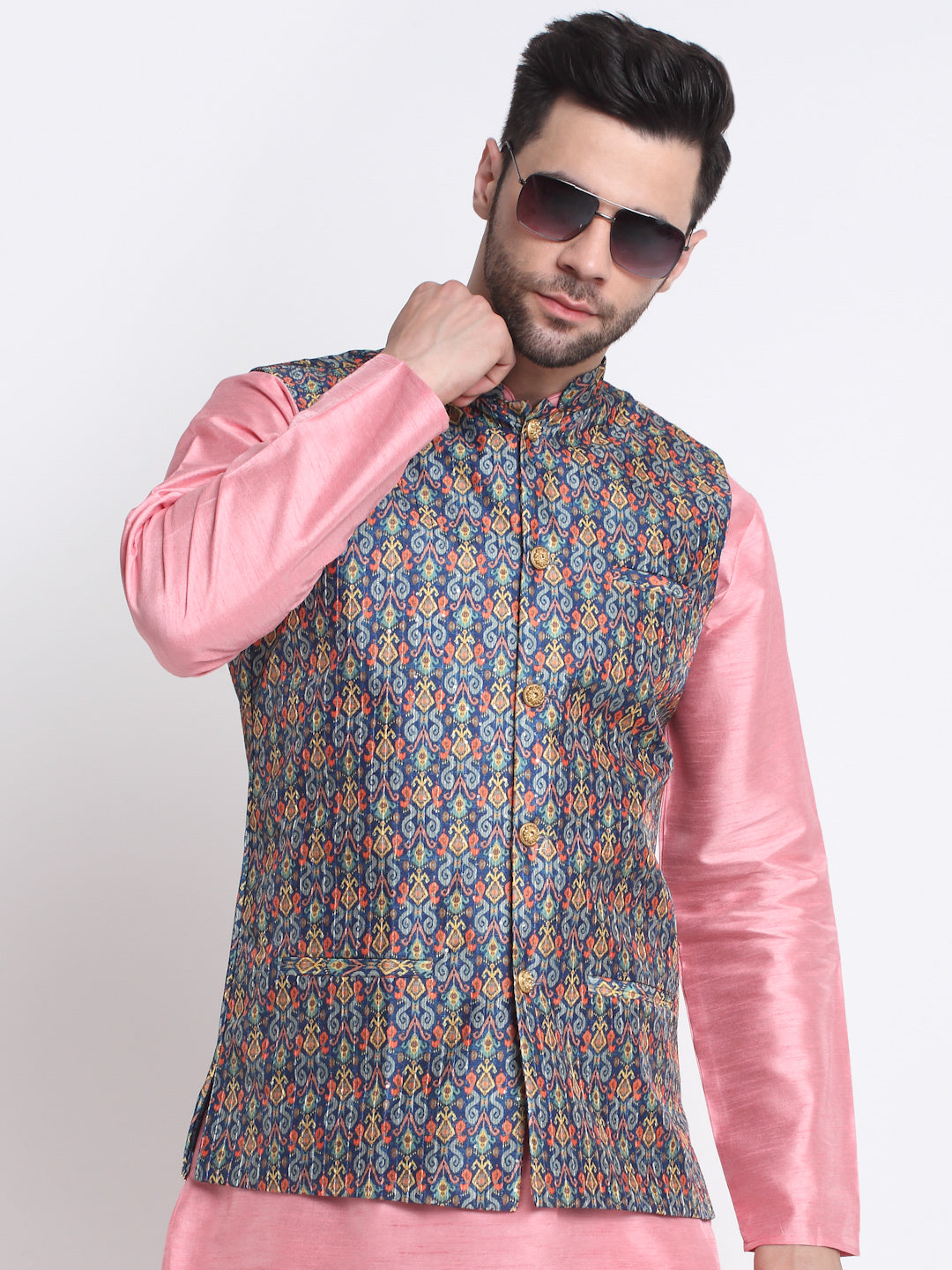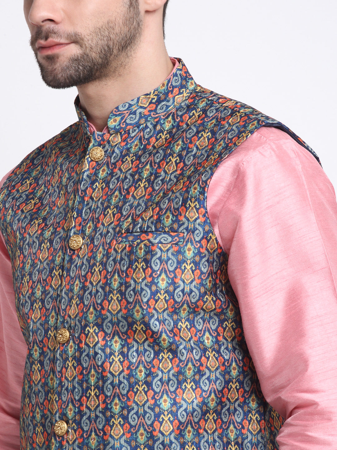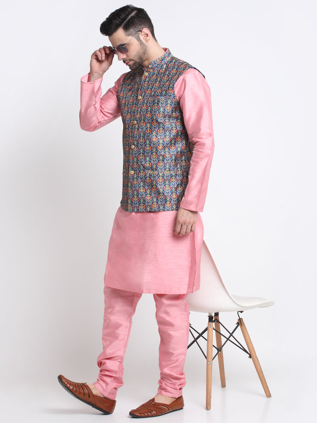 KRAFT INDIA Men Pink Silk Kurta Churidar With Blue Printed Nehru Jacket