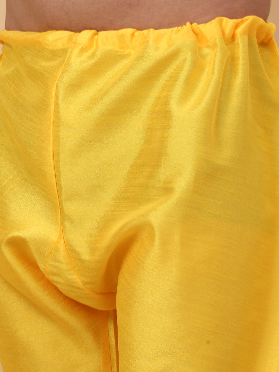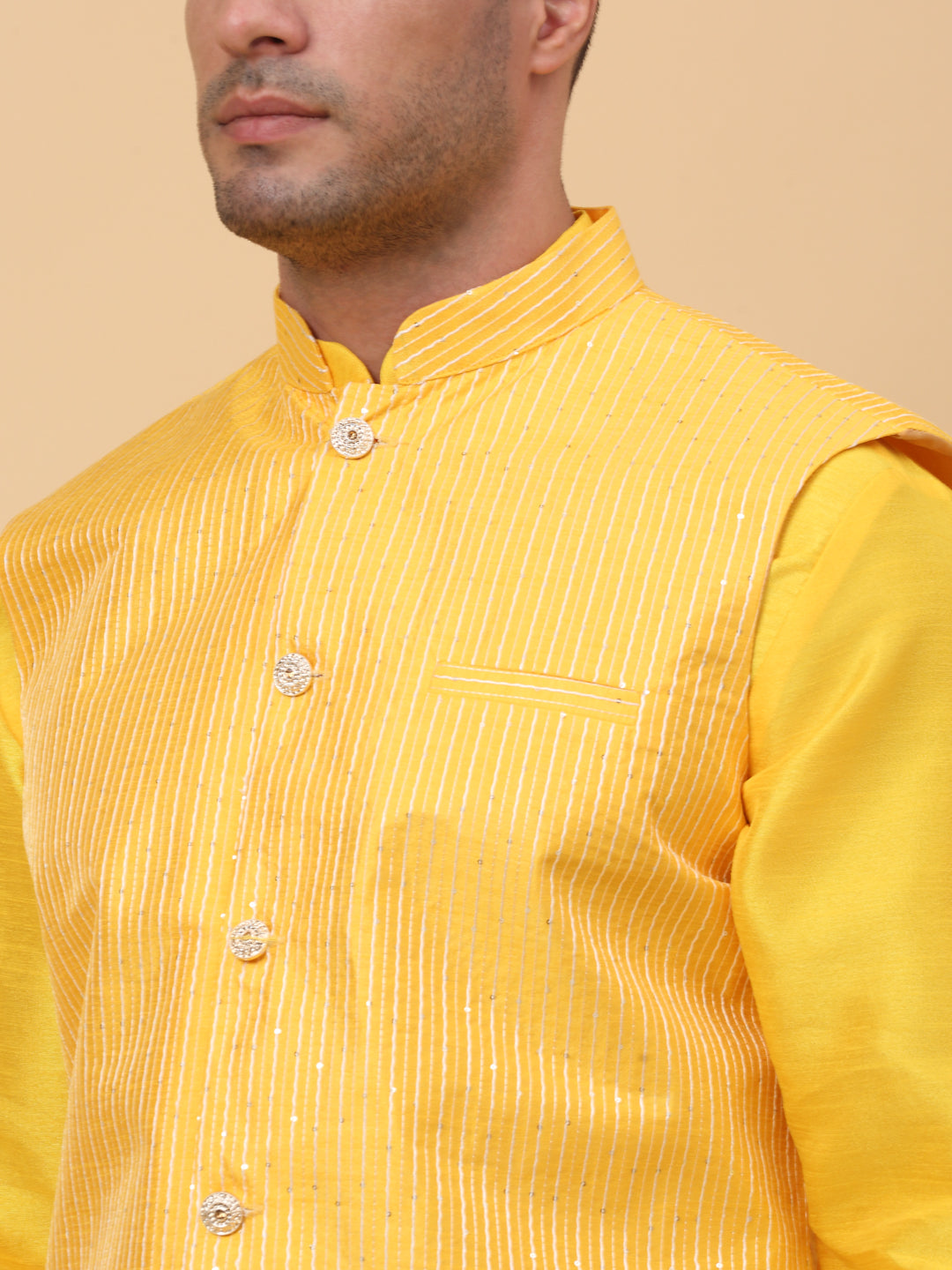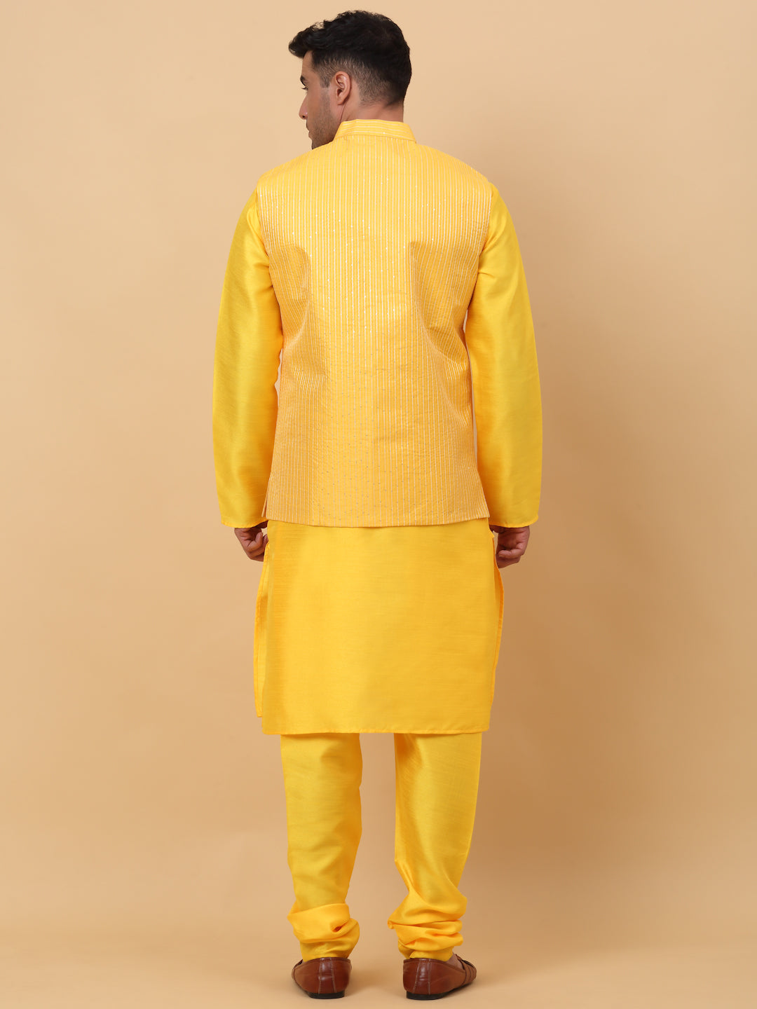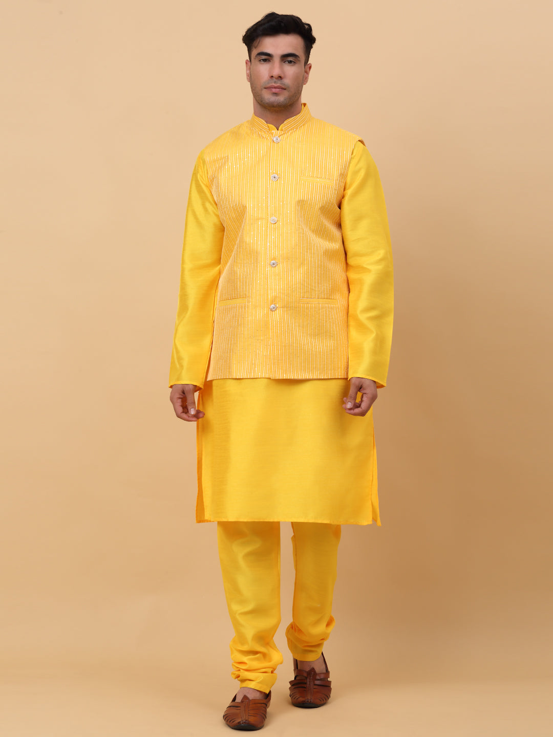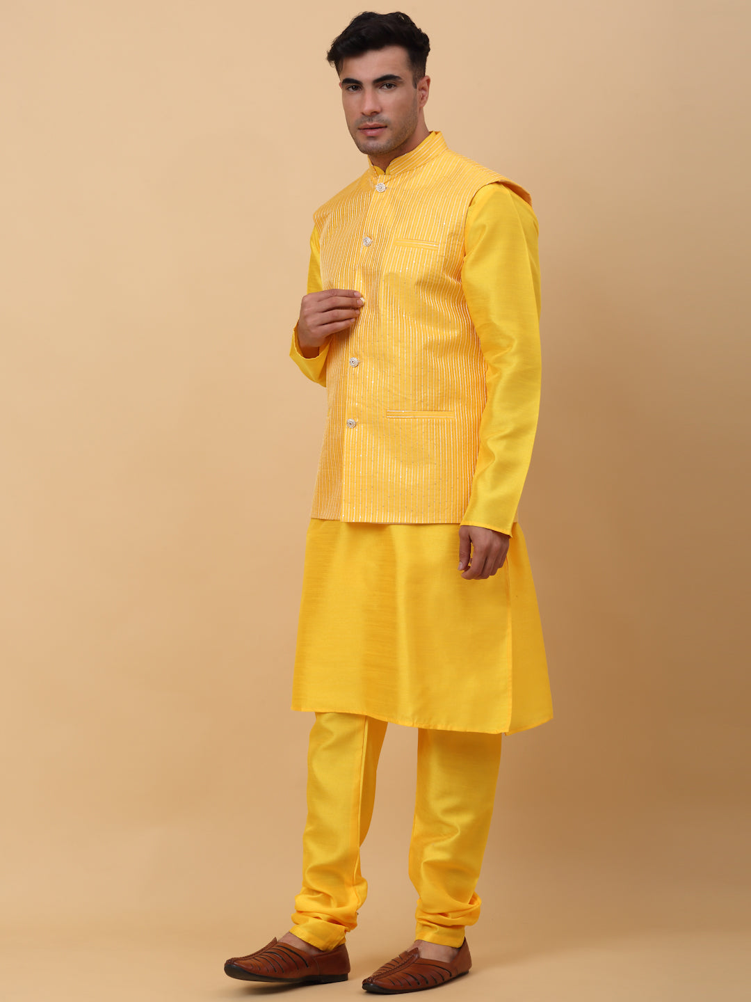 Men Yellow Silk Blend Kurta, Churidar With Yellow SIlk Striped Nehru Jacket