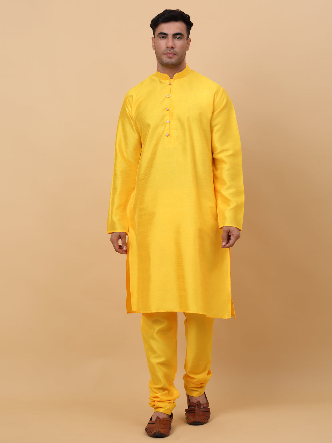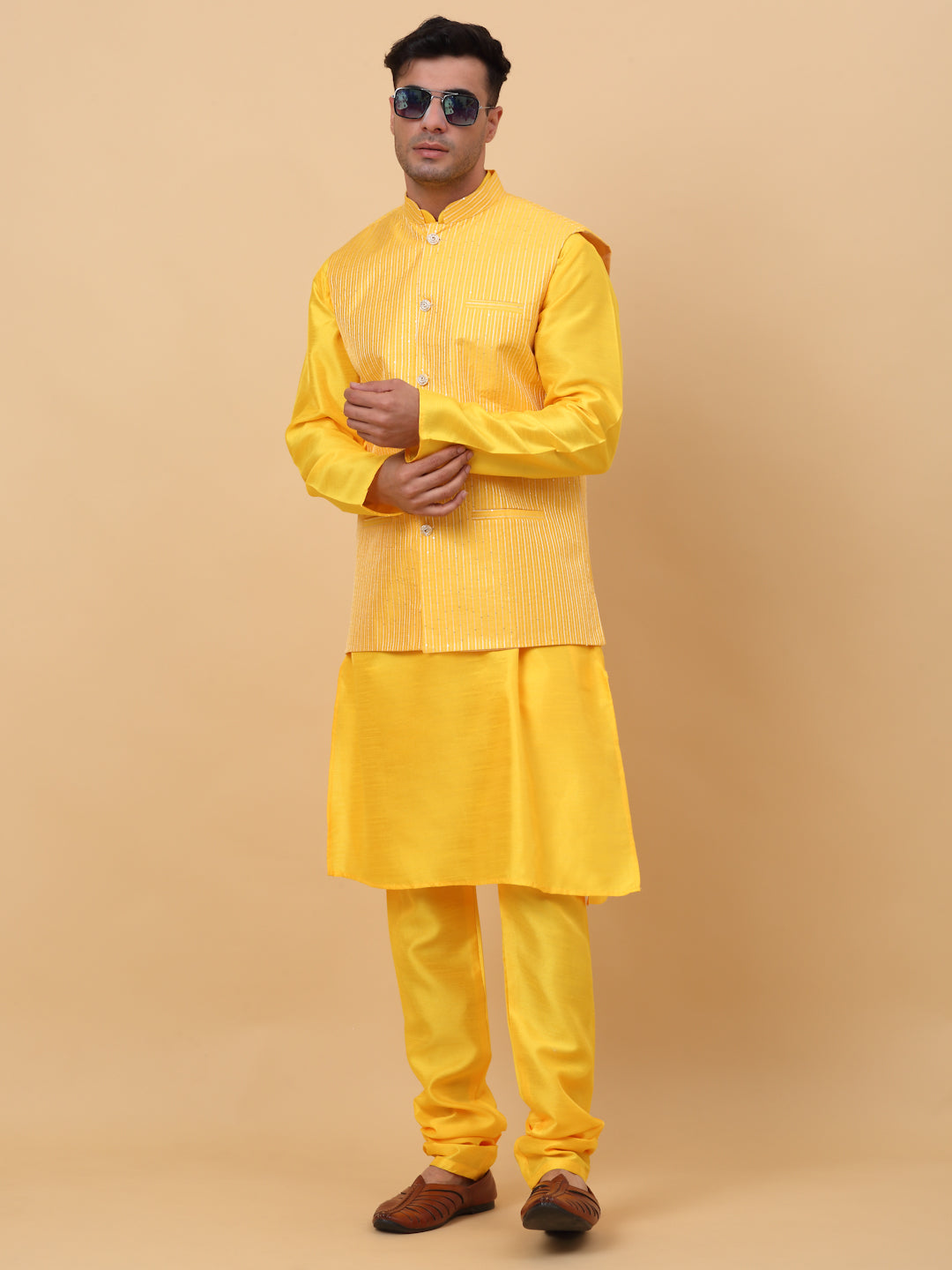 Yellow Solid Kurta & Churidar with Yellow Nehru jacket Yellow solid straight knee length kurta has mandarin collar, long sleeves, side pockets, straight hem, loopi button closure, side slits, with drawstring closure Yellow churidar Yellow Striped Nehru jacket, has a mandarin collar, sleeveless, button closure, three pockets, an attached lining