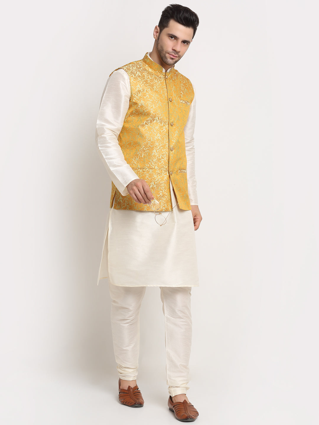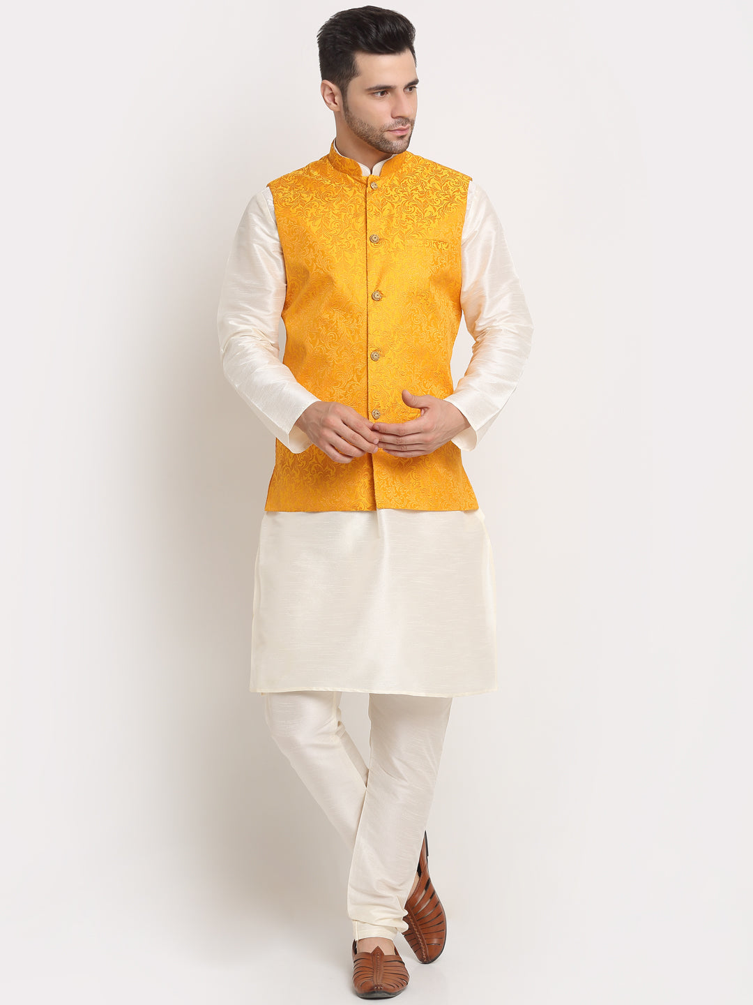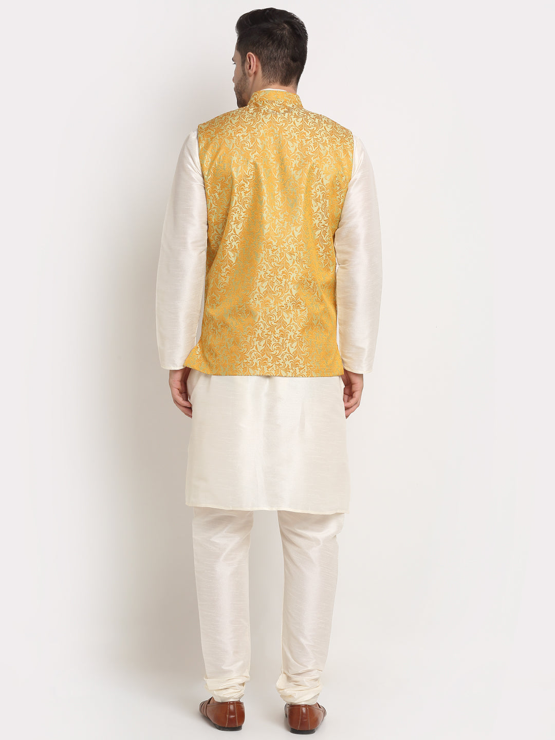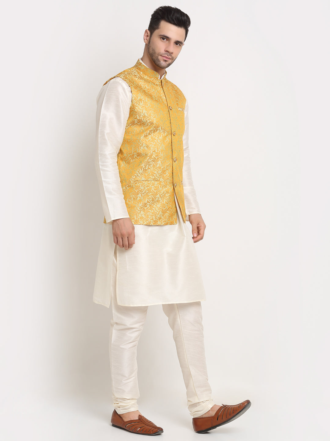 Mens Cream Silk Blend Kurta and Churidar with Woven Nehru Jacket
