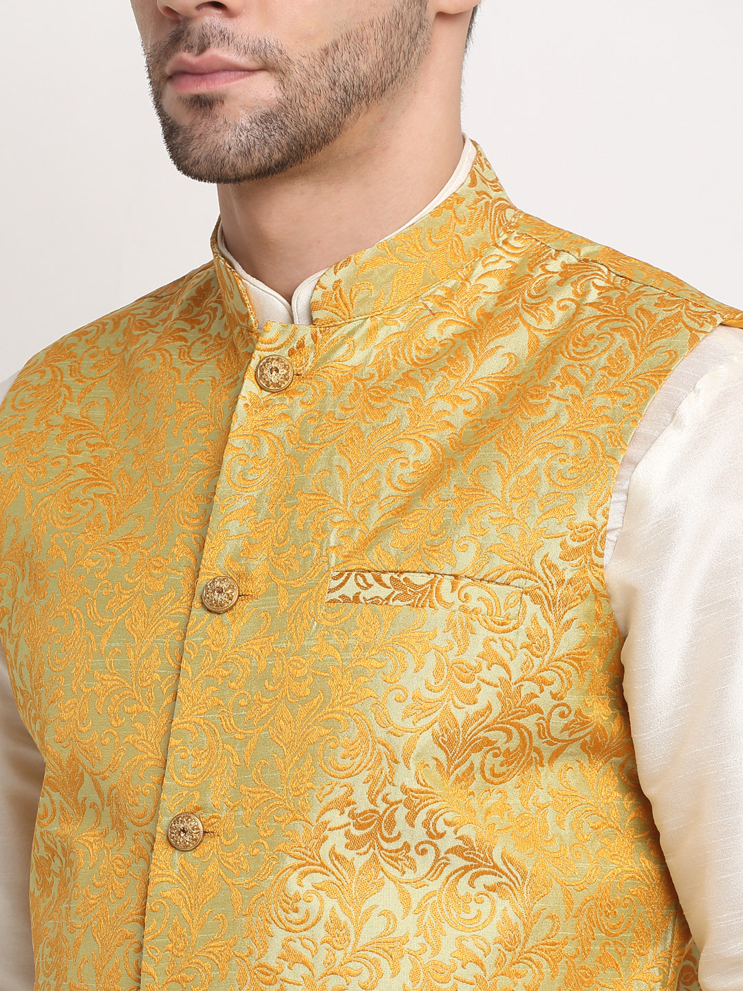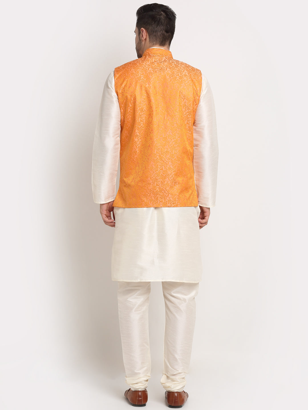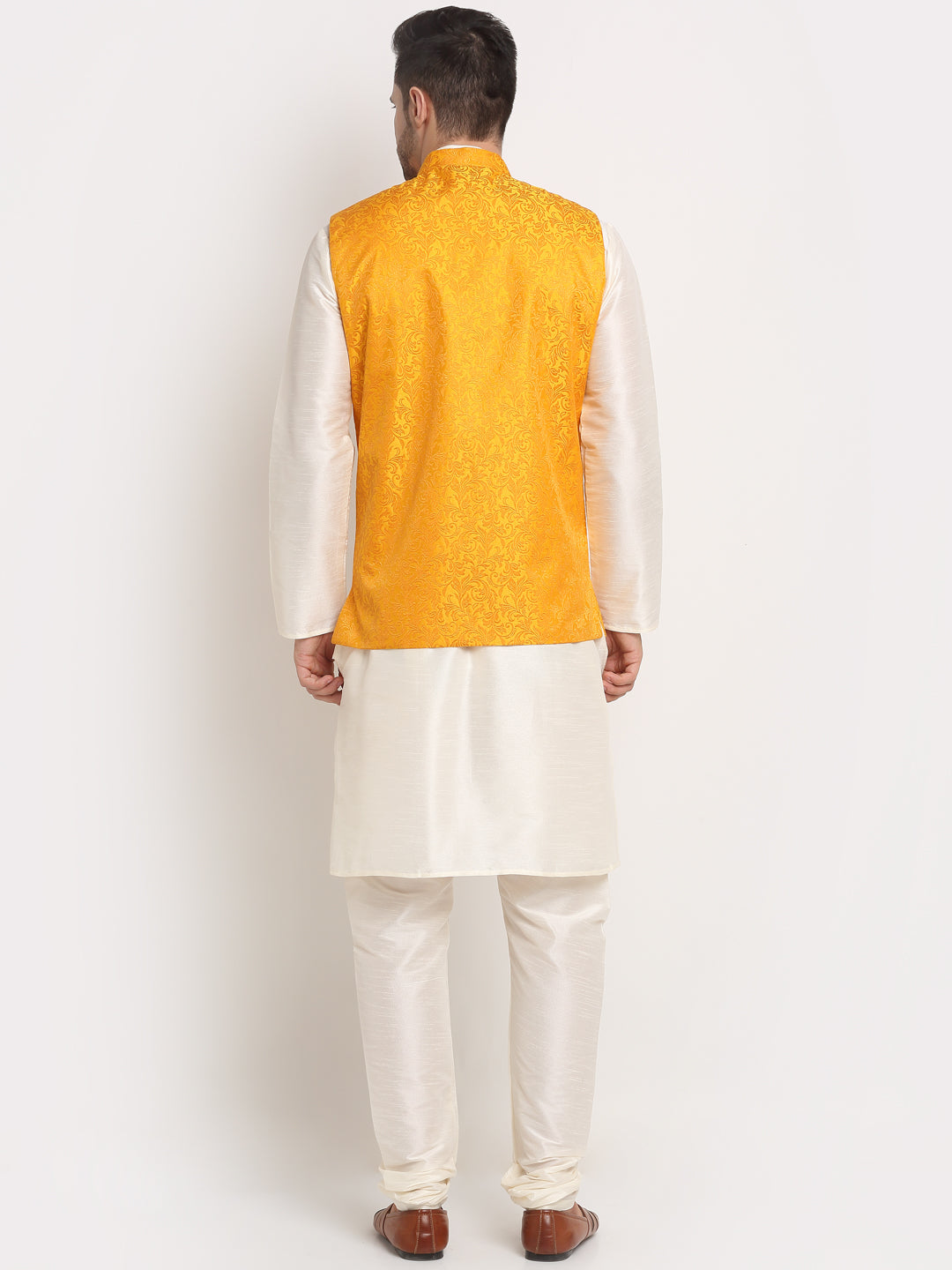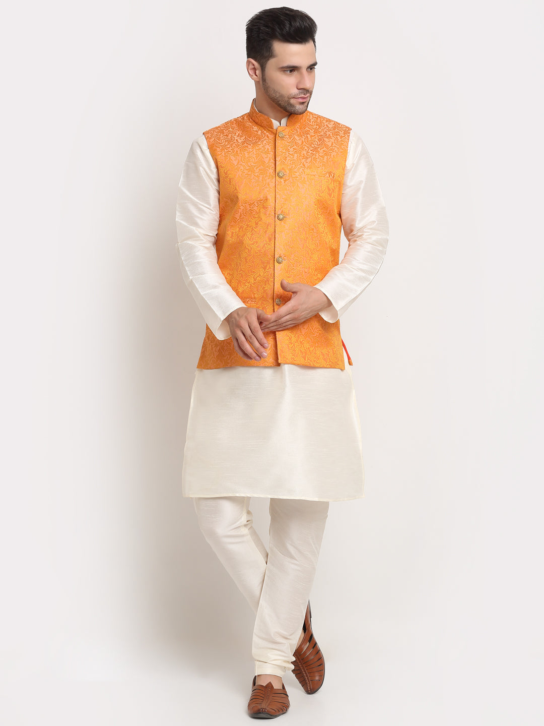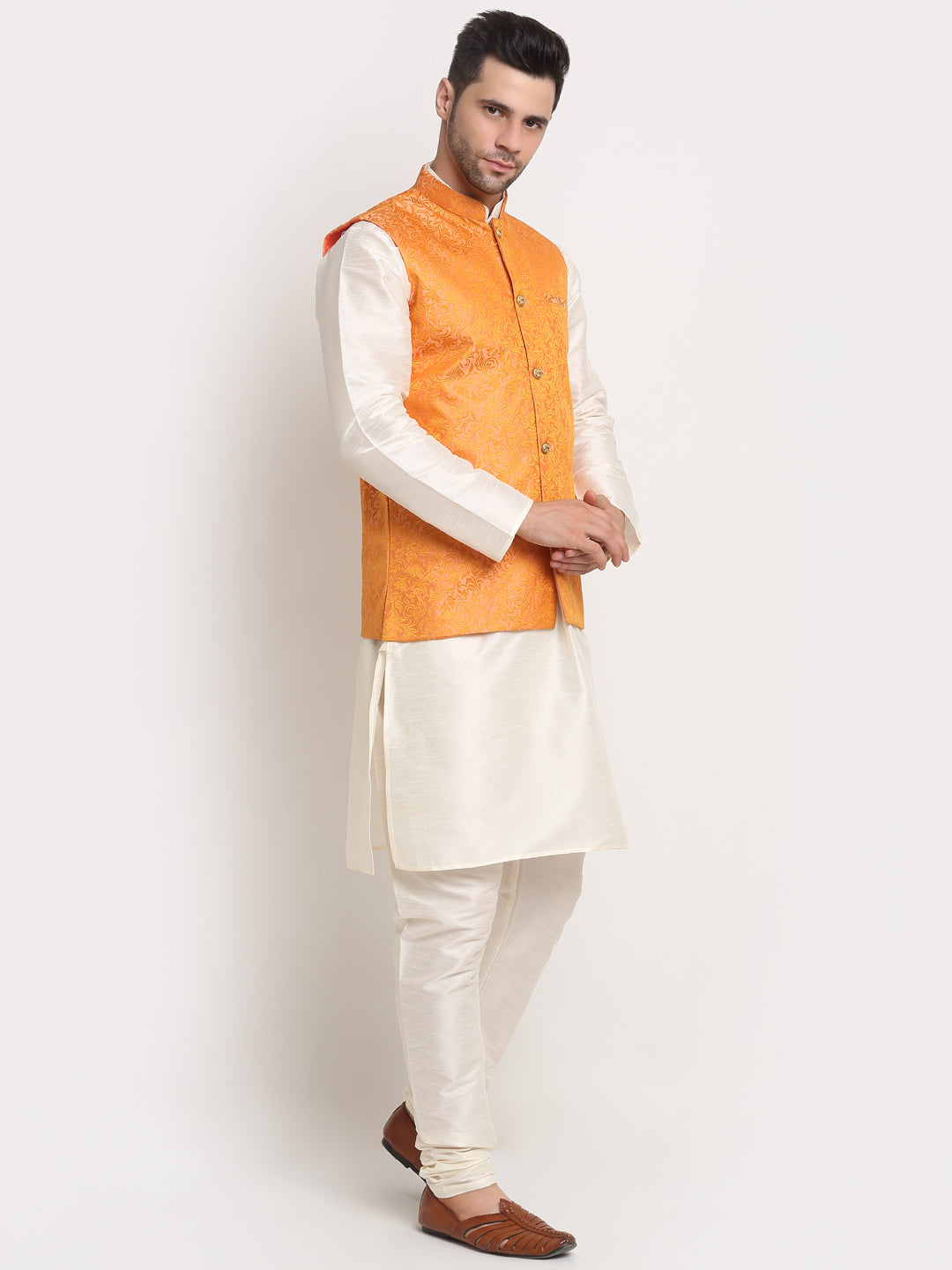 Mens Cream Silk Blend Kurta and Churidar with Woven Nehru Jacket