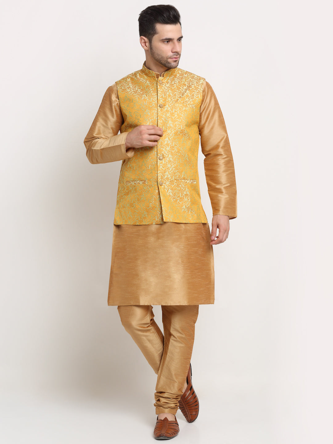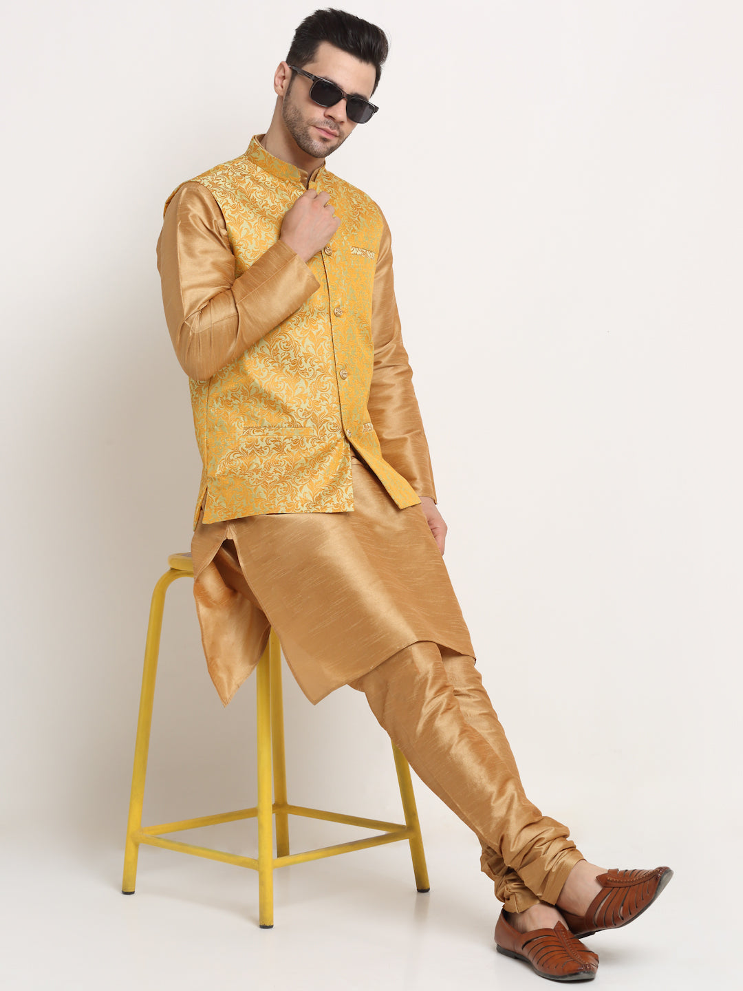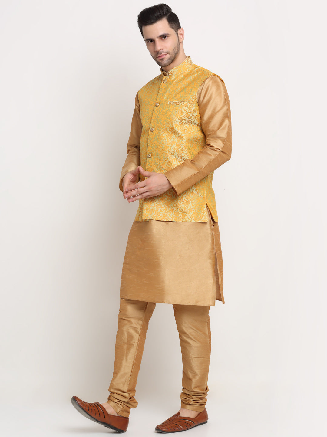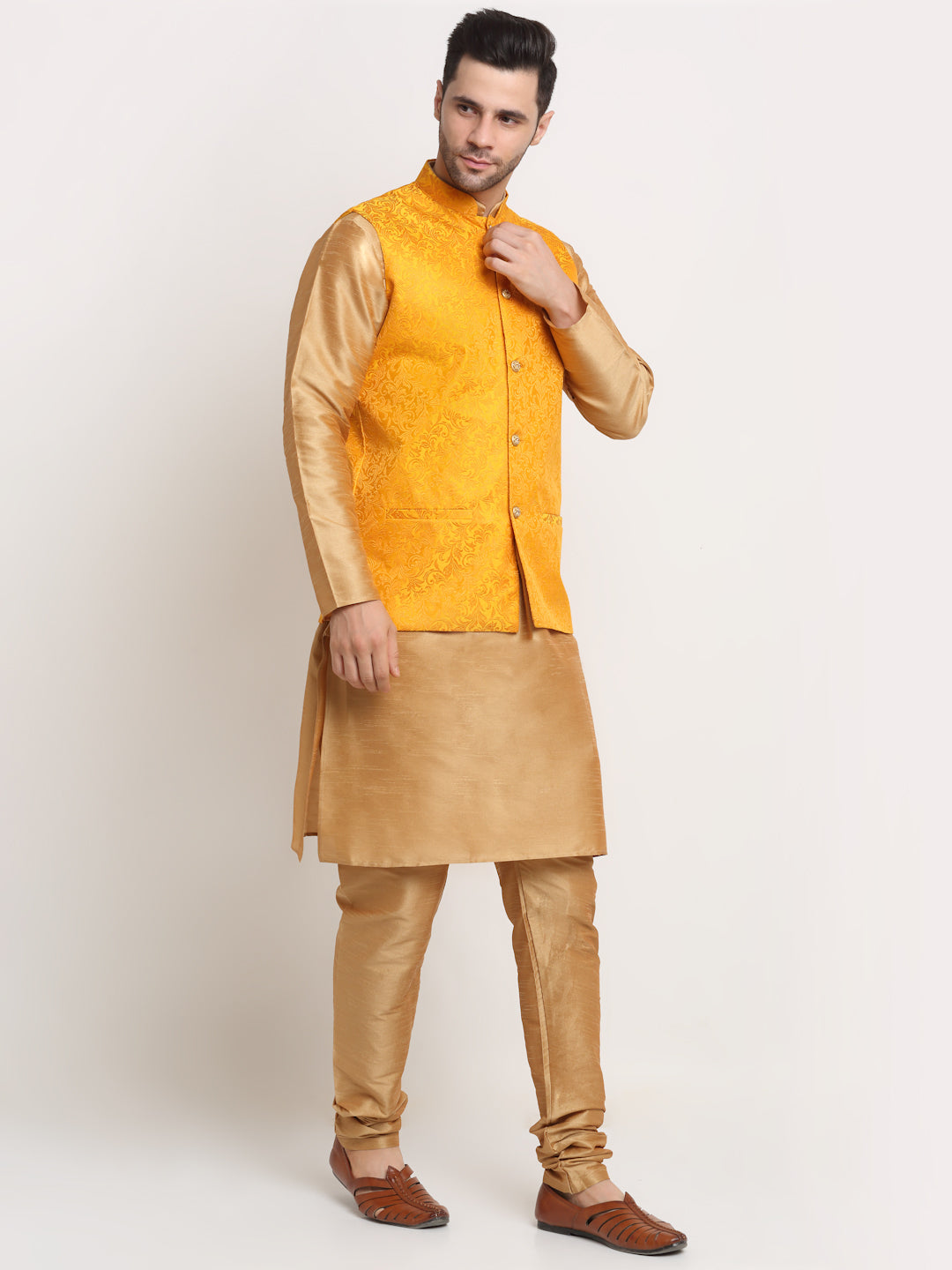 Mens Gold Silk Blend Kurta and Churidar with Woven Nehru Jacket