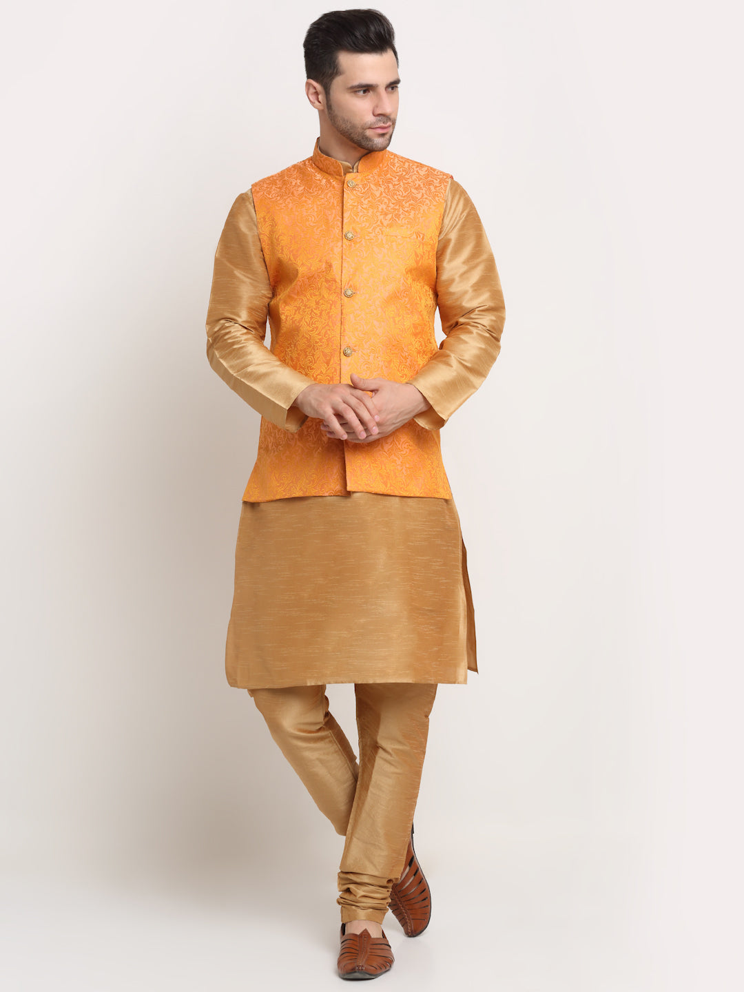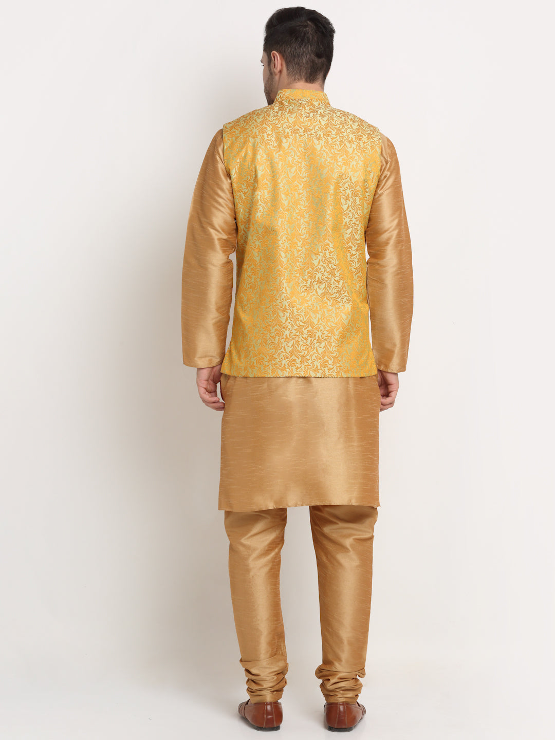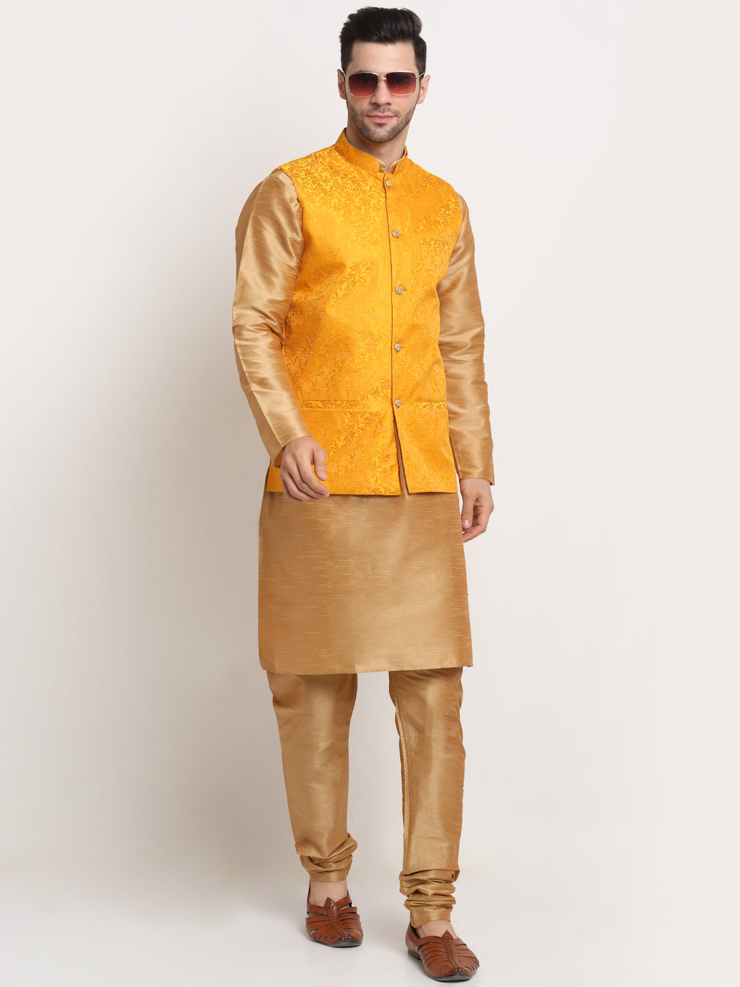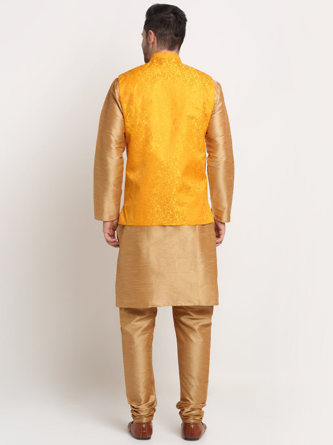 Mens Gold Silk Blend Kurta and Churidar with Woven Nehru Jacket