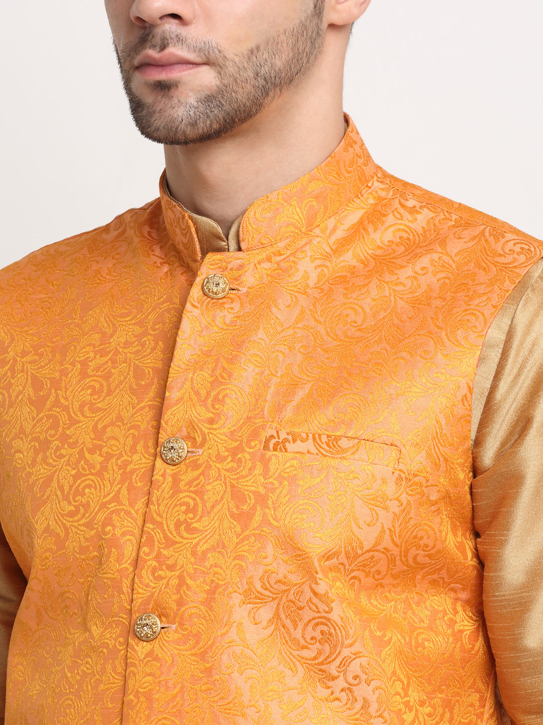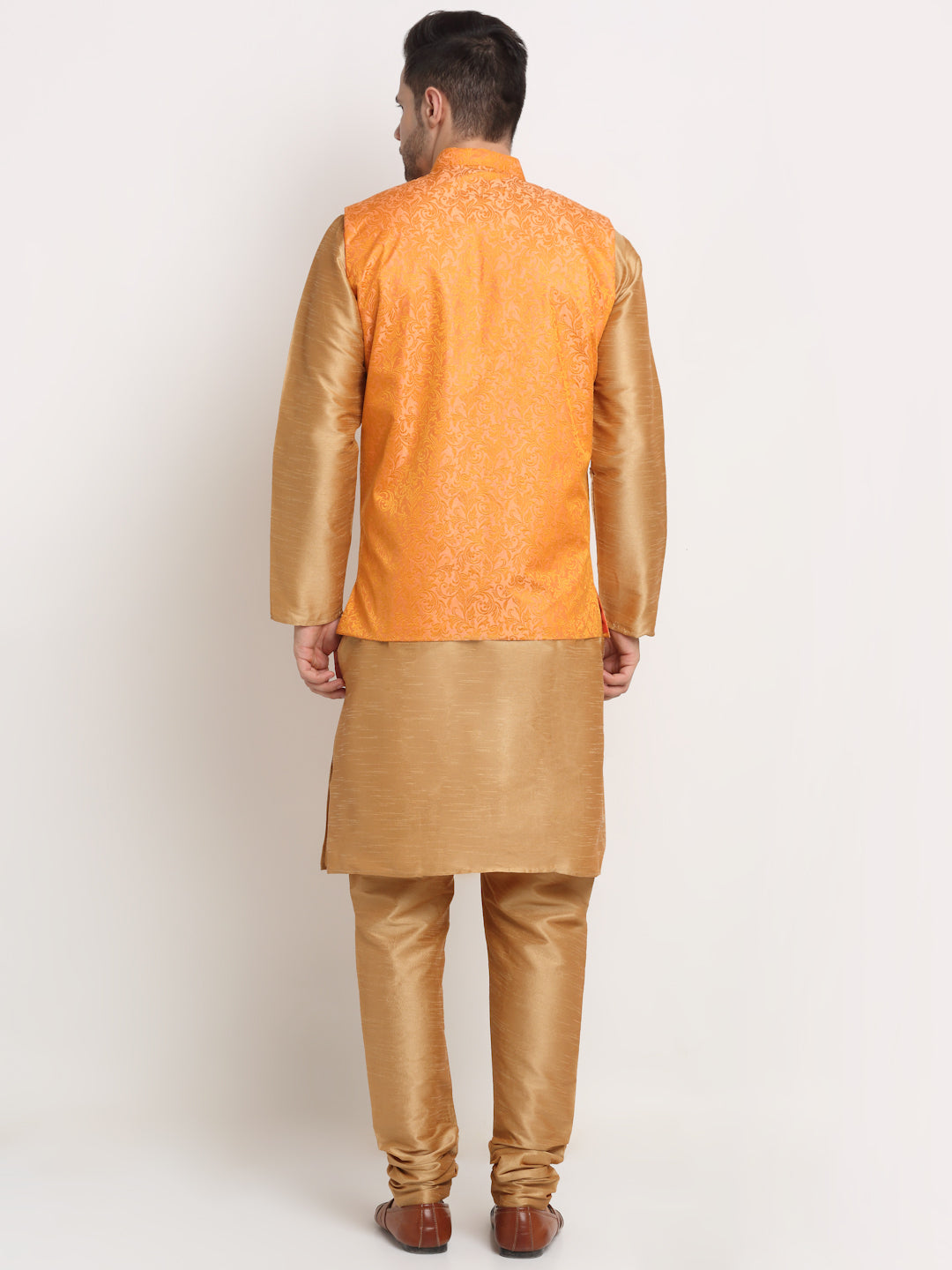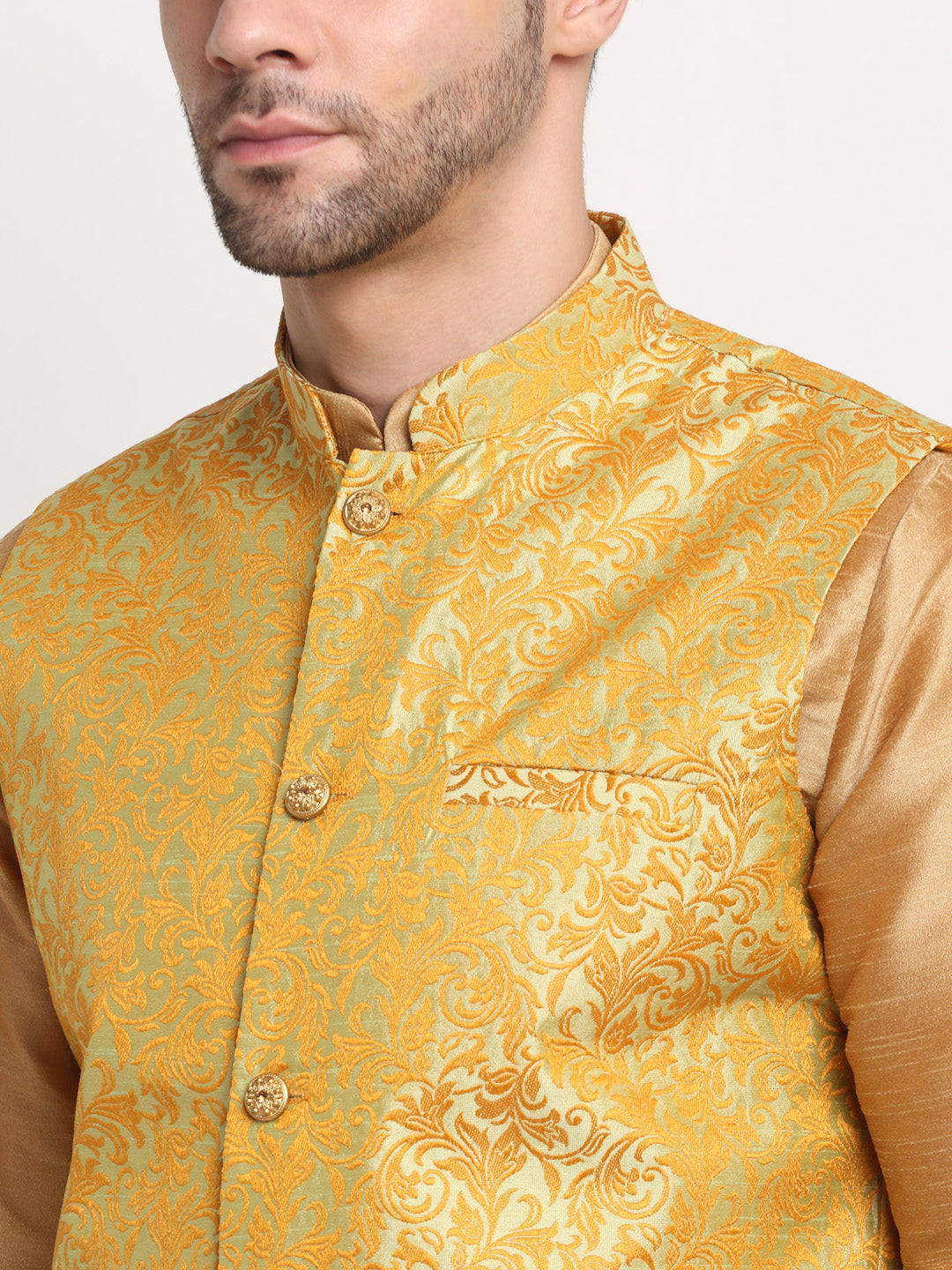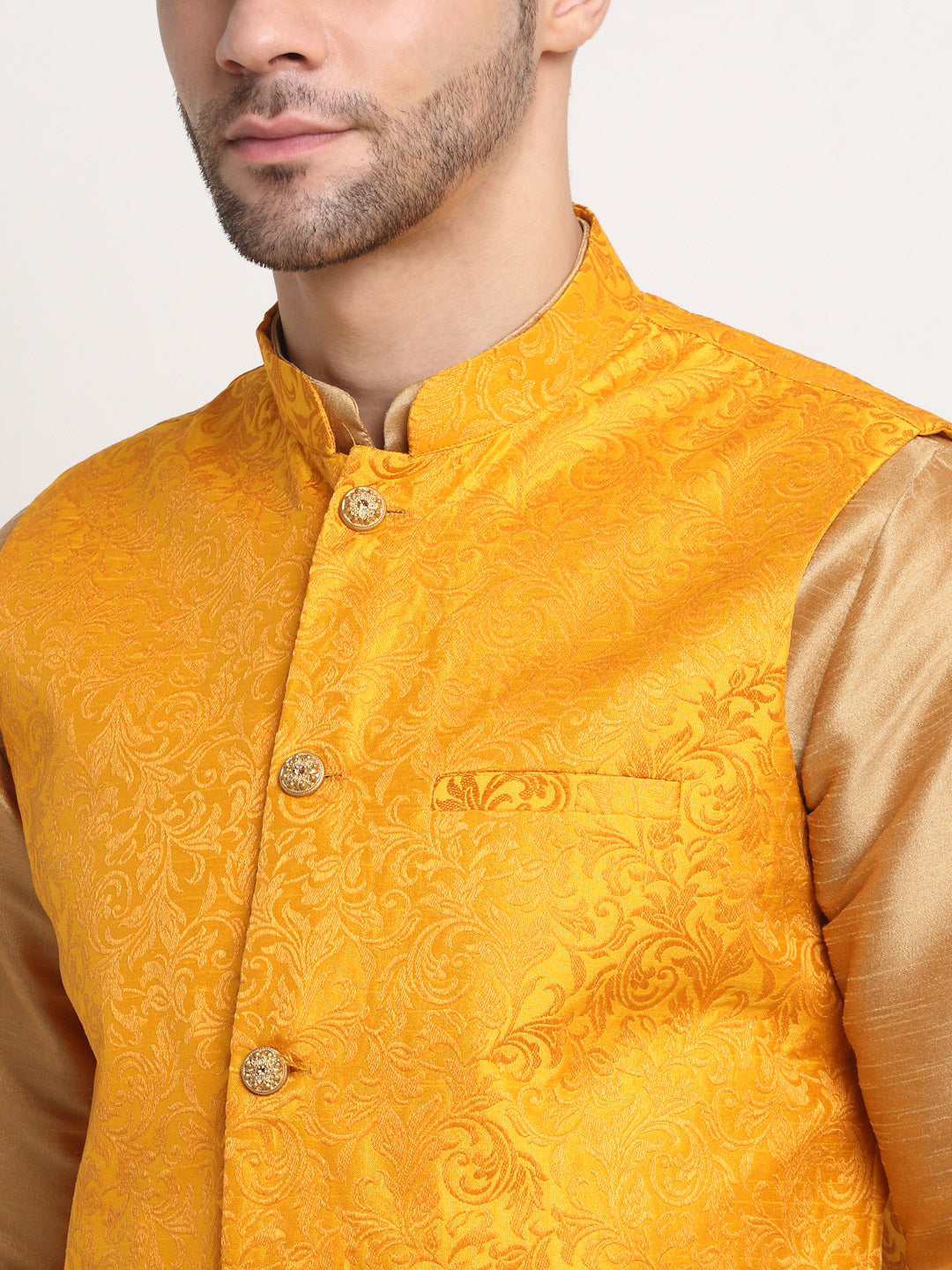 Mens Gold Silk Blend Kurta and Churidar with Woven Nehru Jacket