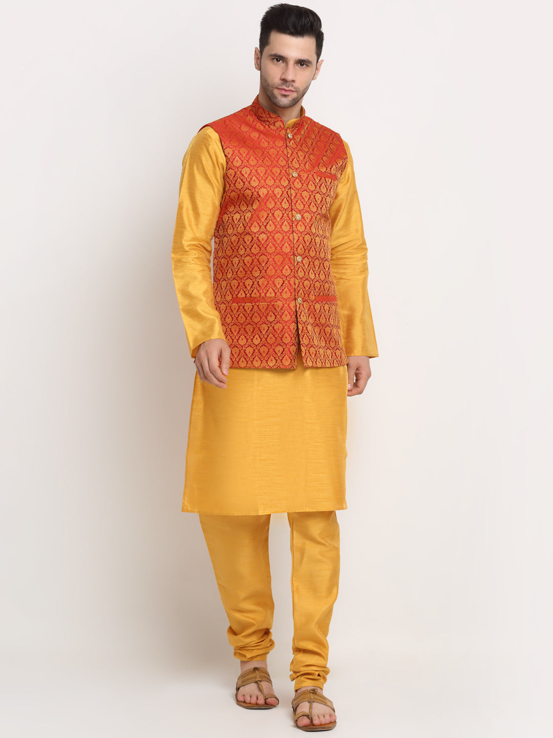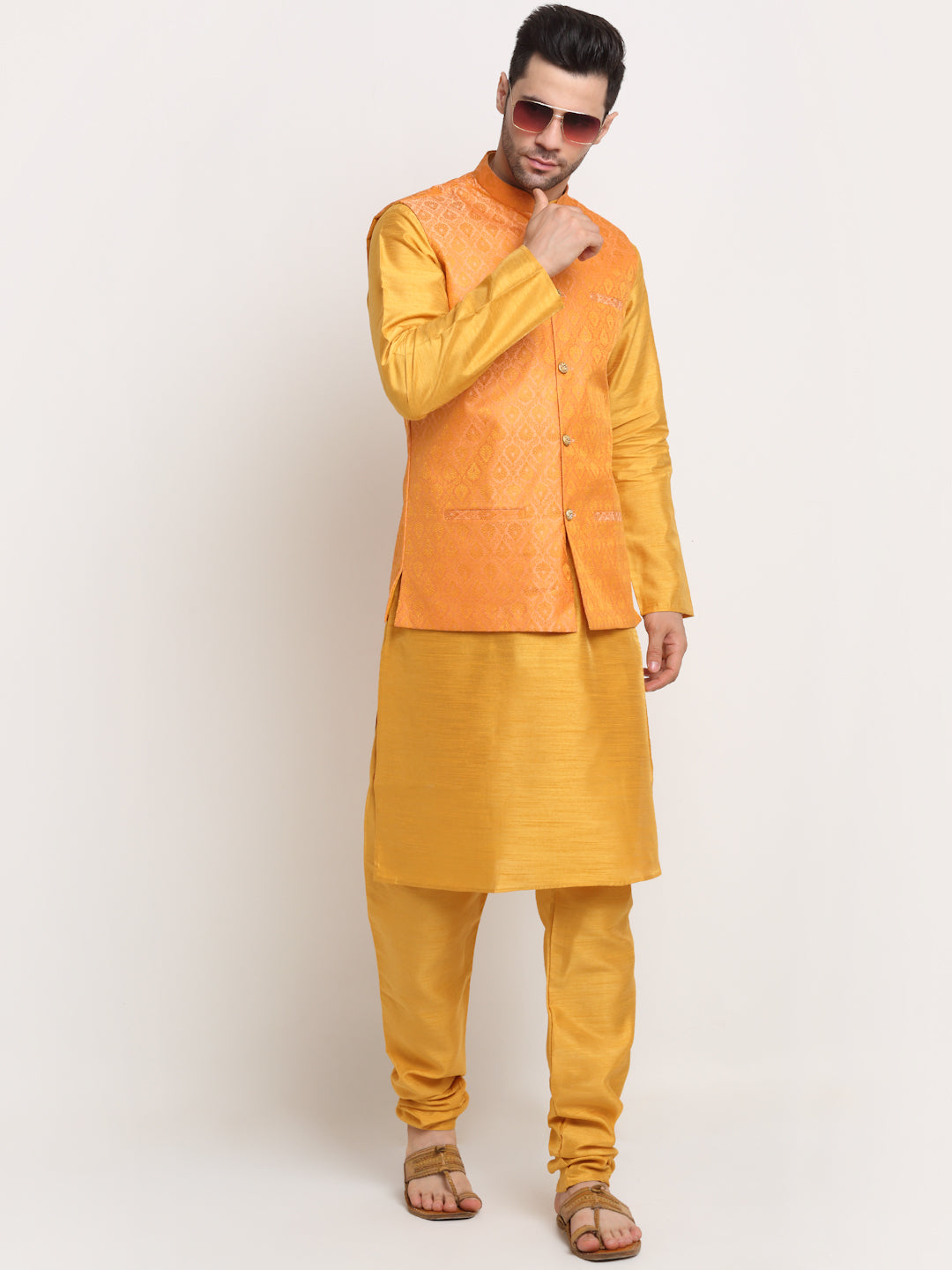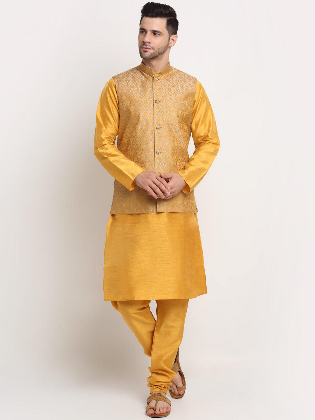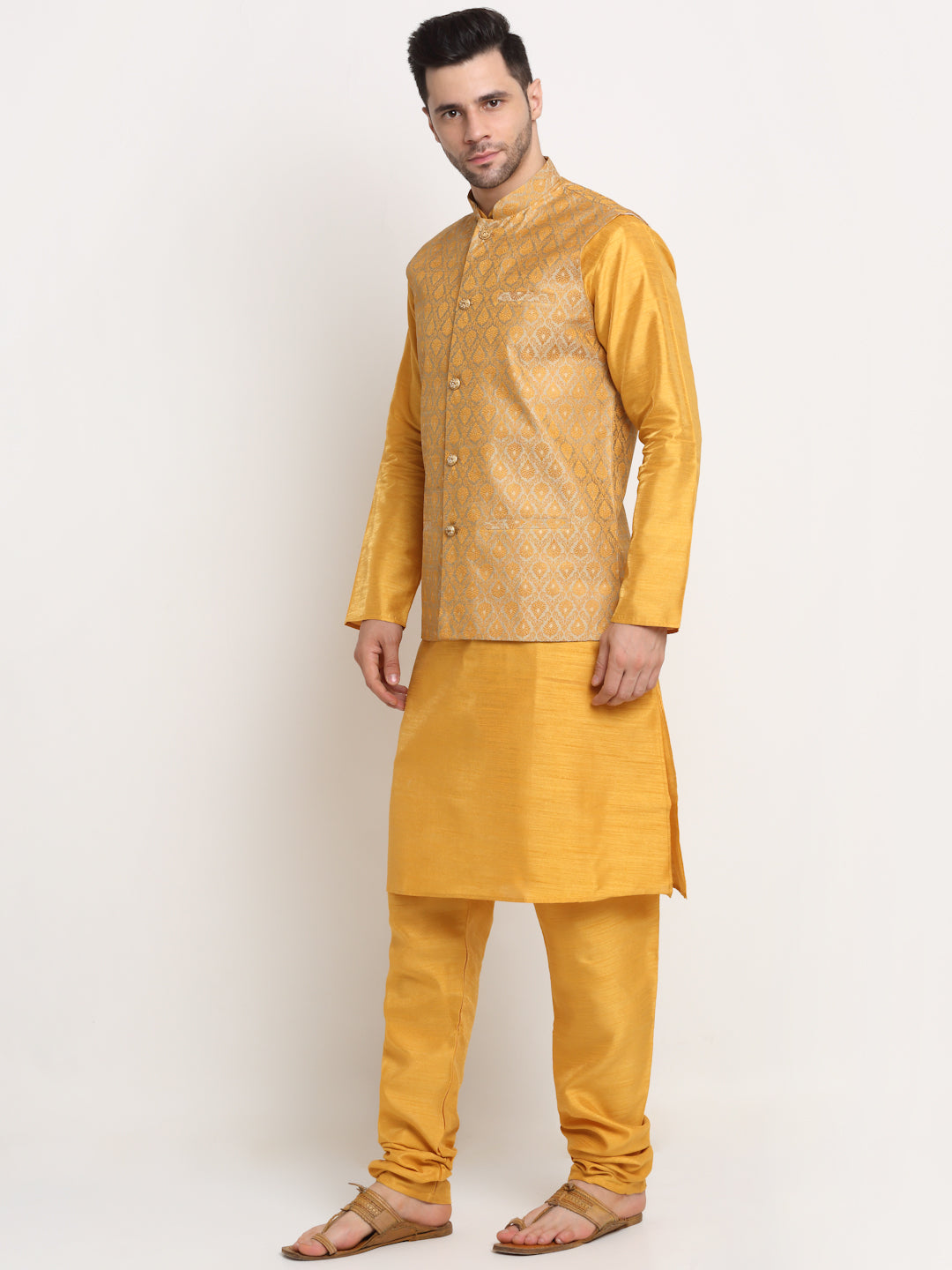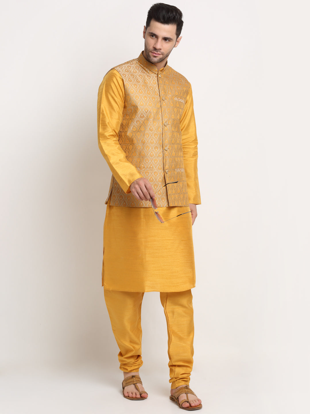 KRAFT INDIA Mens Mustard Silk Blend Kurta and churidar with Paisley Nehru jacket