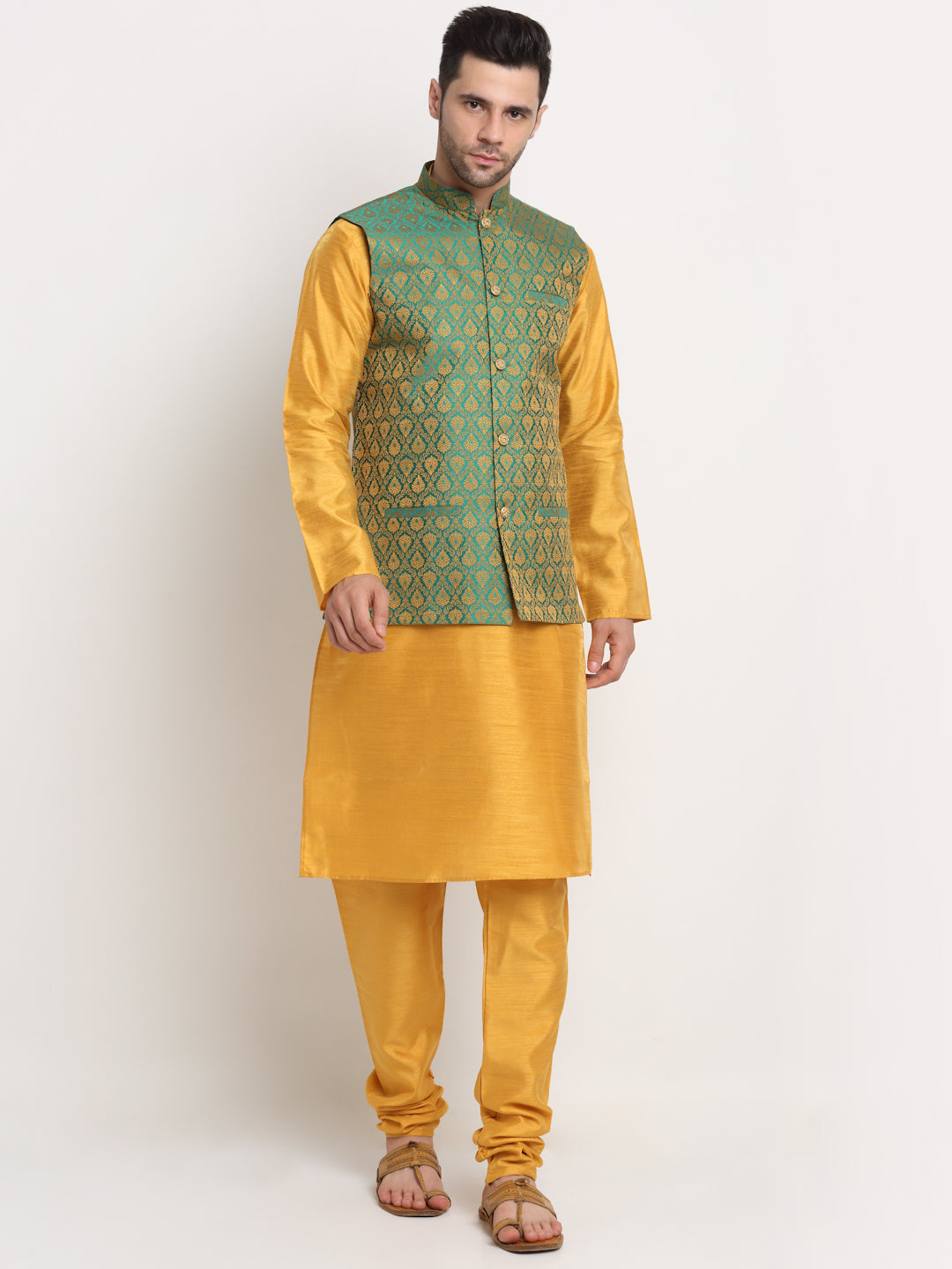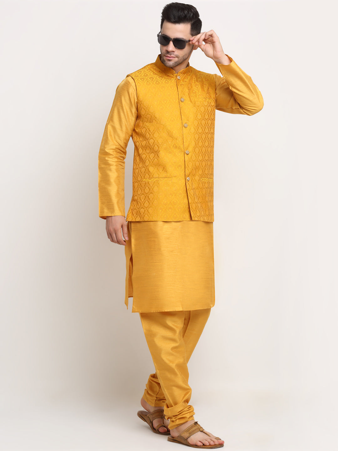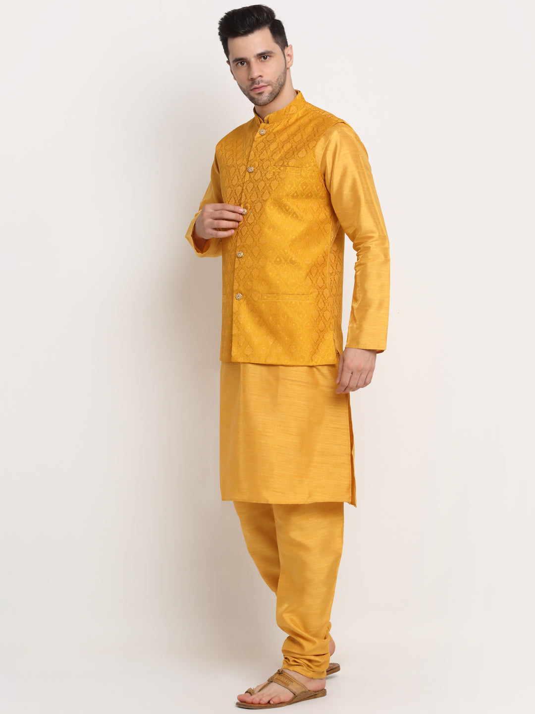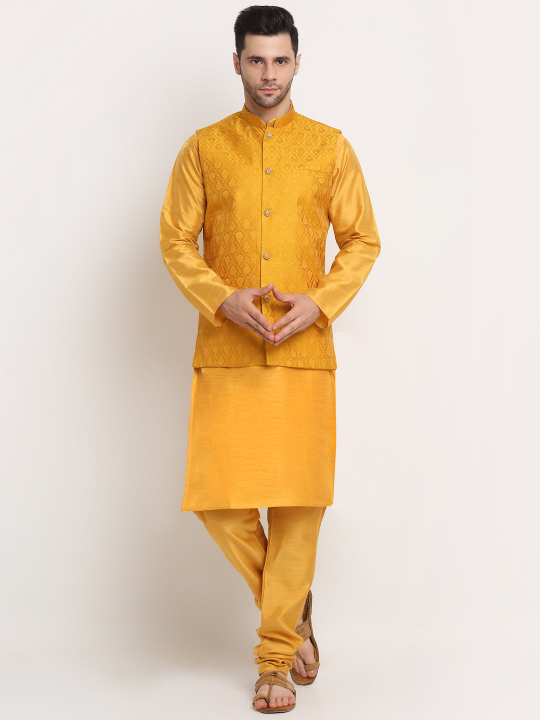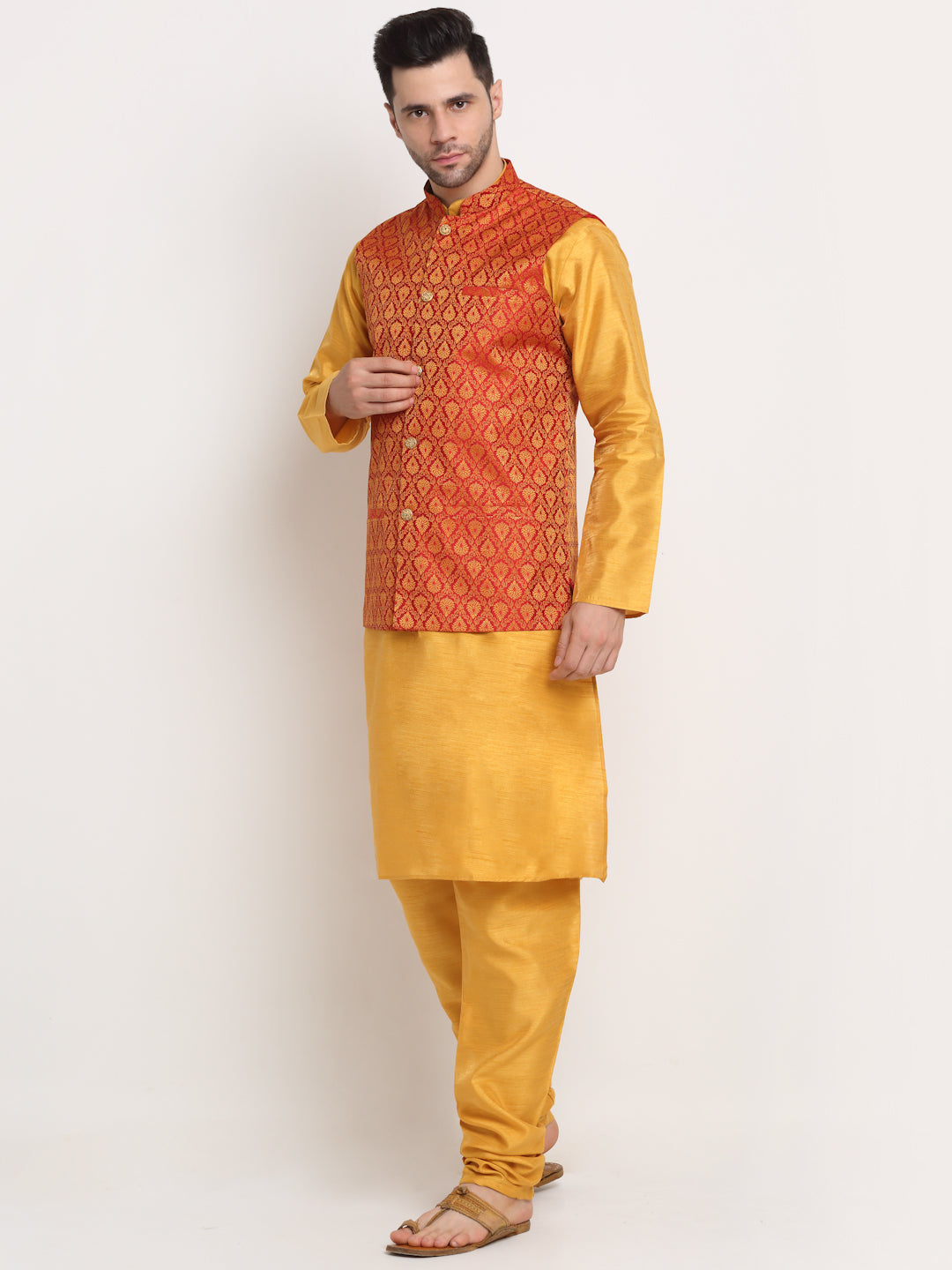 KRAFT INDIA Mens Mustard Silk Blend Kurta and churidar with Paisley Nehru jacket