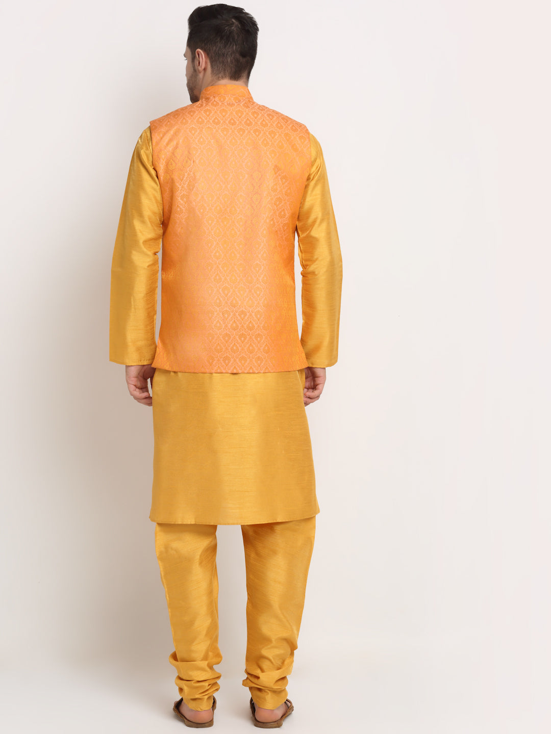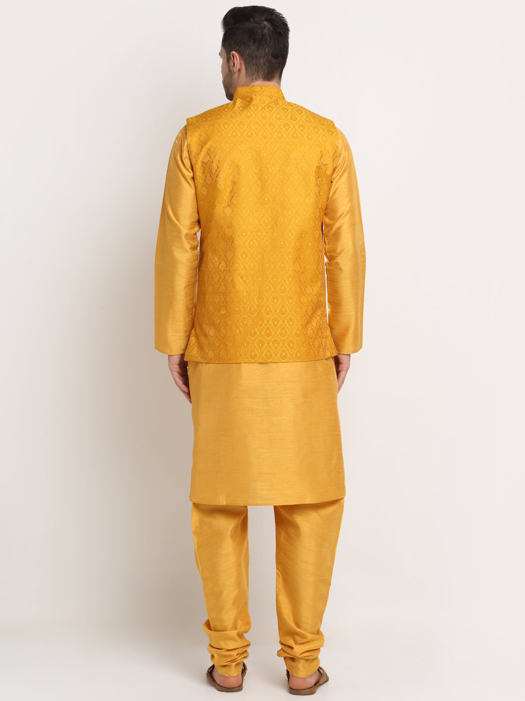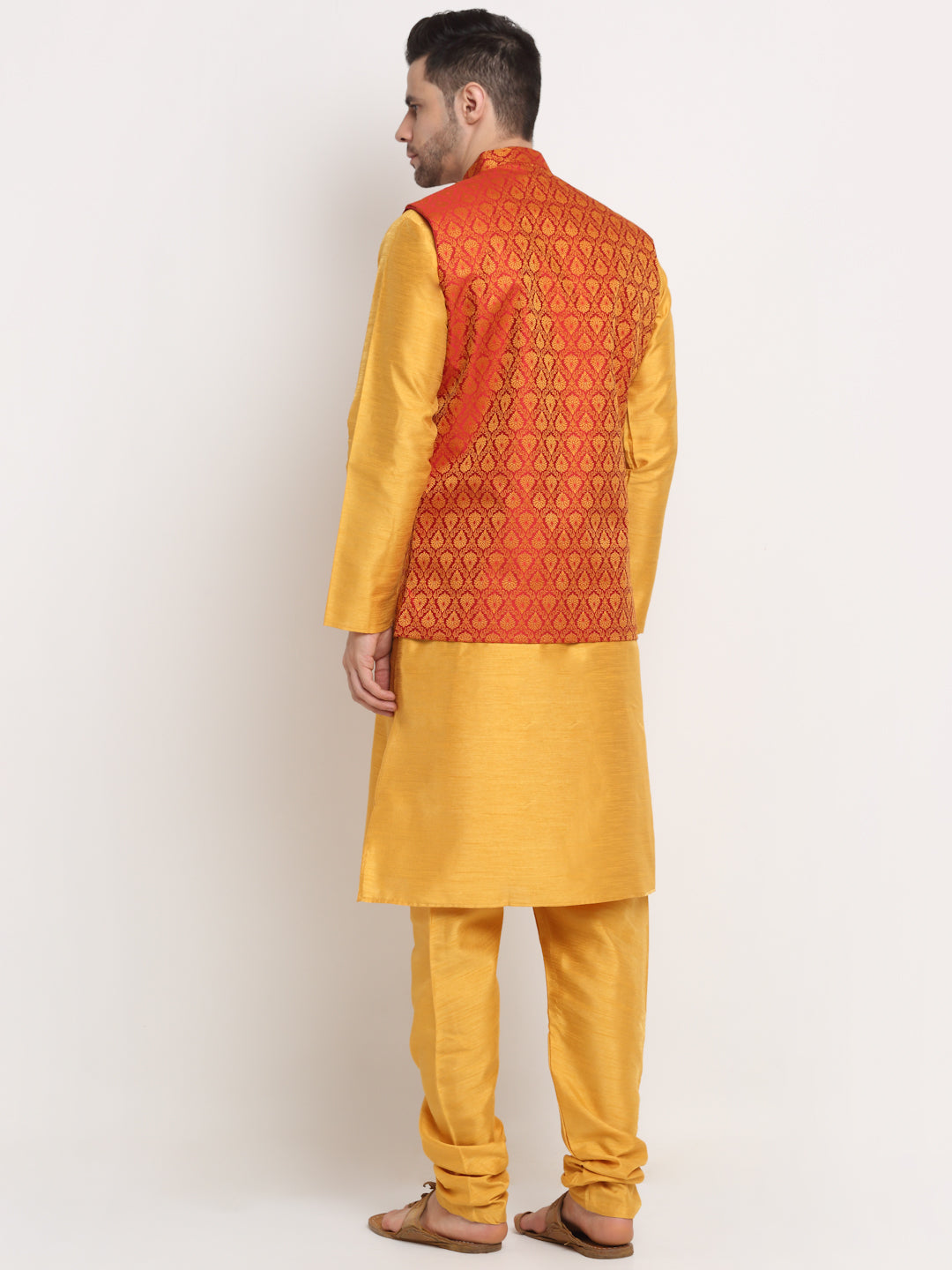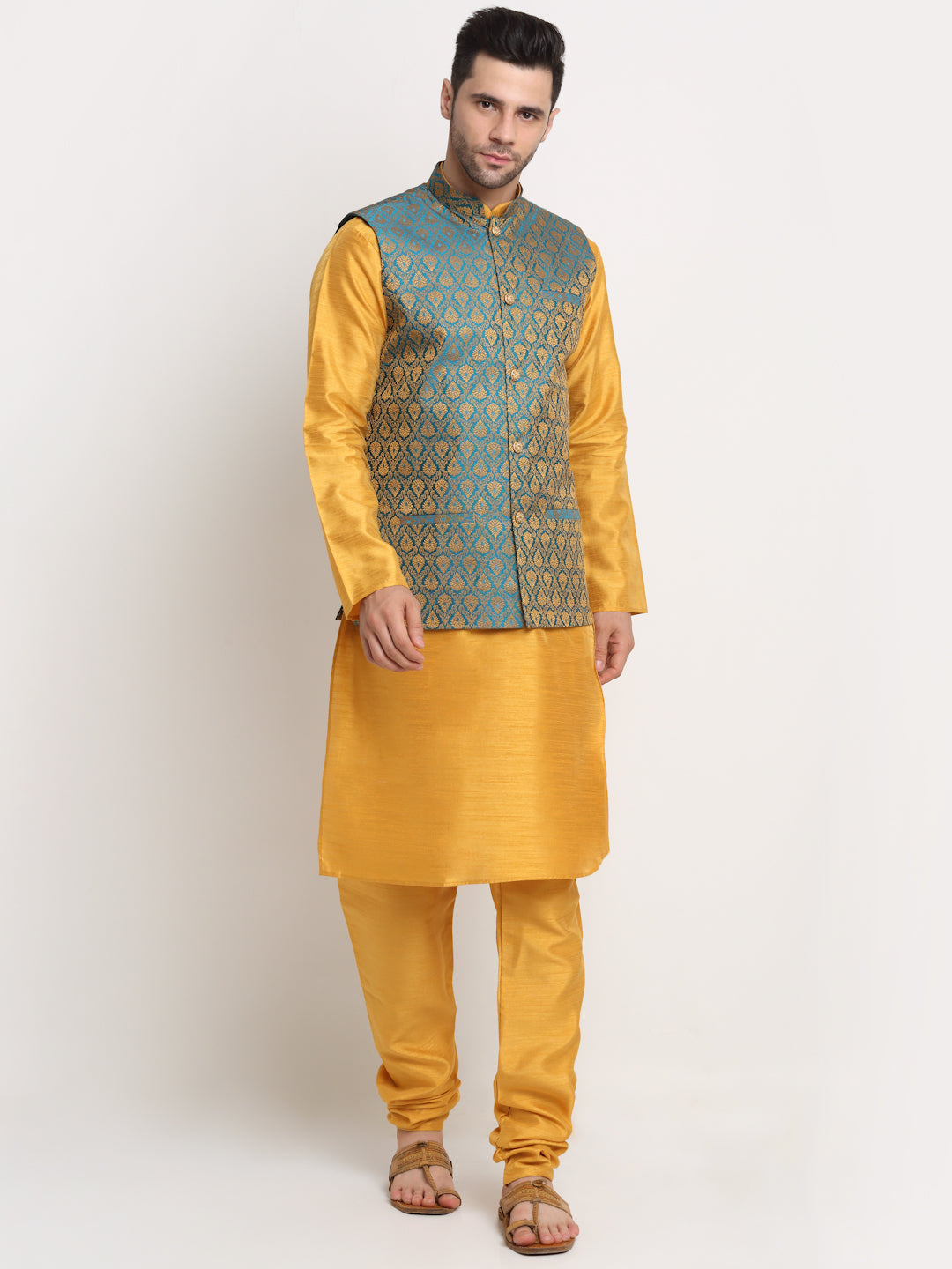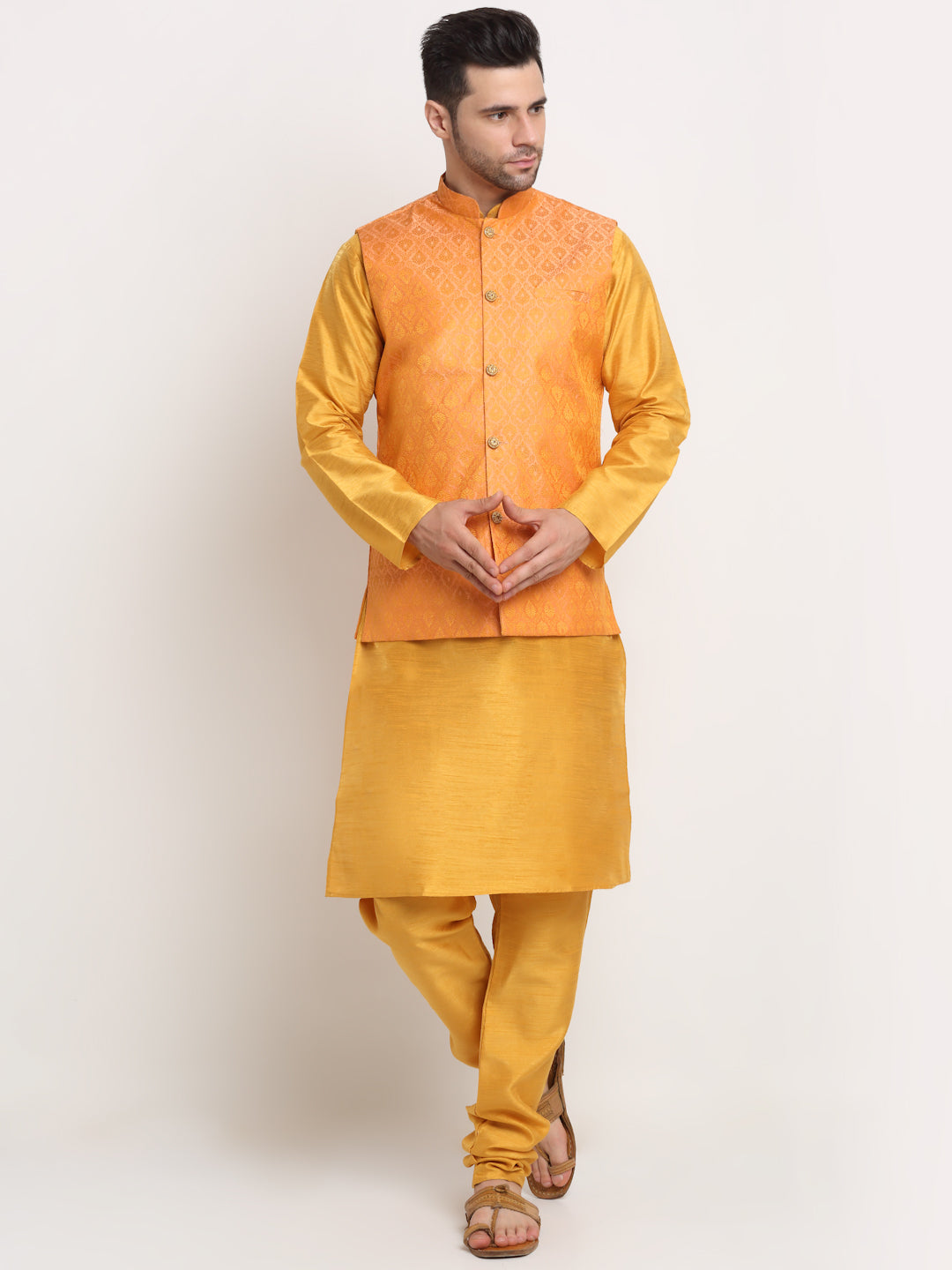KRAFT INDIA Mens Mustard Silk Blend Kurta and churidar with Paisley Nehru jacket