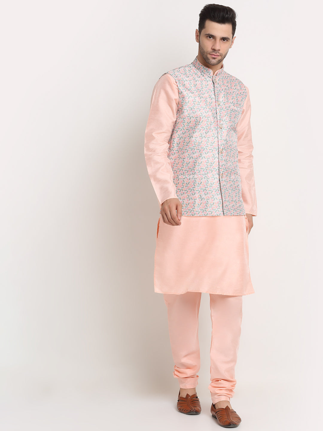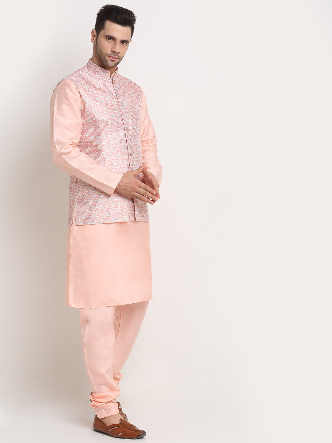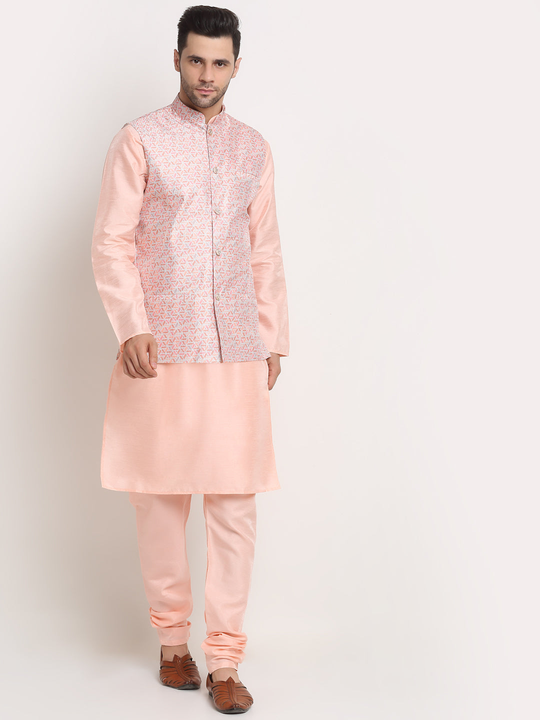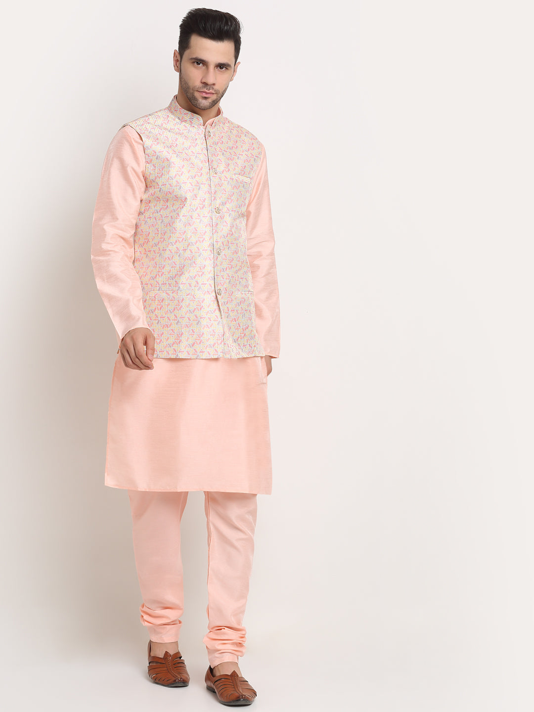KRAFT INDIA Mens Peach Silk Blend Kurta and churidar with embroided Nehru jacket