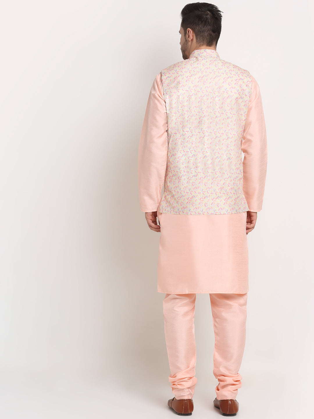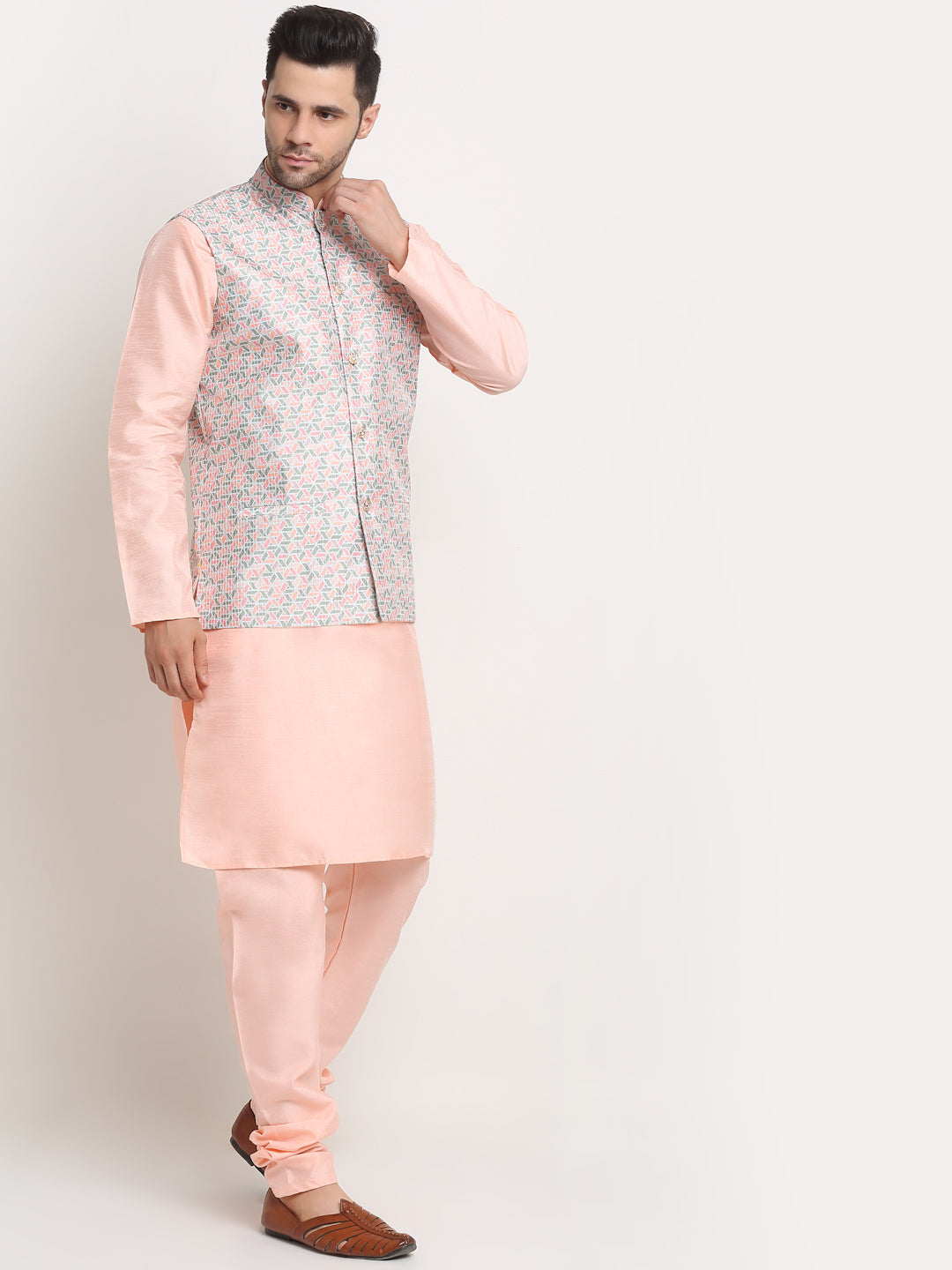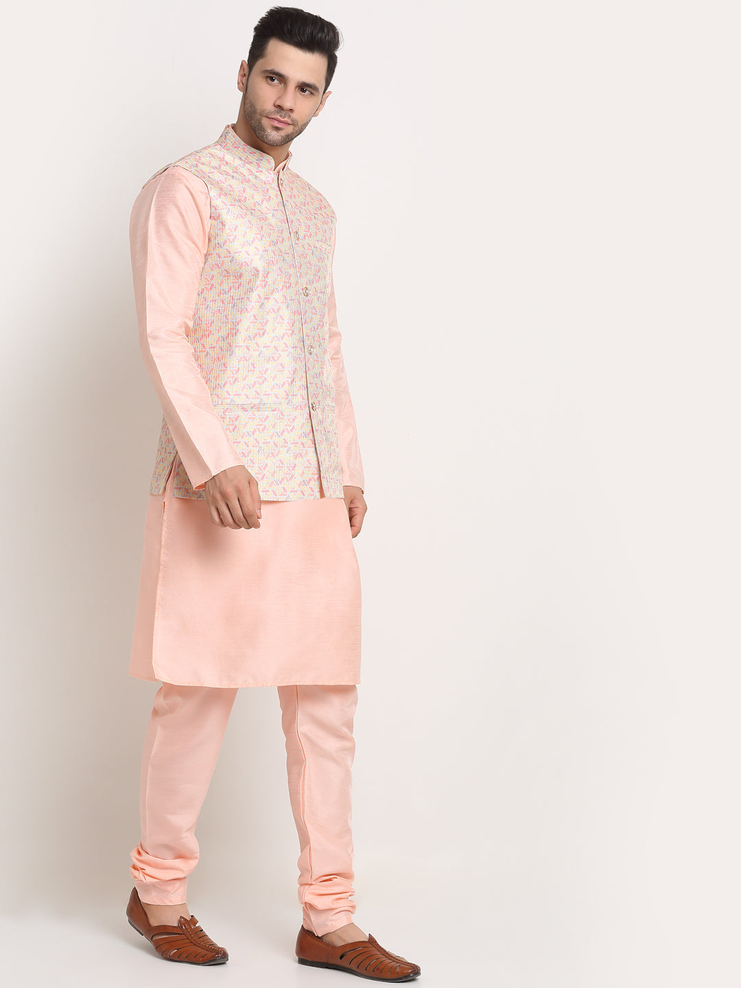 KRAFT INDIA Mens Peach Silk Blend Kurta and churidar with embroided Nehru jacket