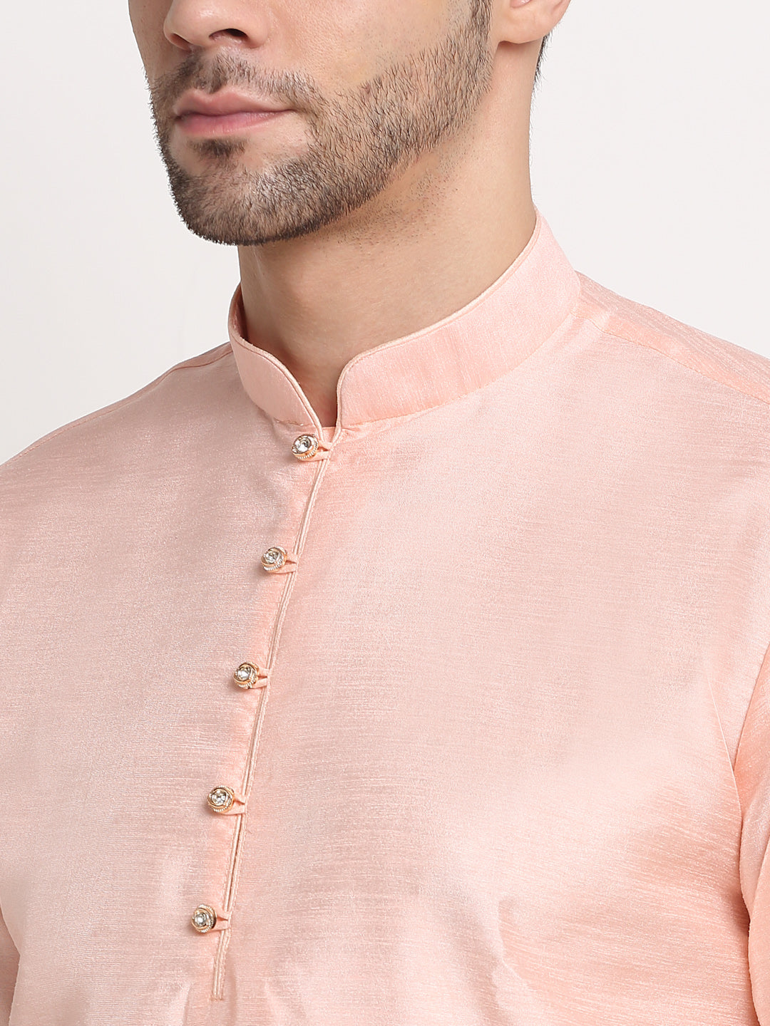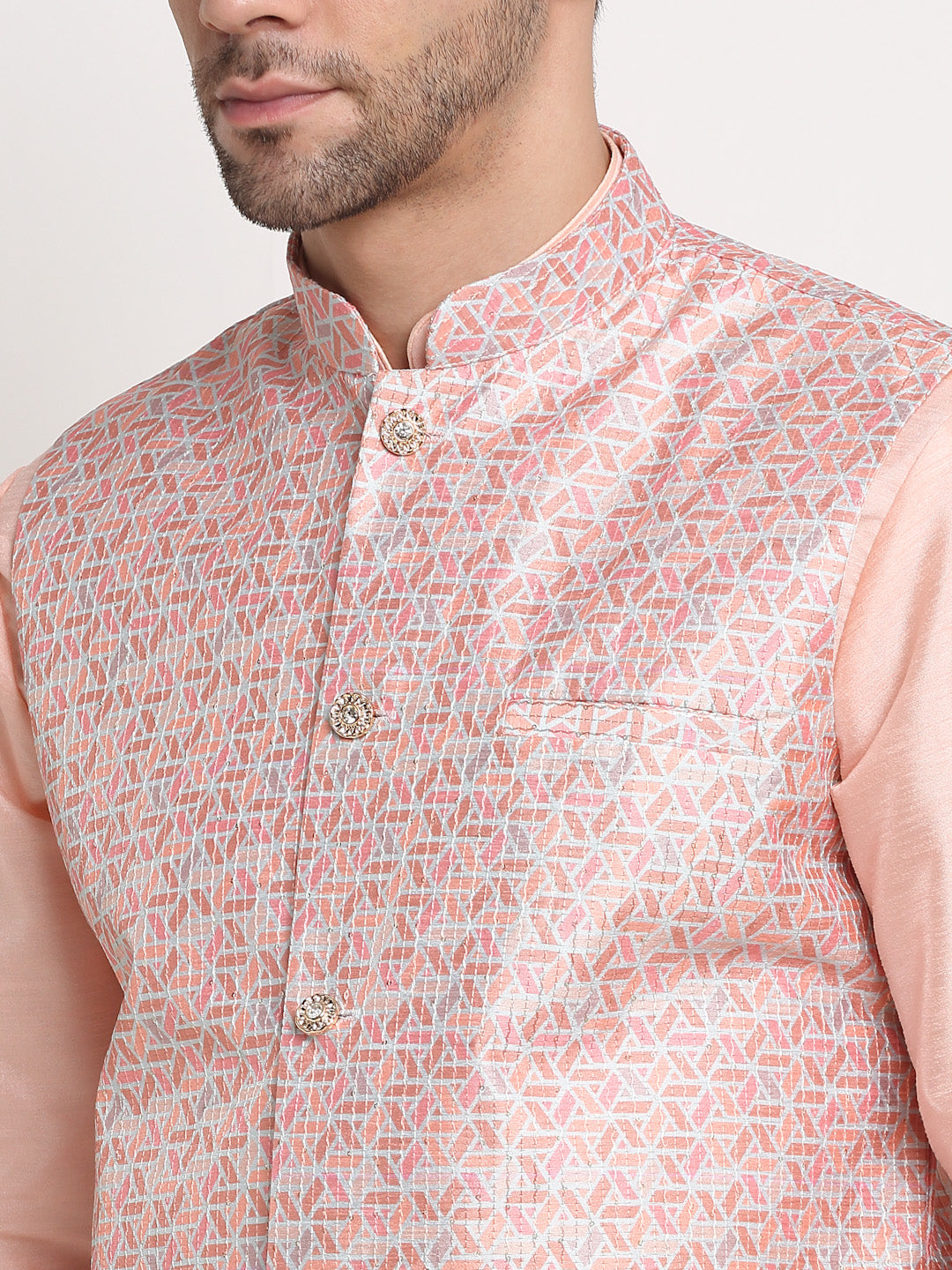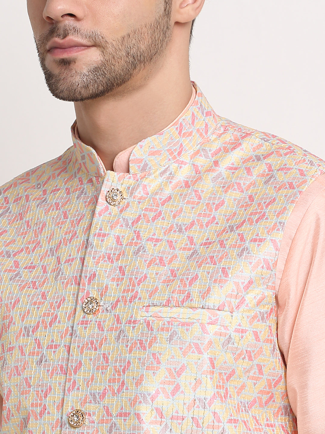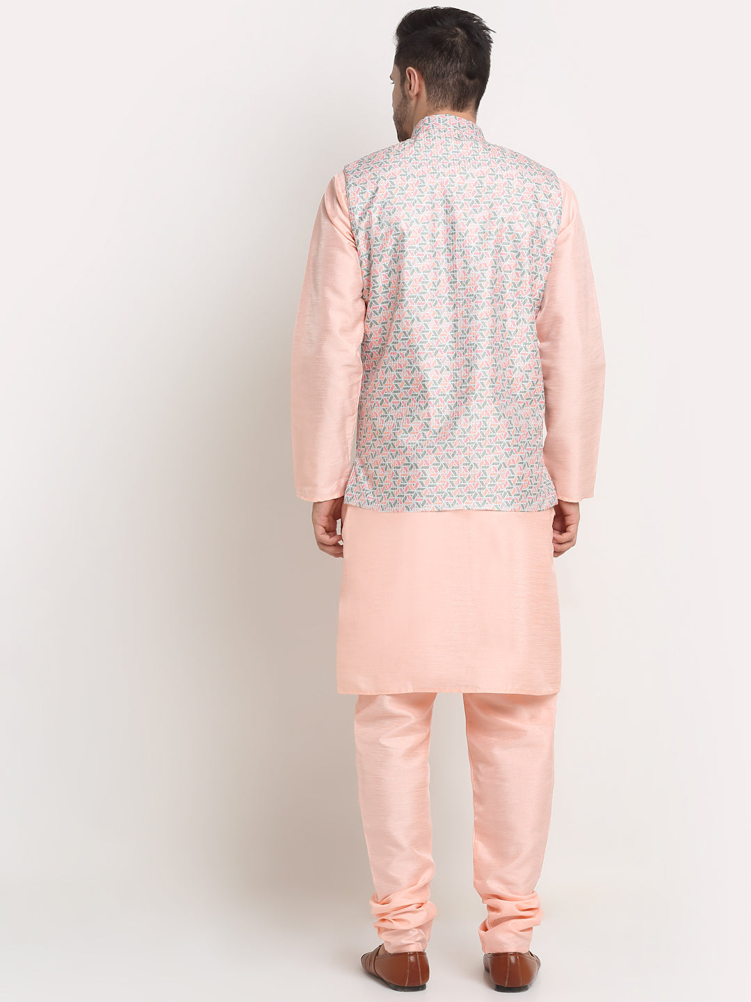 KRAFT INDIA Mens Peach Silk Blend Kurta and churidar with embroided Nehru jacket