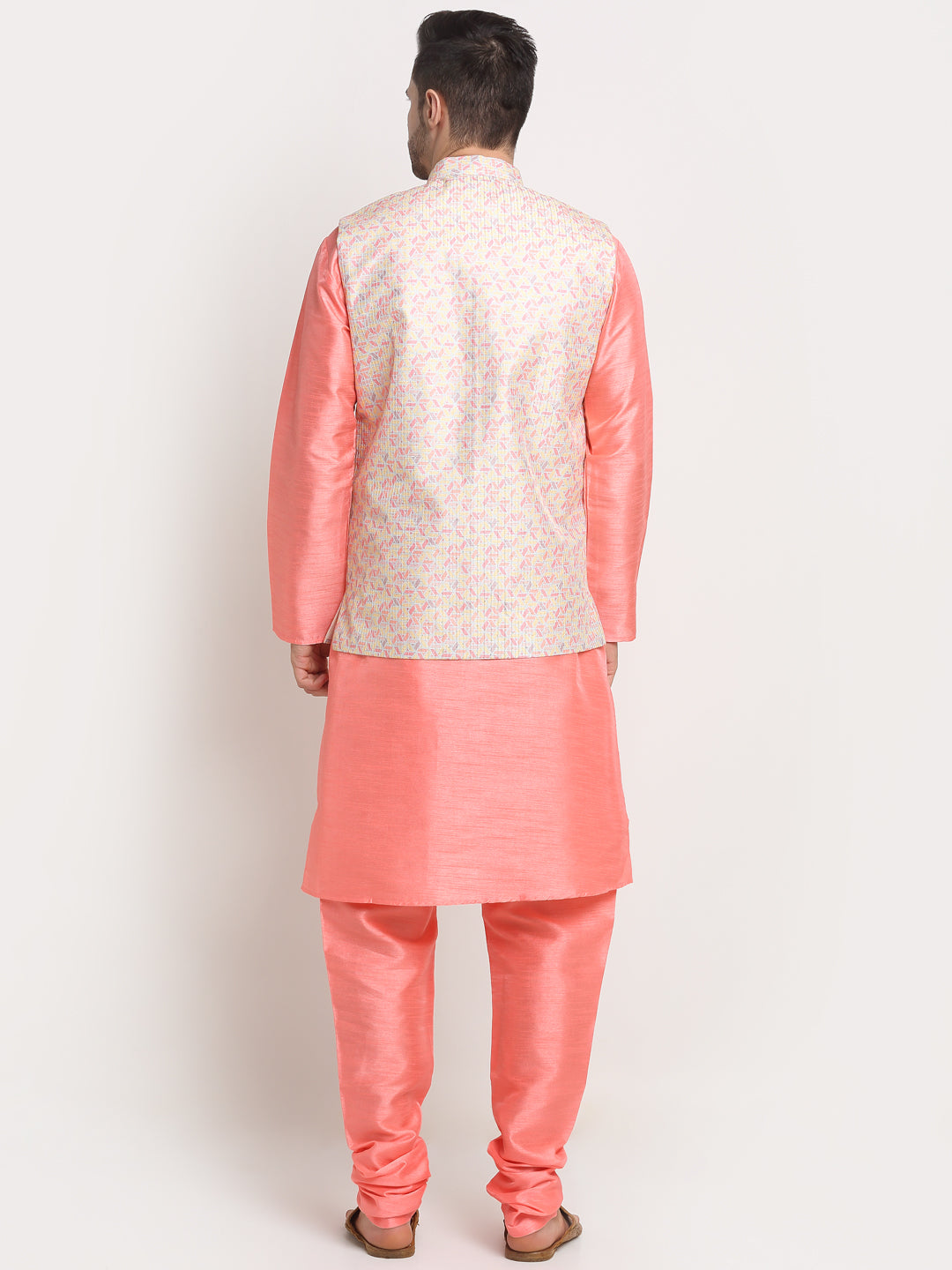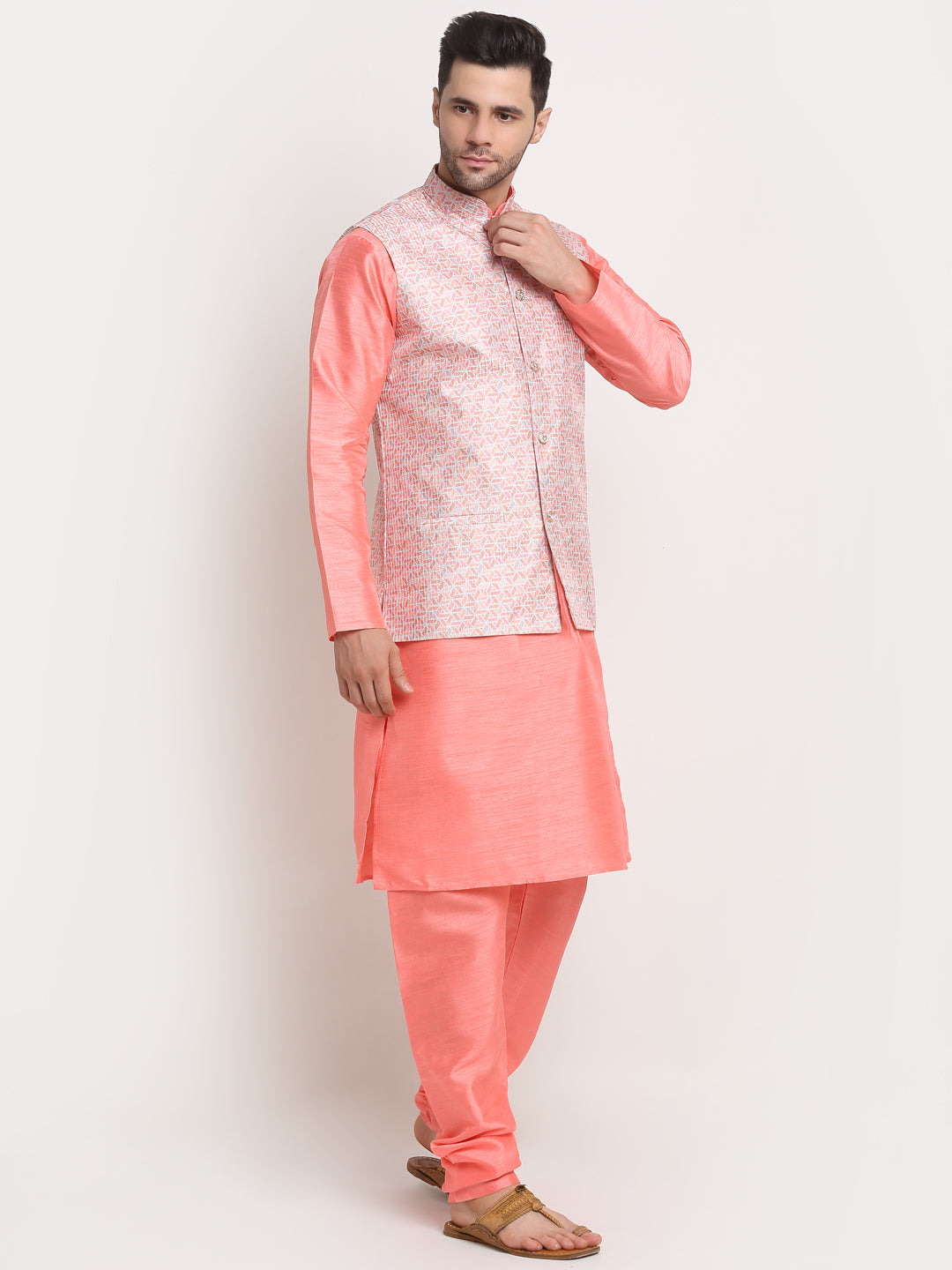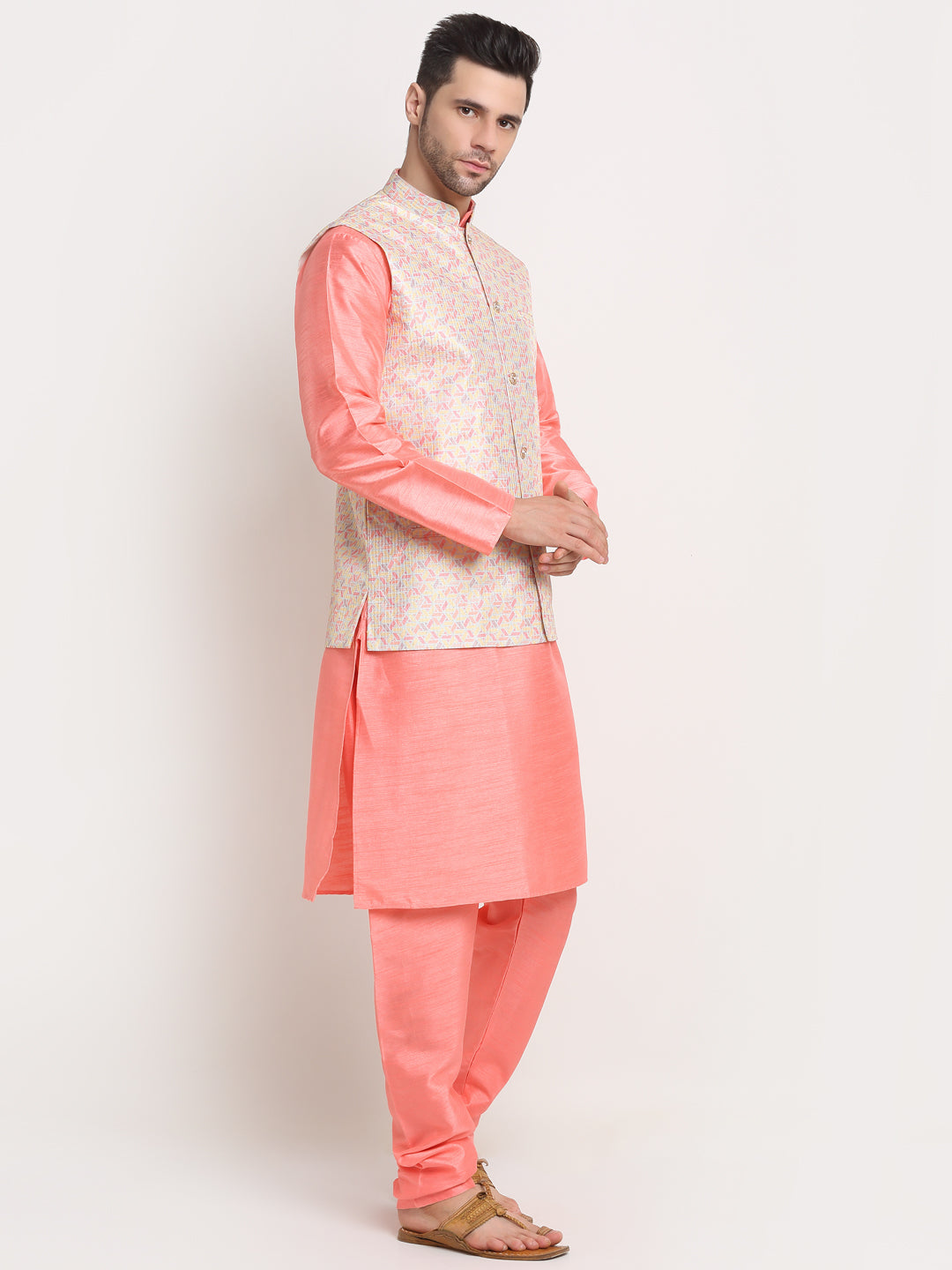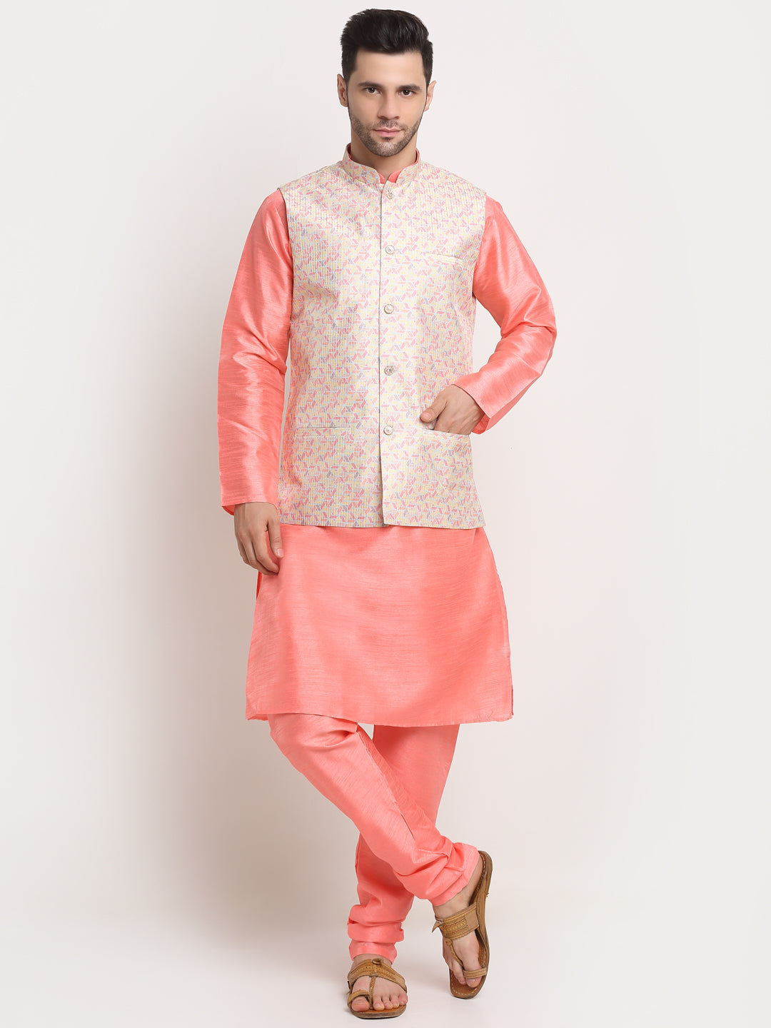 KRAFT INDIA Mens Pink Silk Blend Kurta and churidar with embroided Nehru jacket