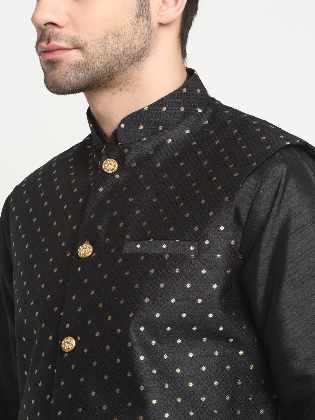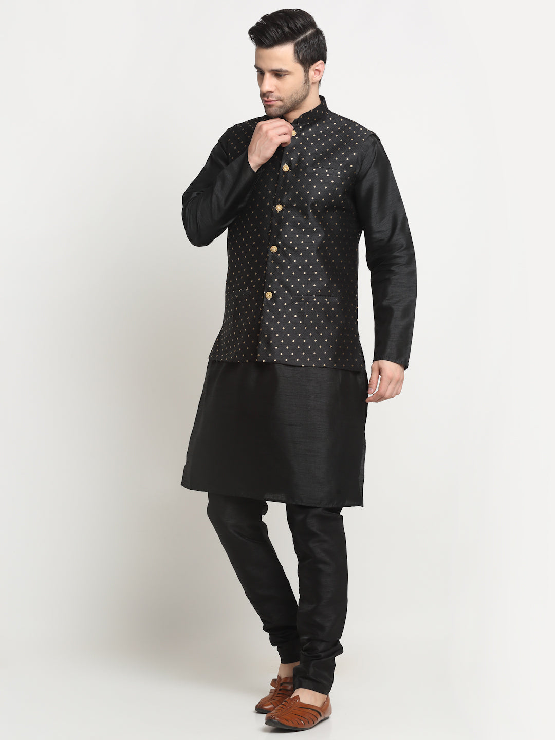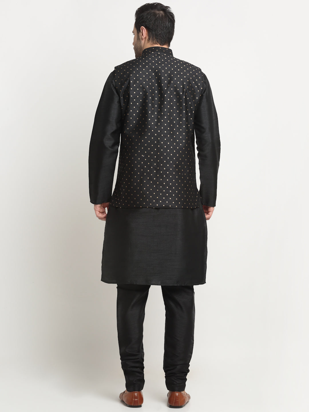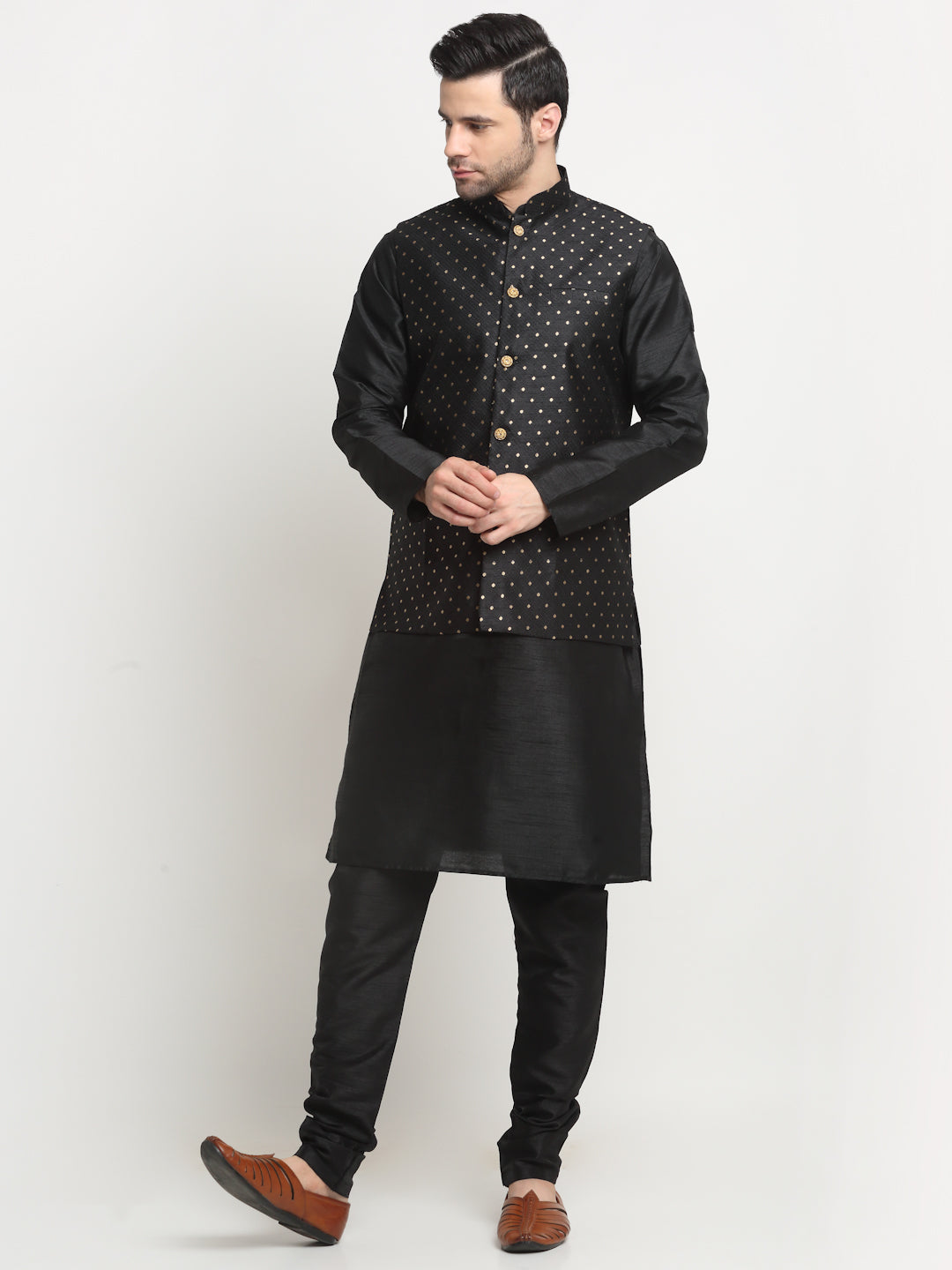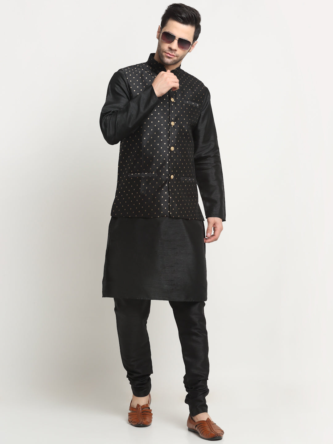 KRAFT INDIA Men's Silk Black Kurta Churidar With Polka Dotted Nehru Jacket Set