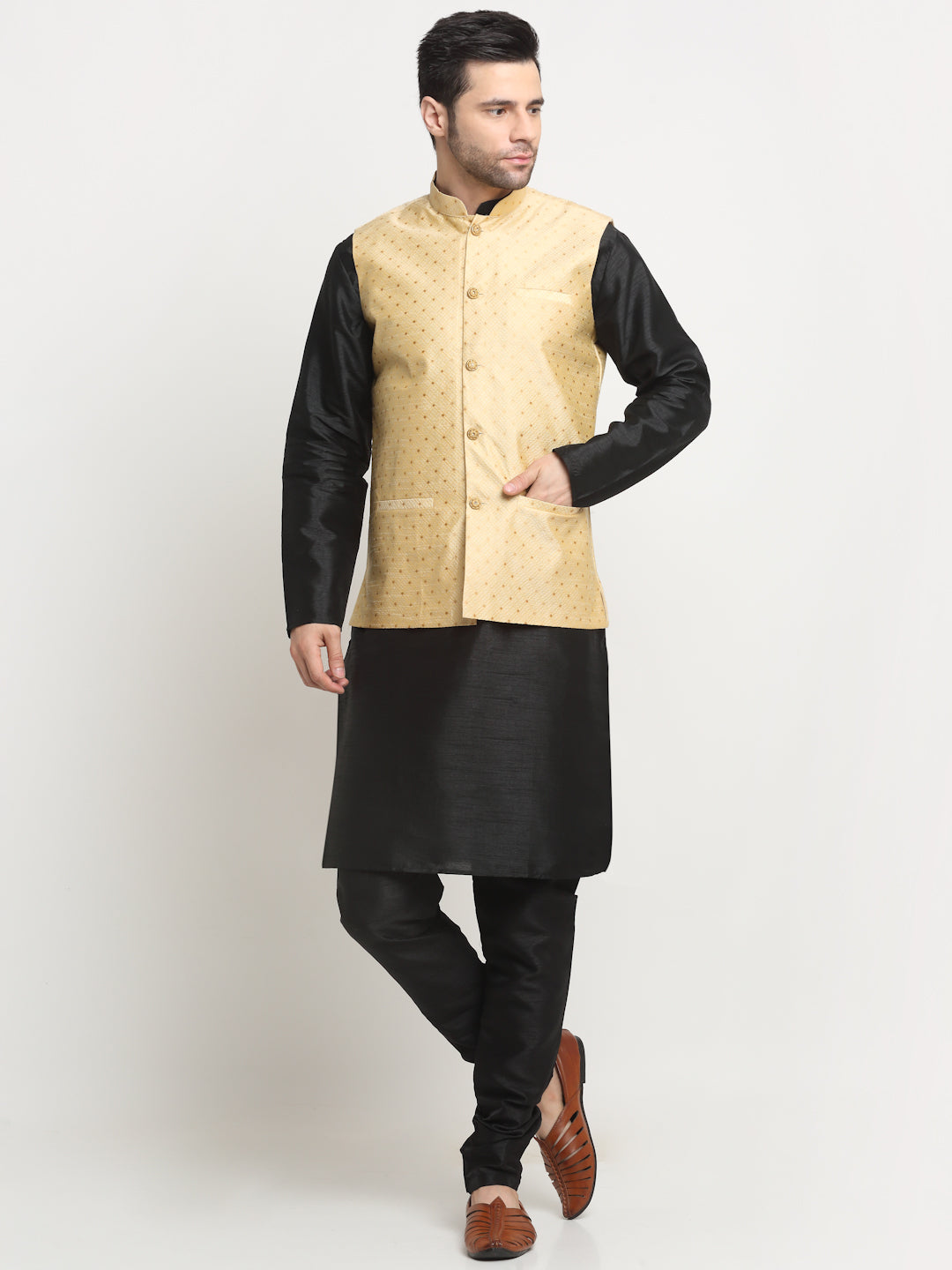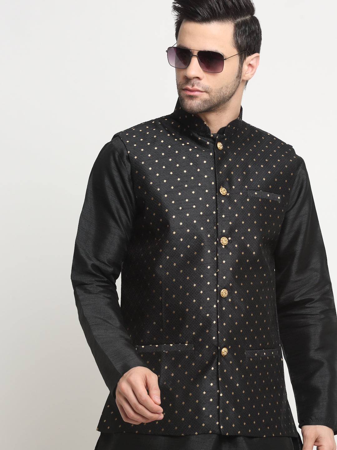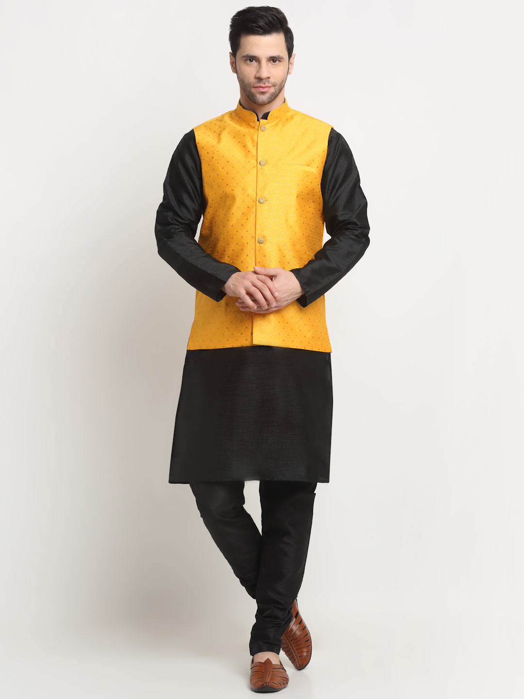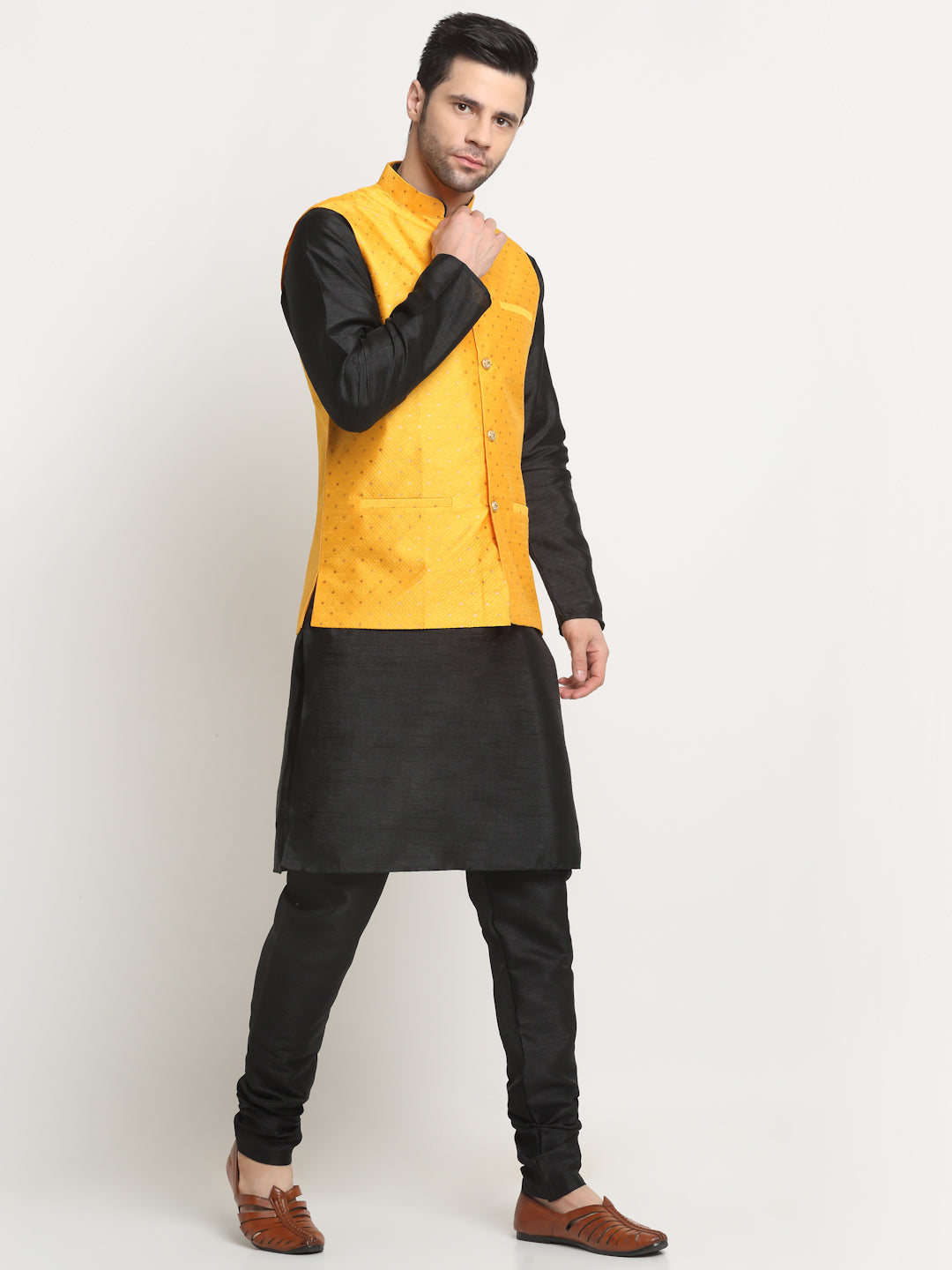 KRAFT INDIA Men's Silk Black Kurta Churidar With Polka Dotted Nehru Jacket Set