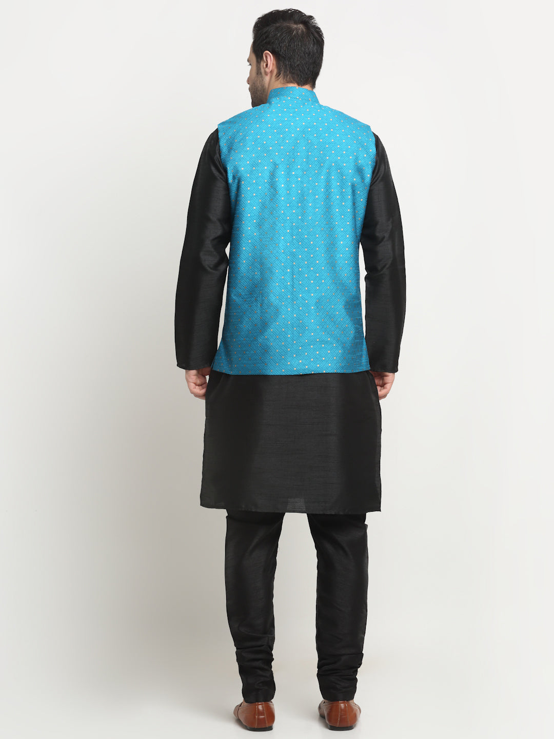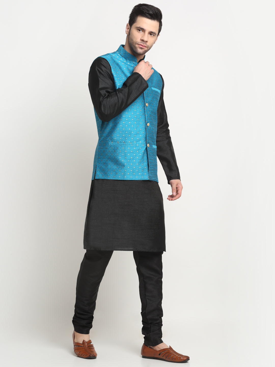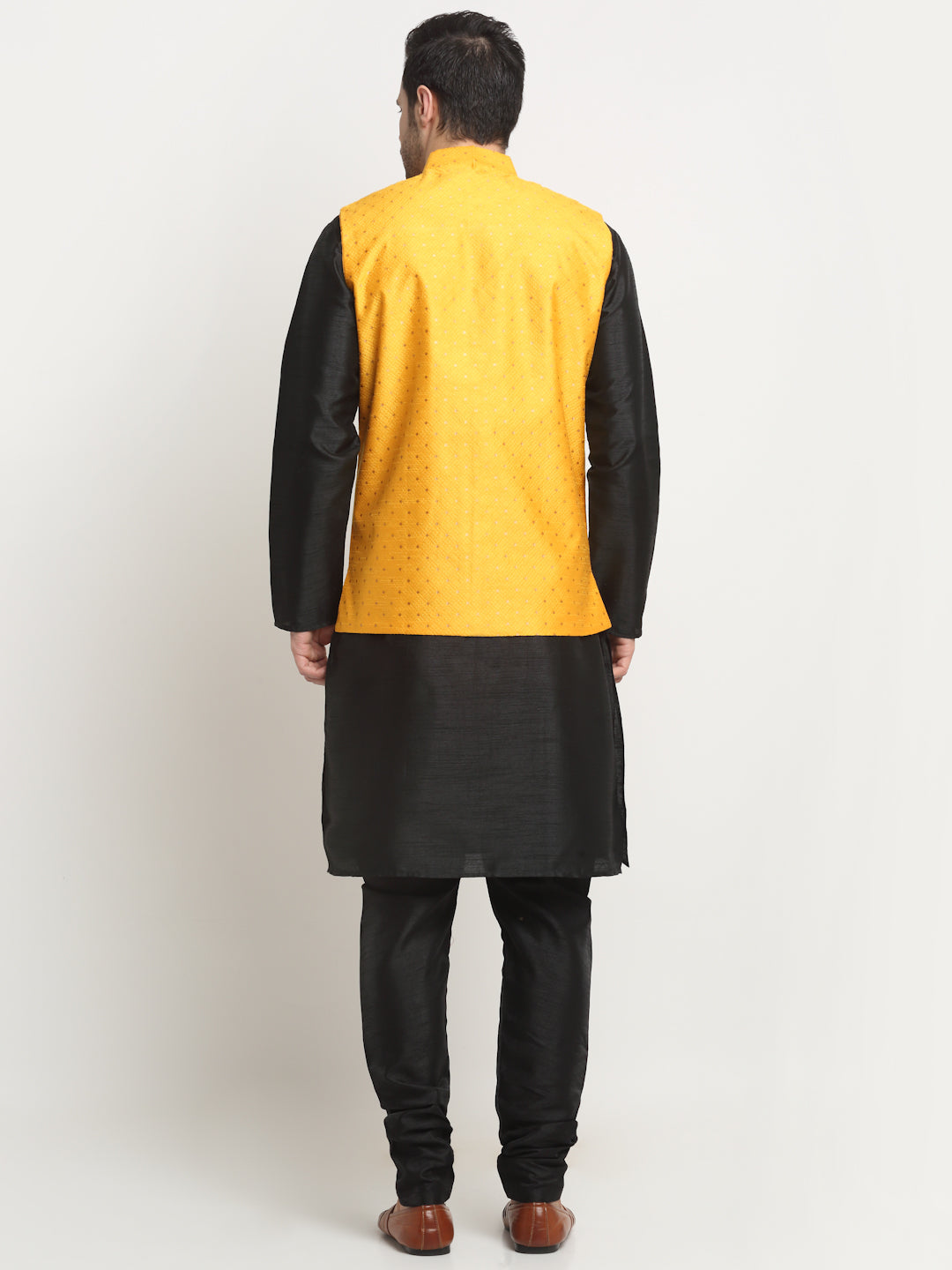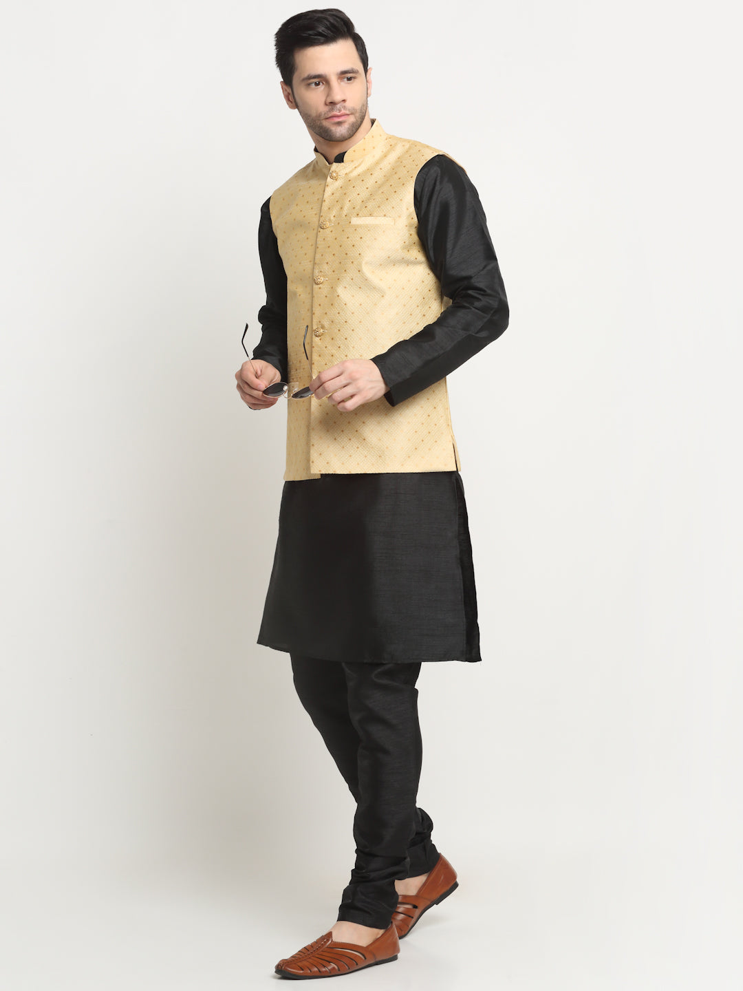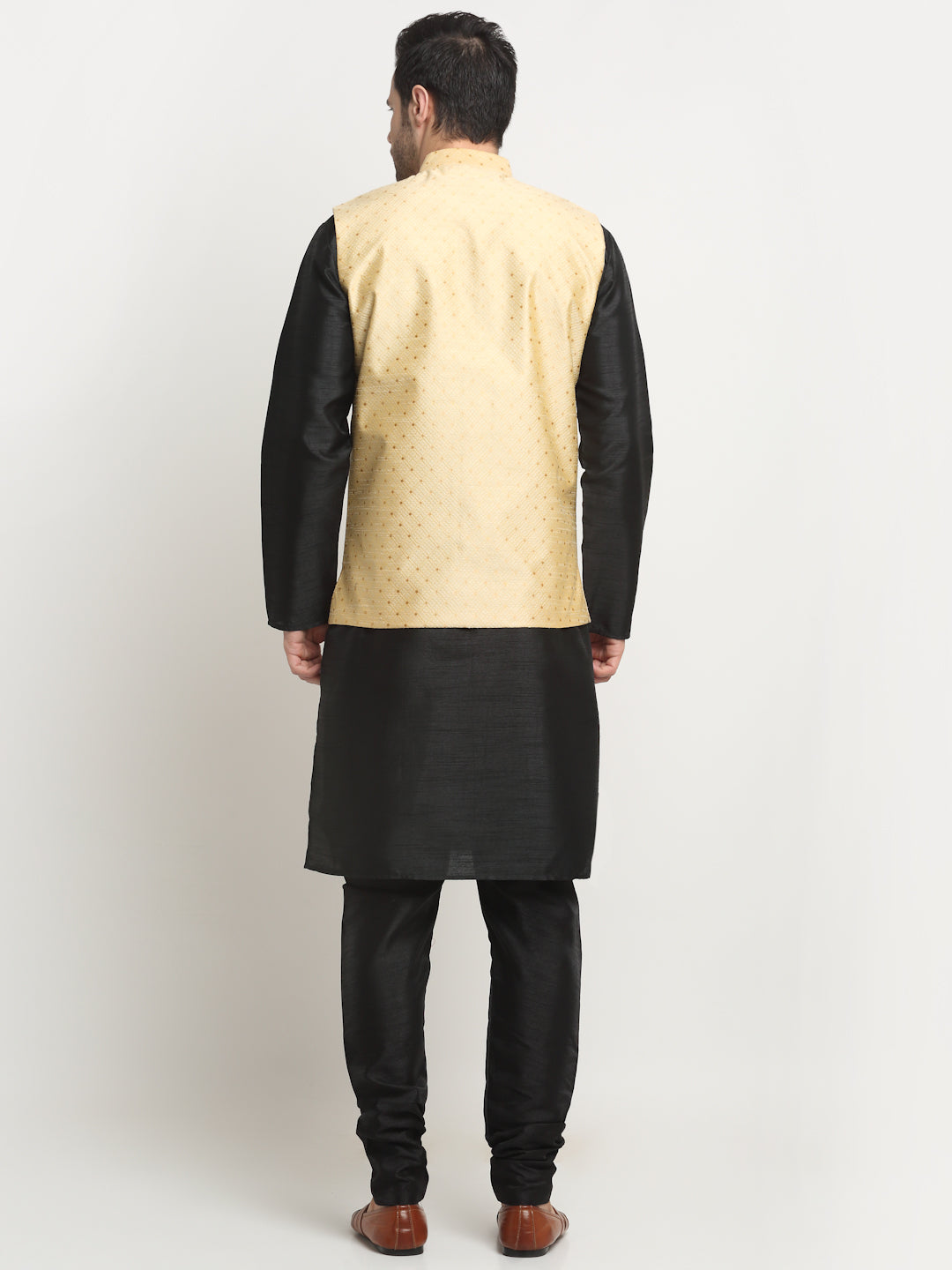 KRAFT INDIA Men's Silk Black Kurta Churidar With Polka Dotted Nehru Jacket Set