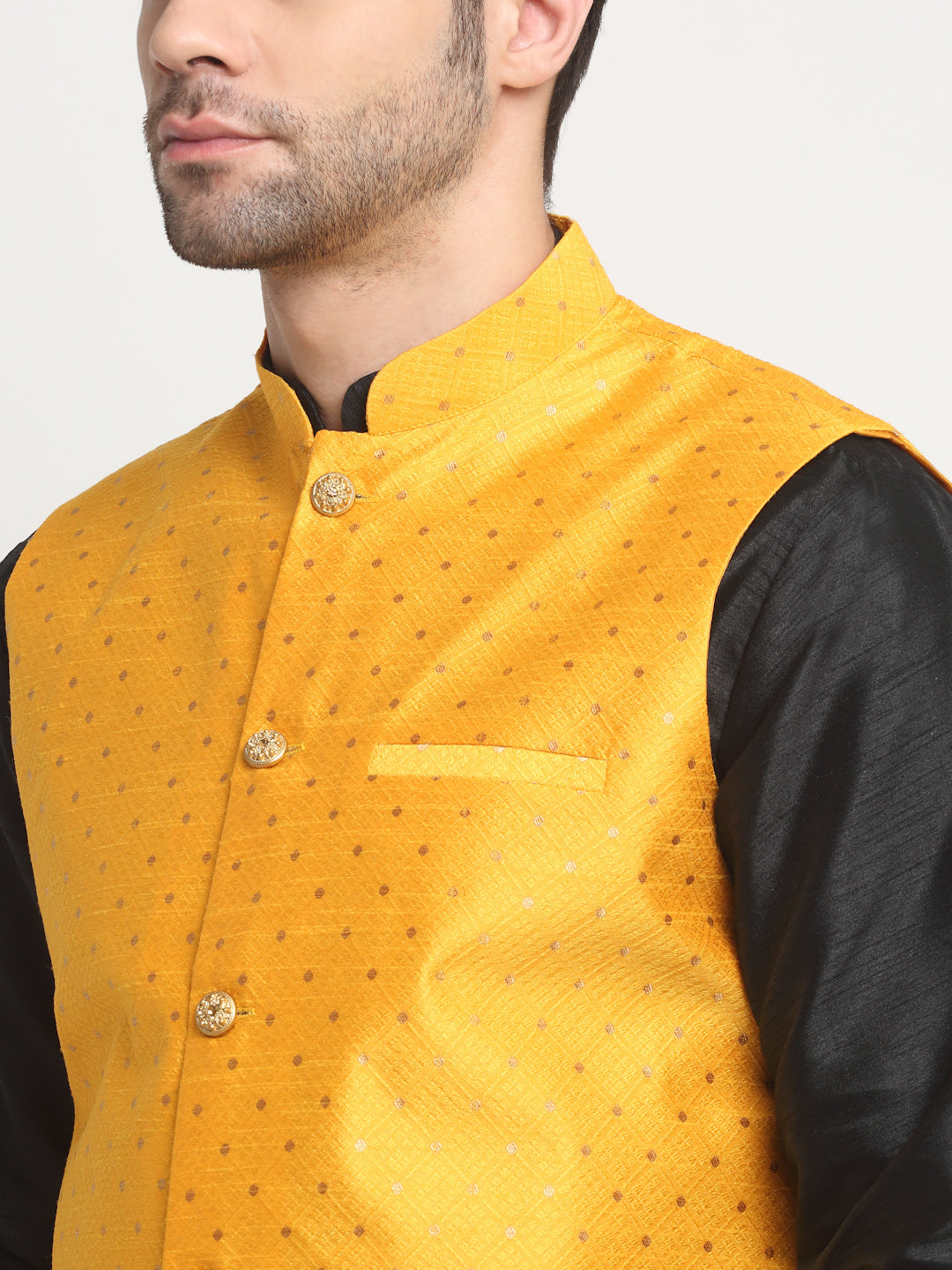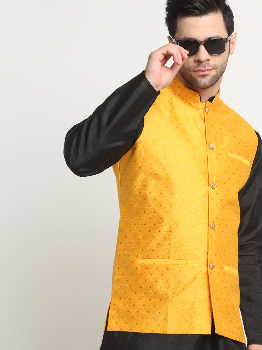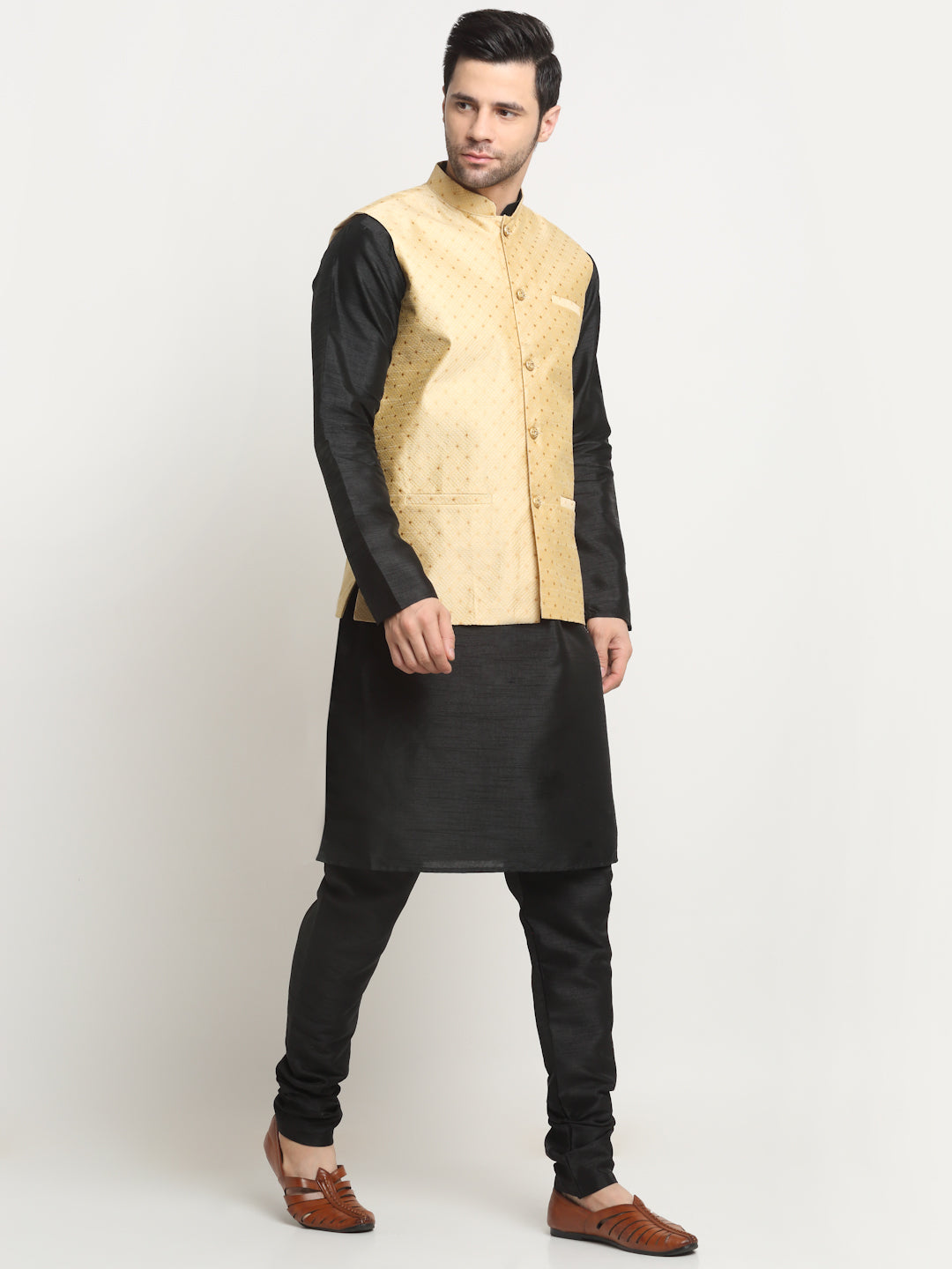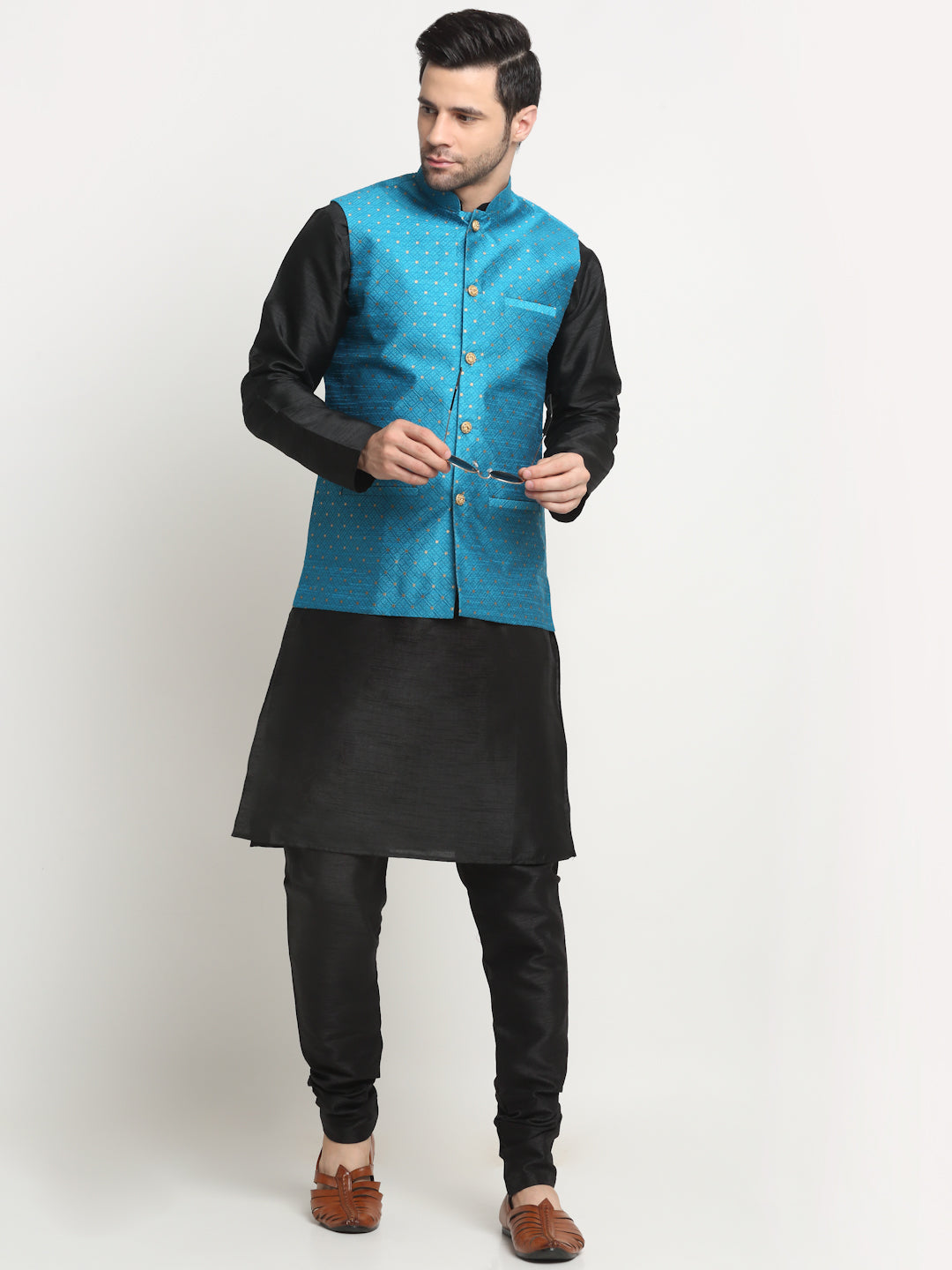 KRAFT INDIA Men's Silk Black Kurta Churidar With Polka Dotted Nehru Jacket Set