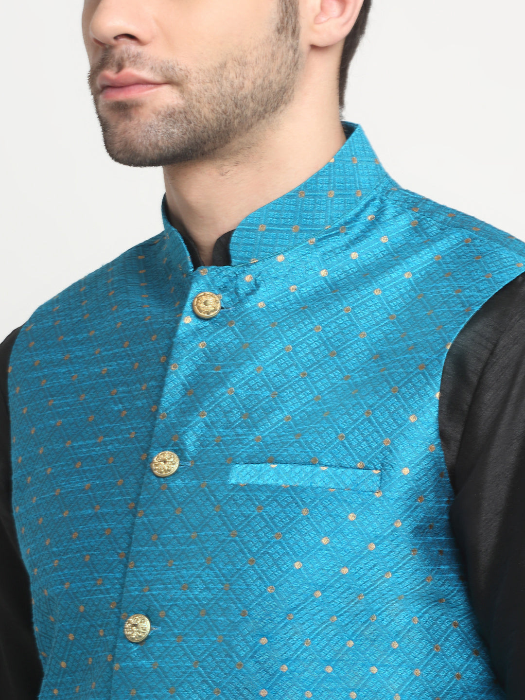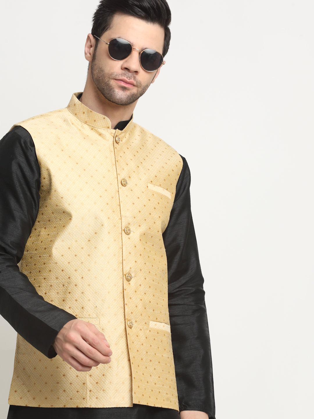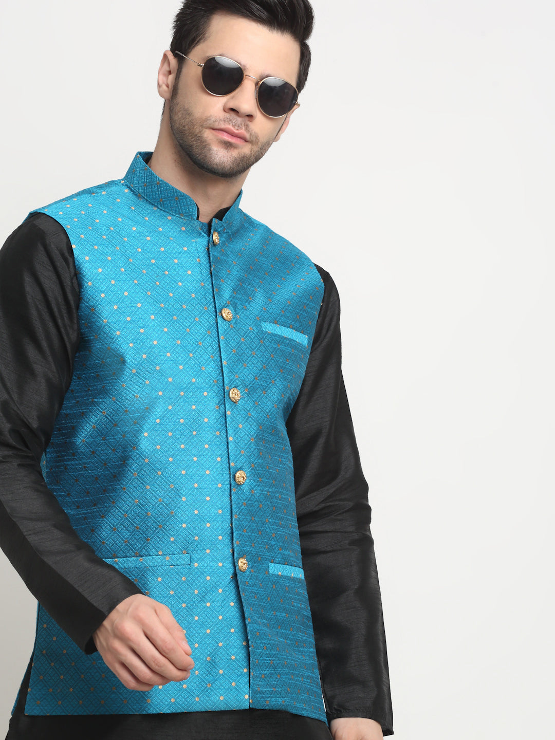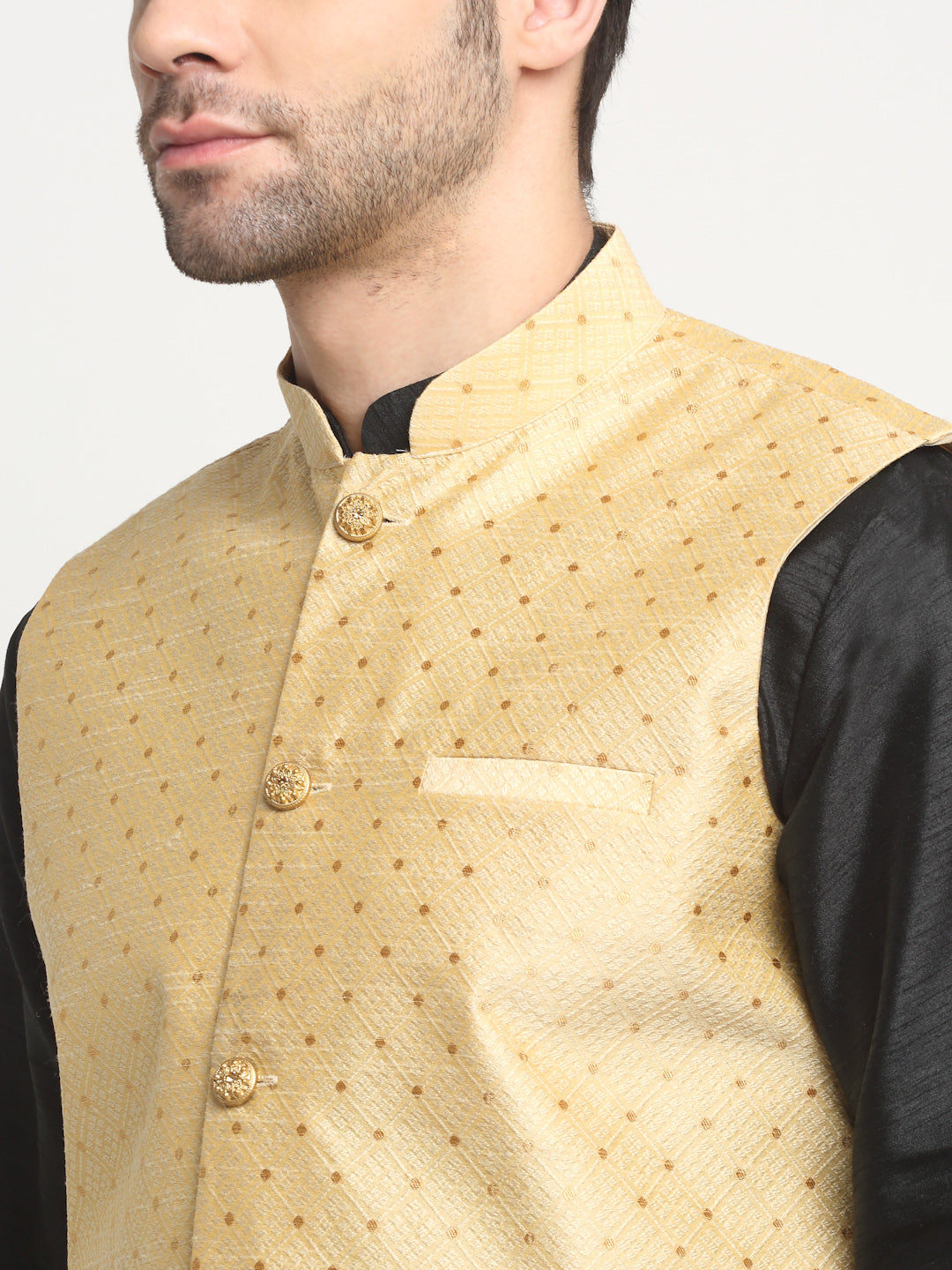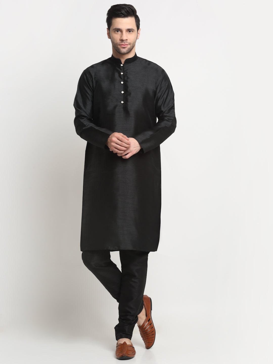 KRAFT INDIA Men's Silk Black Kurta Churidar With Polka Dotted Nehru Jacket Set