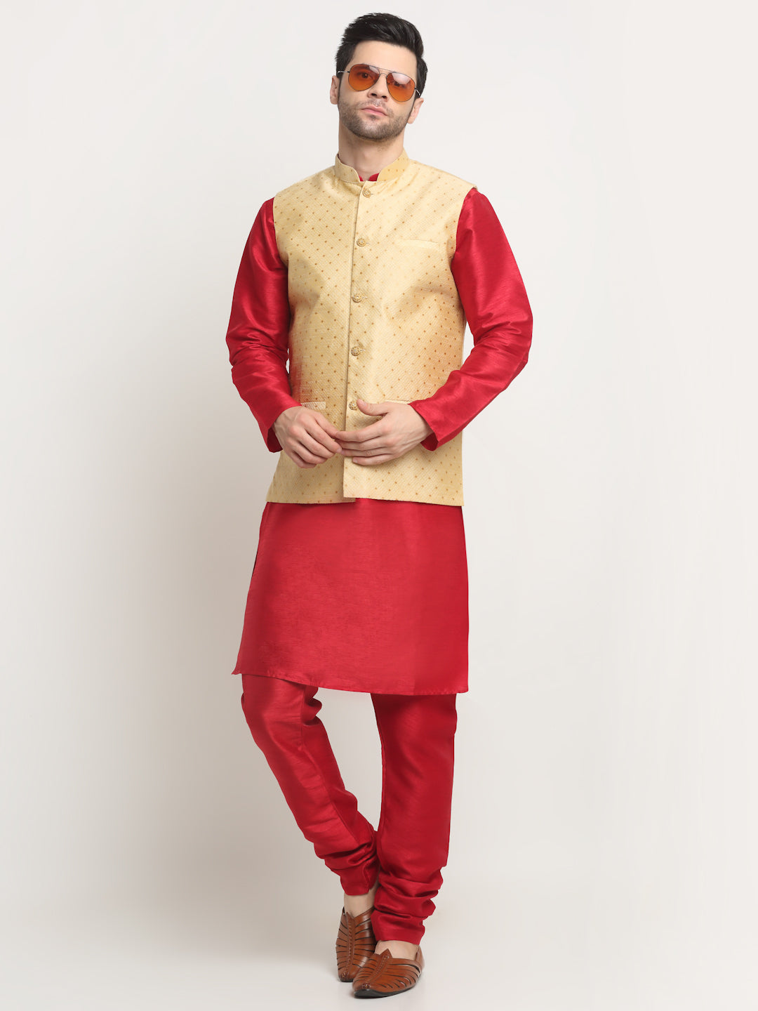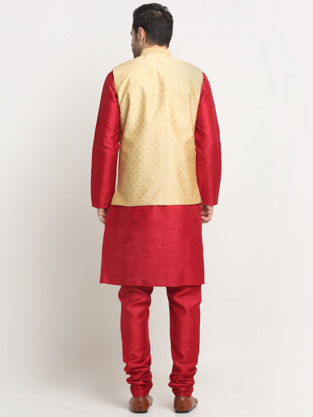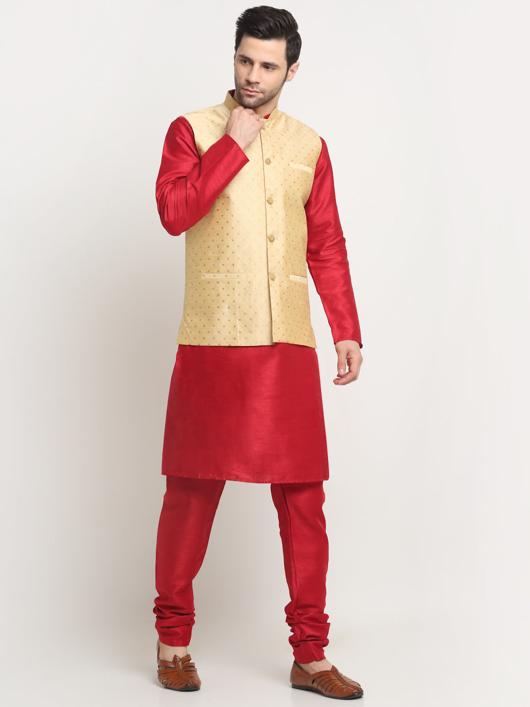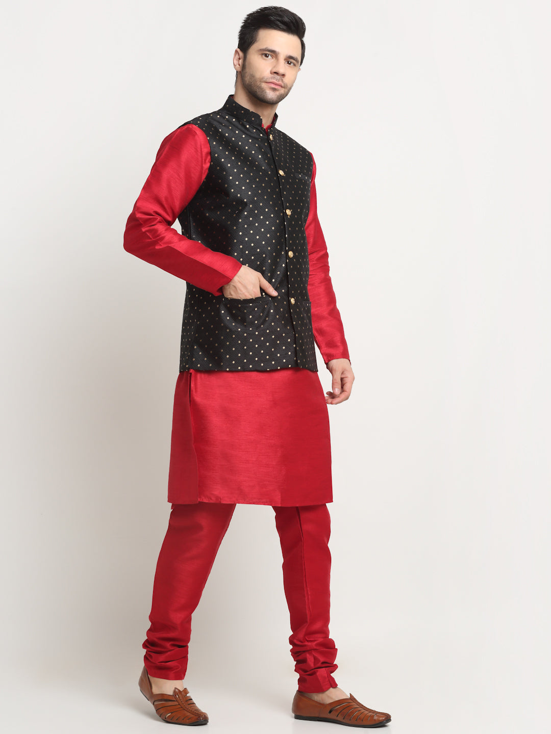 KRAFT INDIA Men's Silk Maroon Kurta Churidar With Polka Dotted Nehru Jacket Set