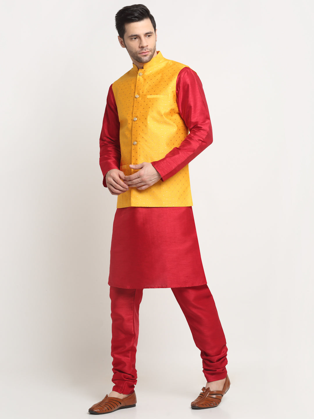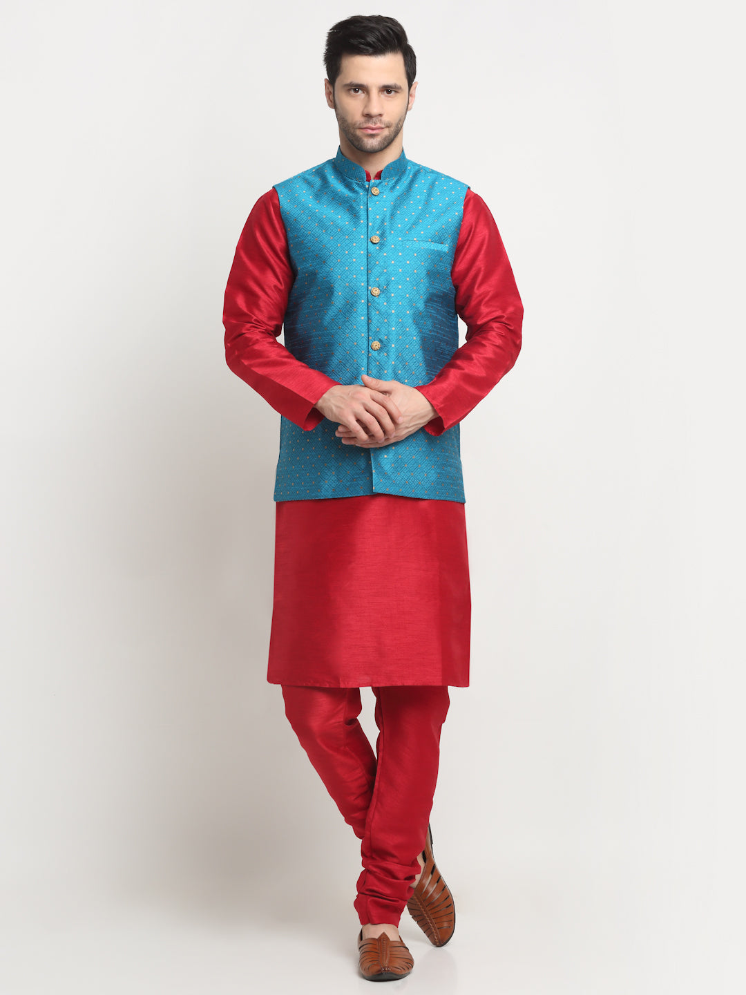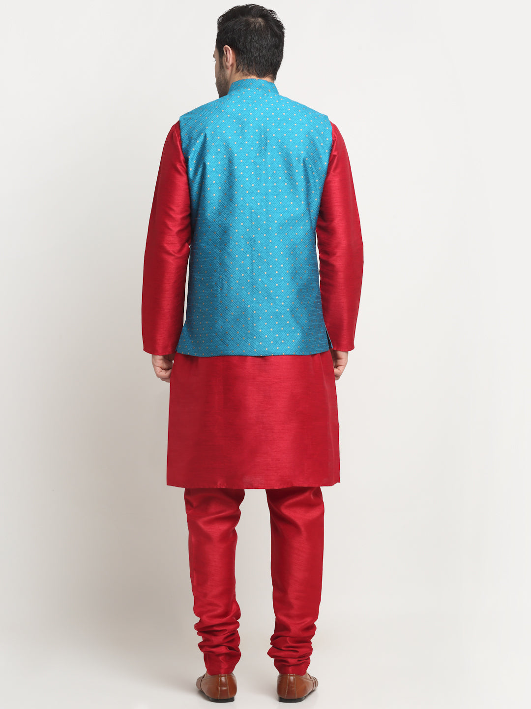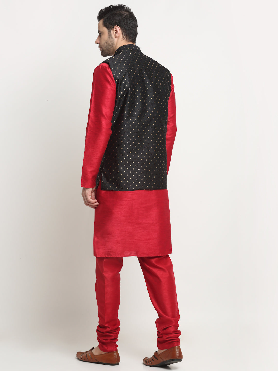 KRAFT INDIA Men's Silk Maroon Kurta Churidar With Polka Dotted Nehru Jacket Set
