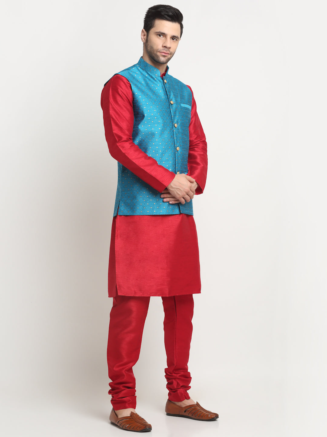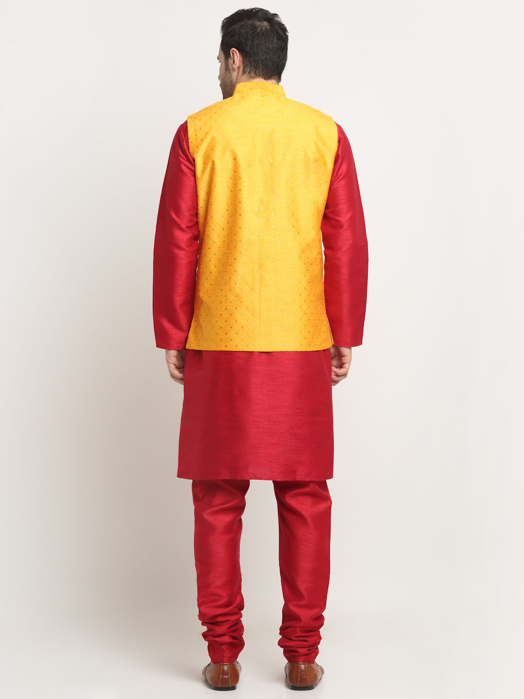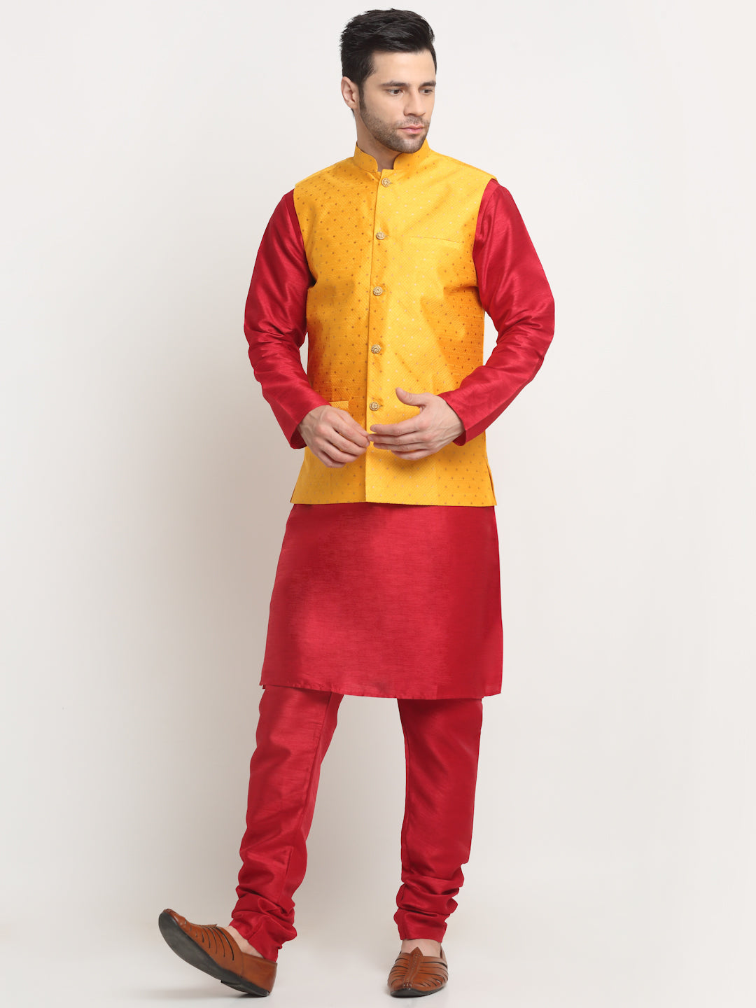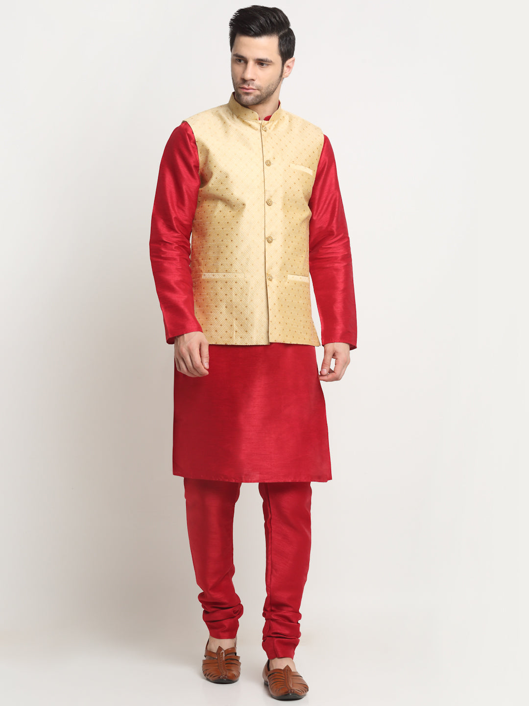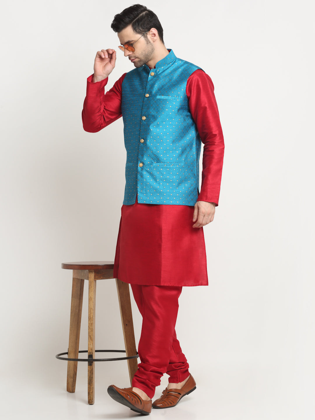 KRAFT INDIA Men's Silk Maroon Kurta Churidar With Polka Dotted Nehru Jacket Set