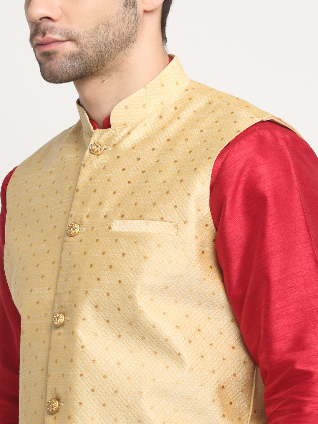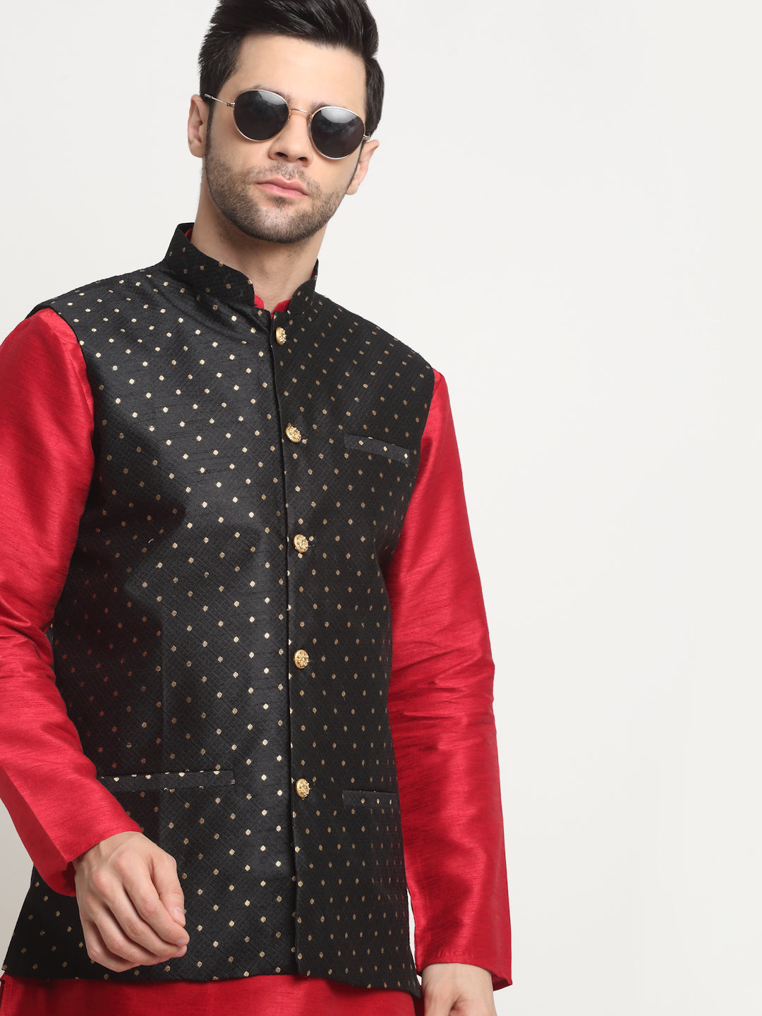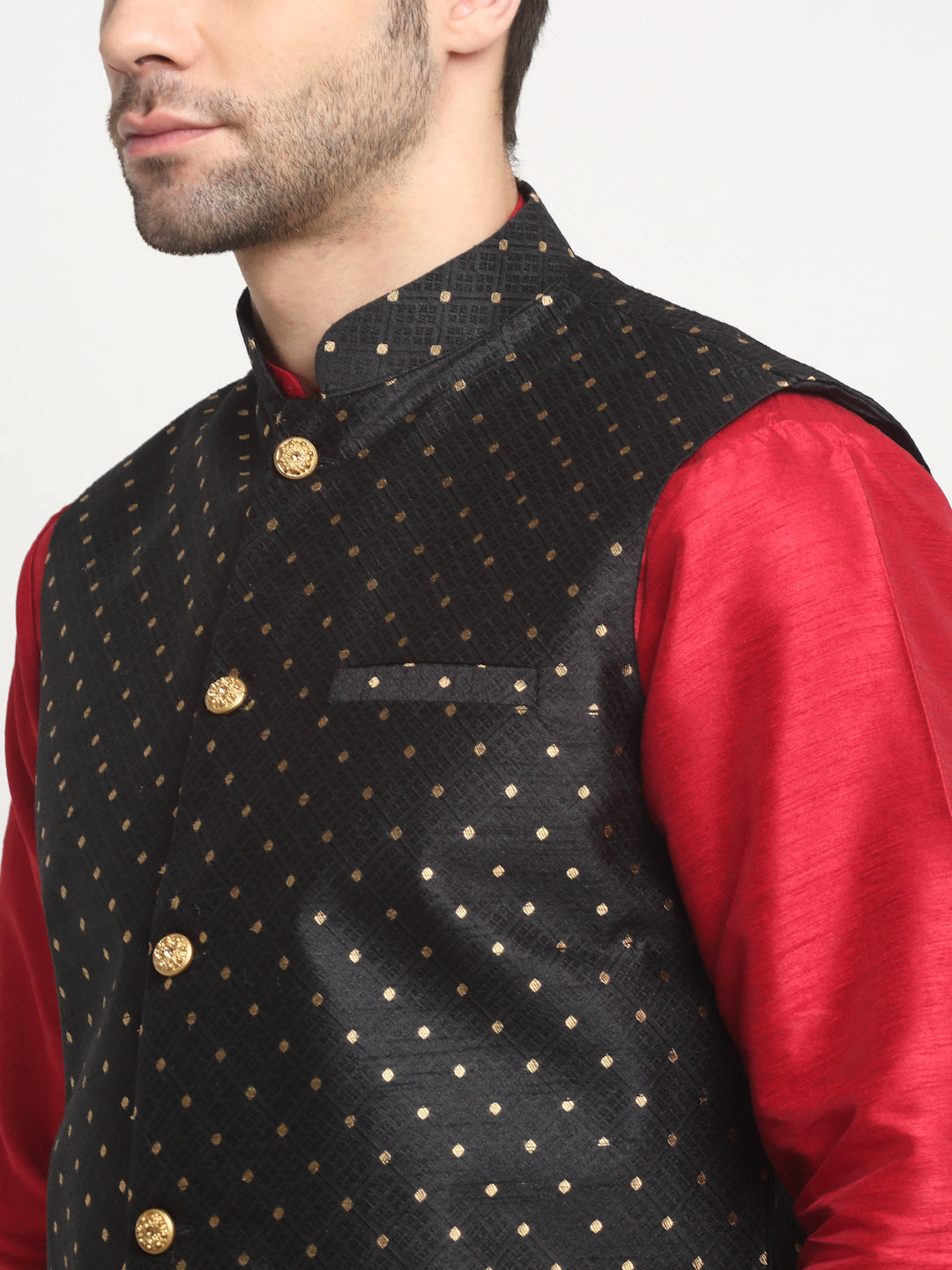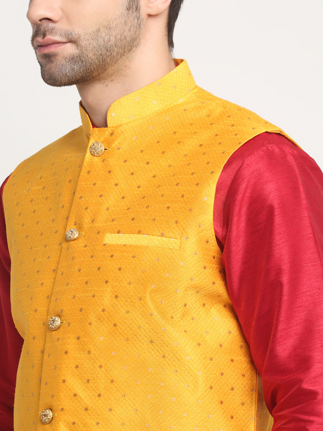 KRAFT INDIA Men's Silk Maroon Kurta Churidar With Polka Dotted Nehru Jacket Set