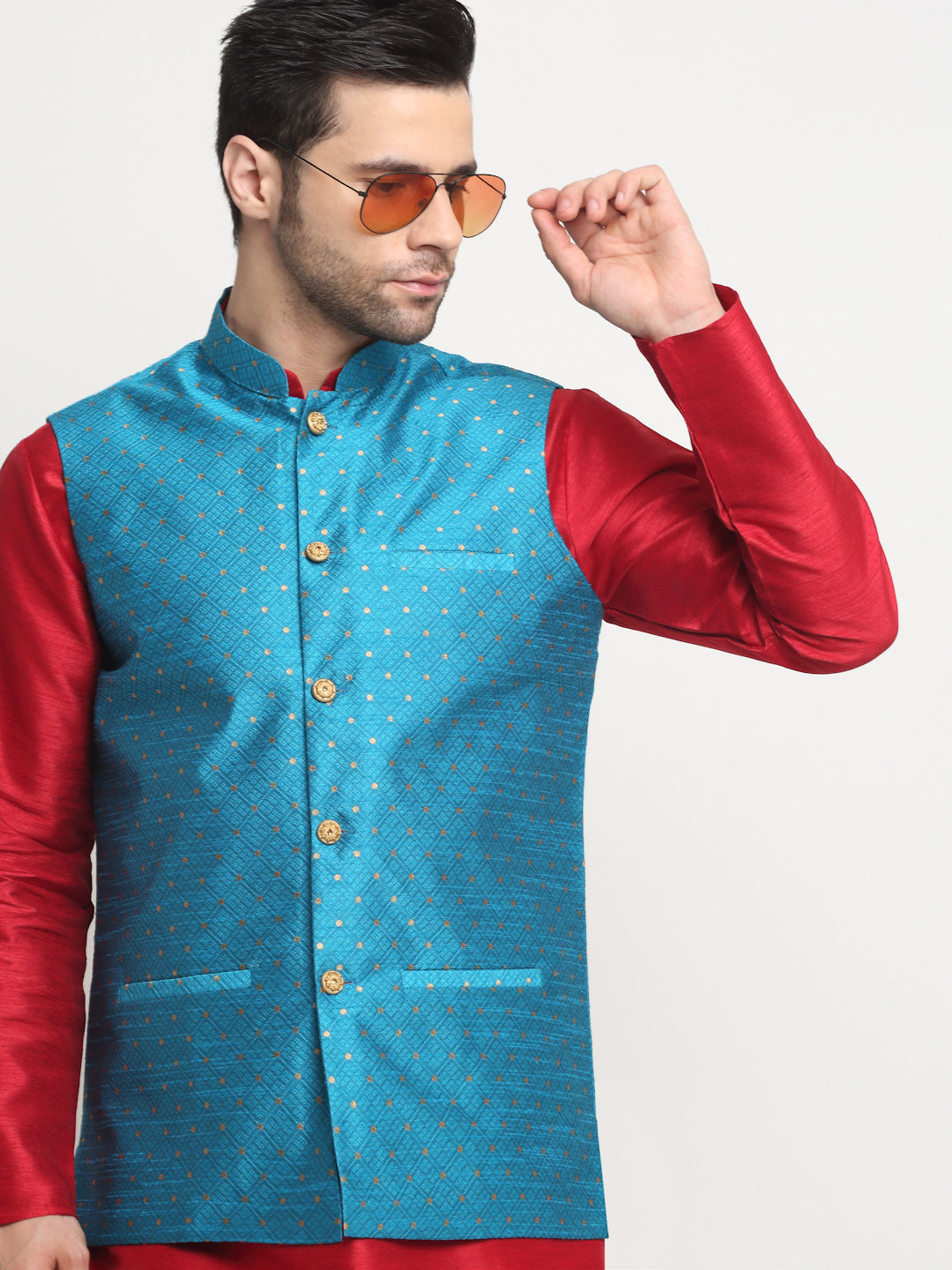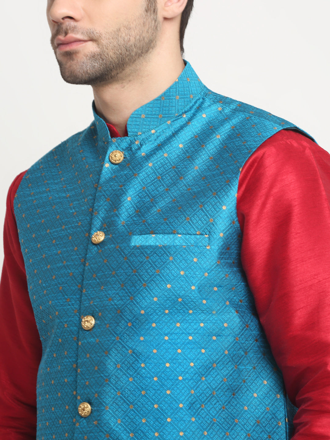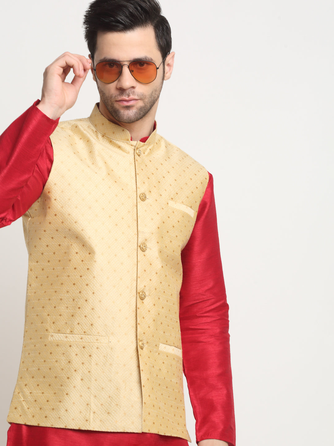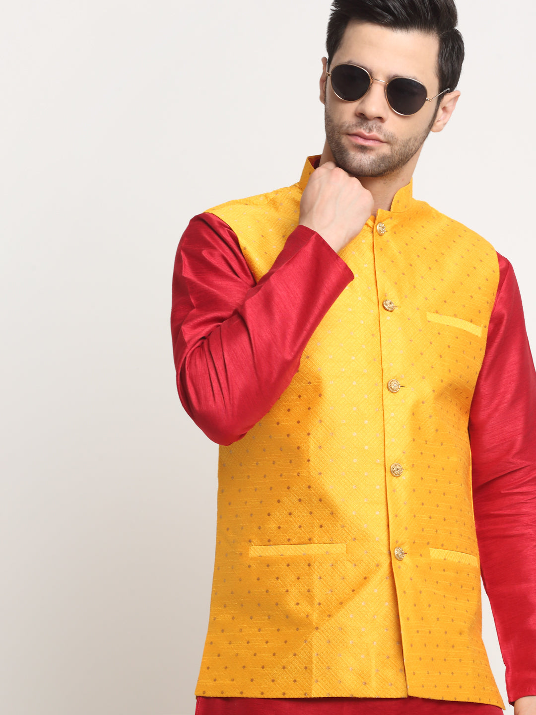 KRAFT INDIA Men's Silk Maroon Kurta Churidar With Polka Dotted Nehru Jacket Set