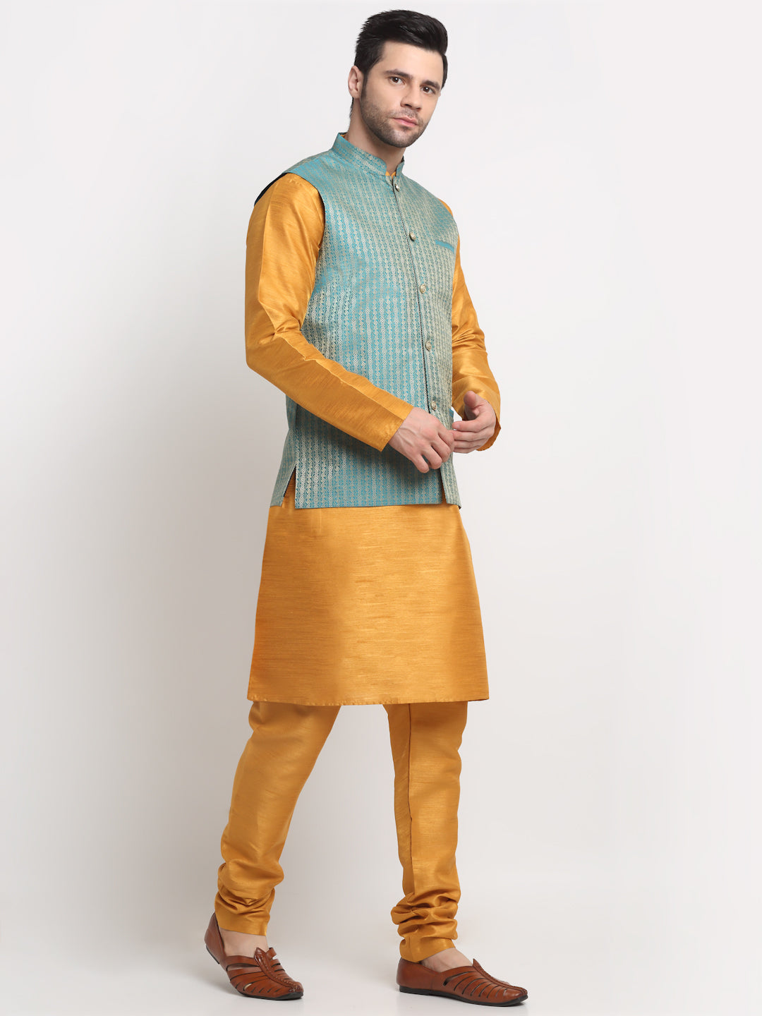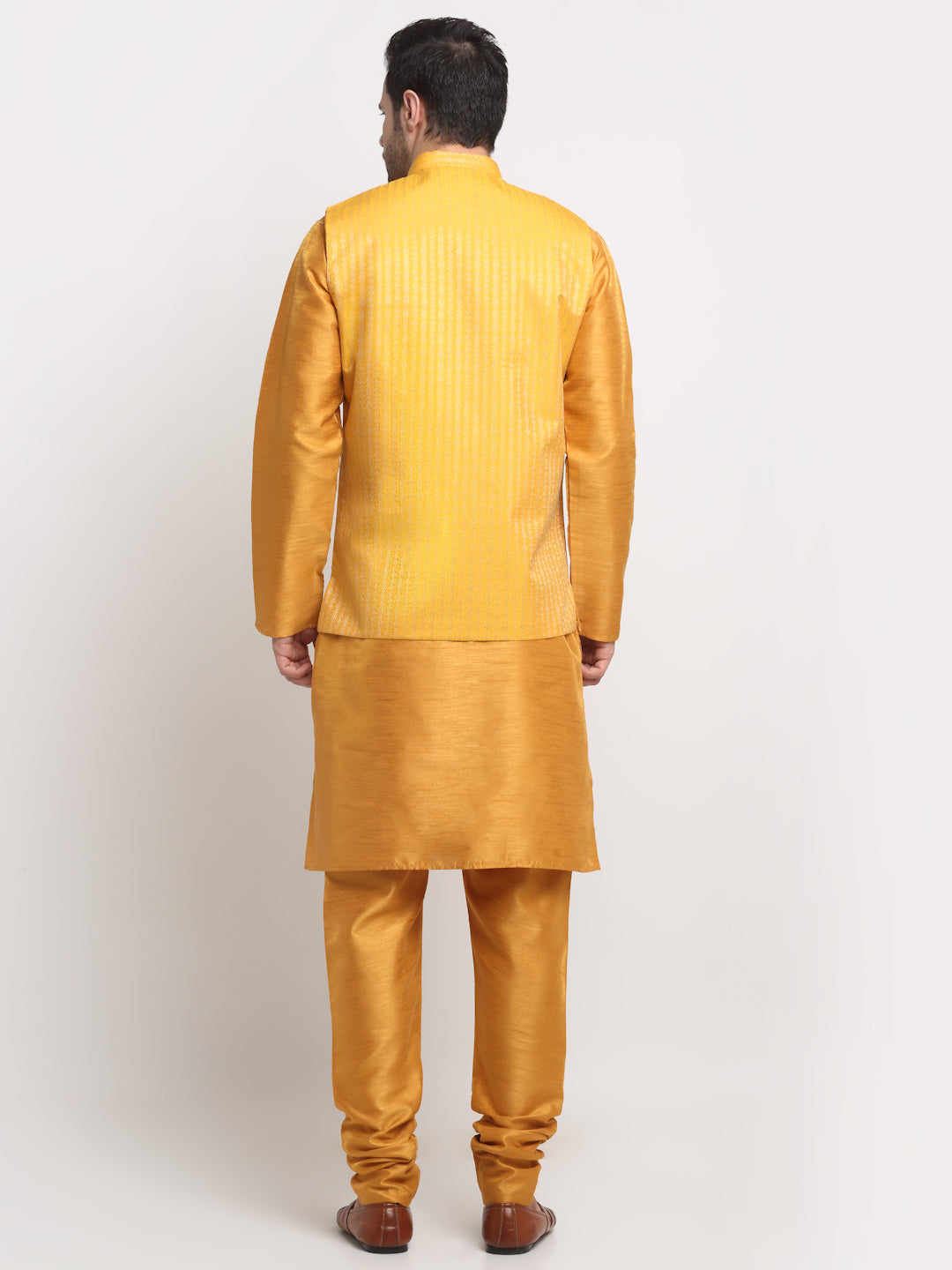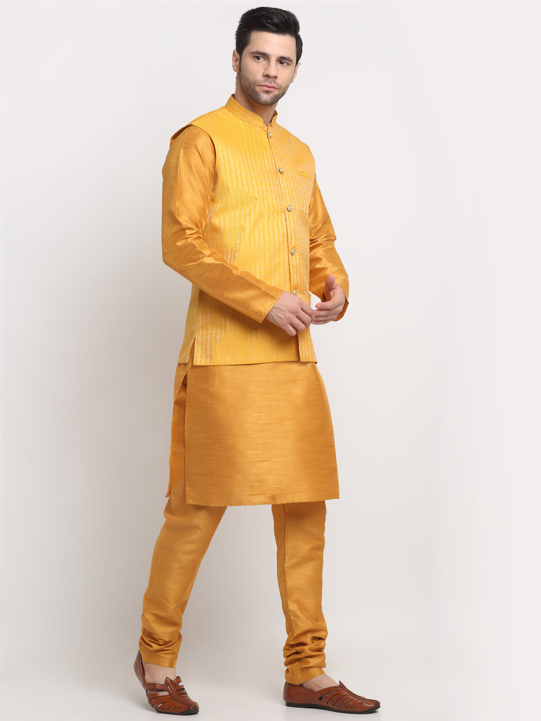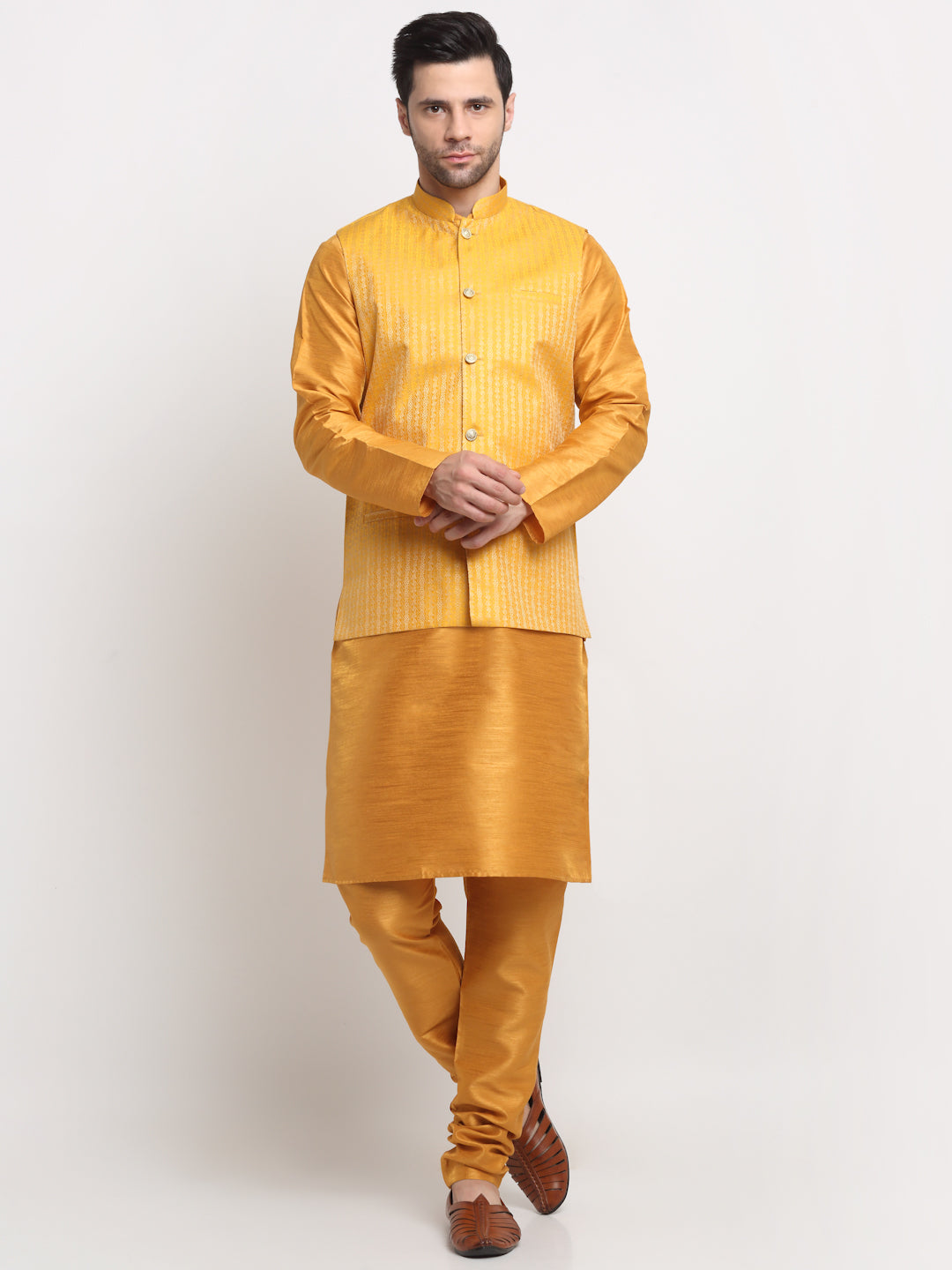 KRAFT INDIA Men's Silk Mustard Kurta Churidar with Nehru Jacket Set