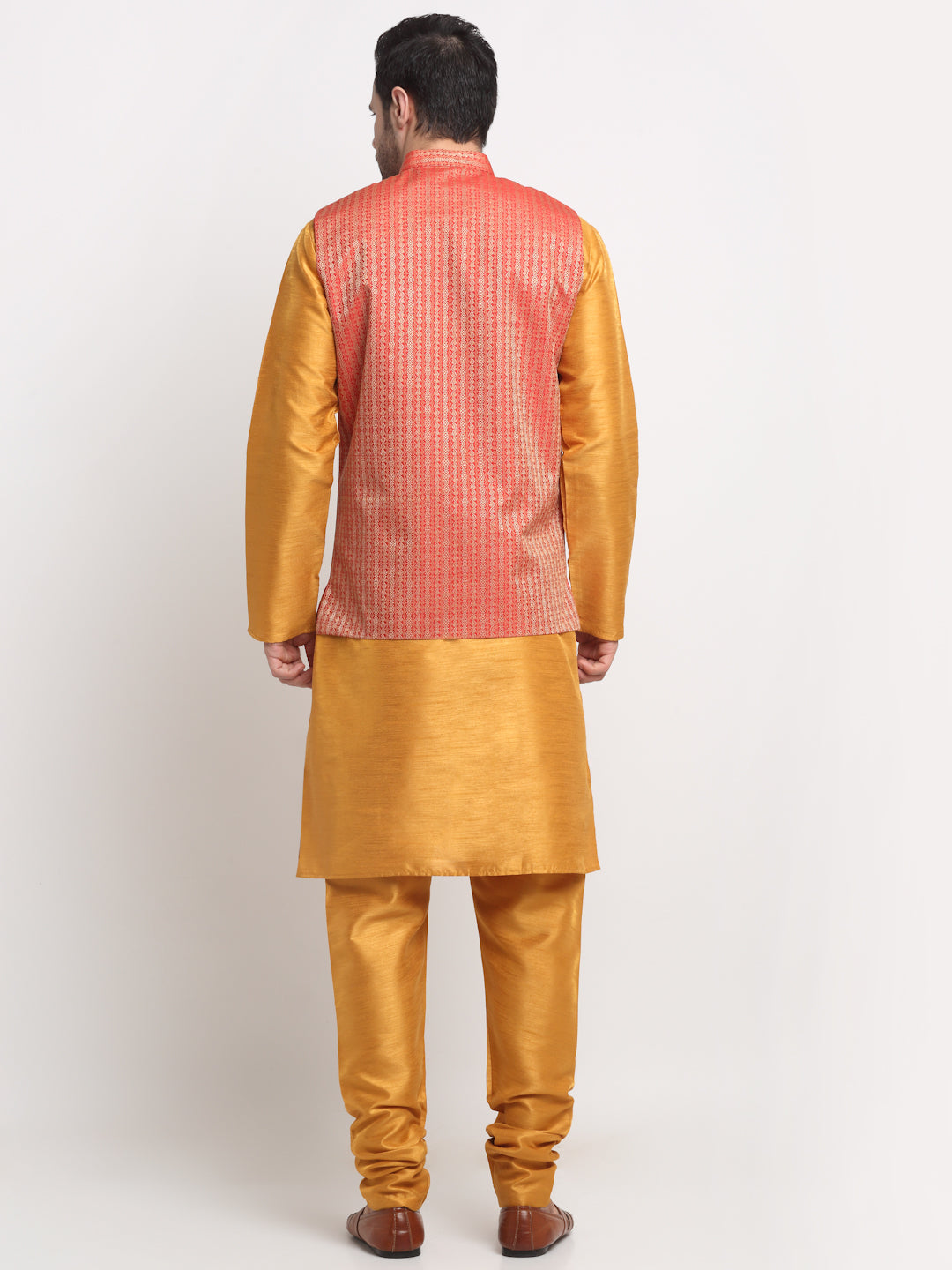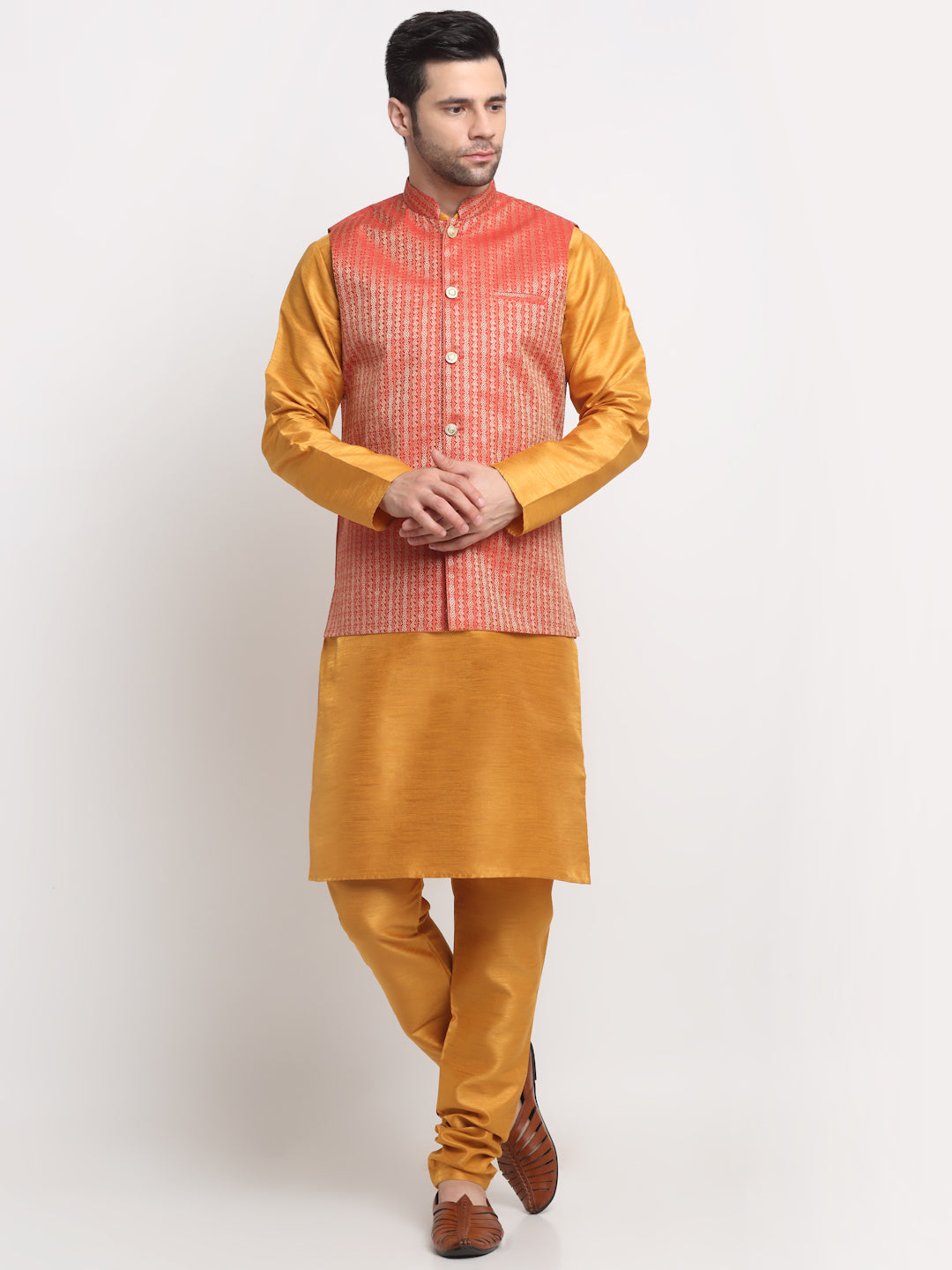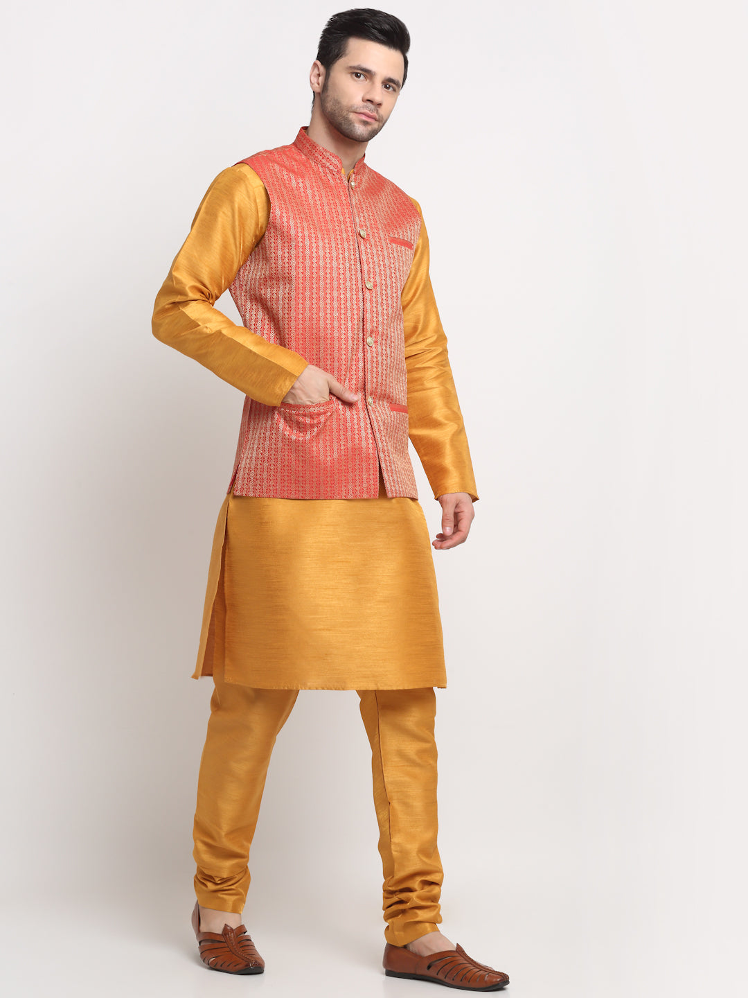 KRAFT INDIA Men's Silk Mustard Kurta Churidar with Nehru Jacket Set