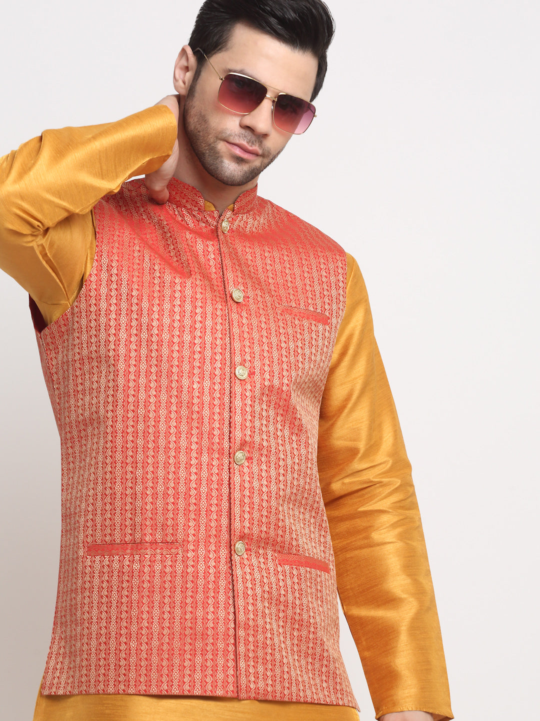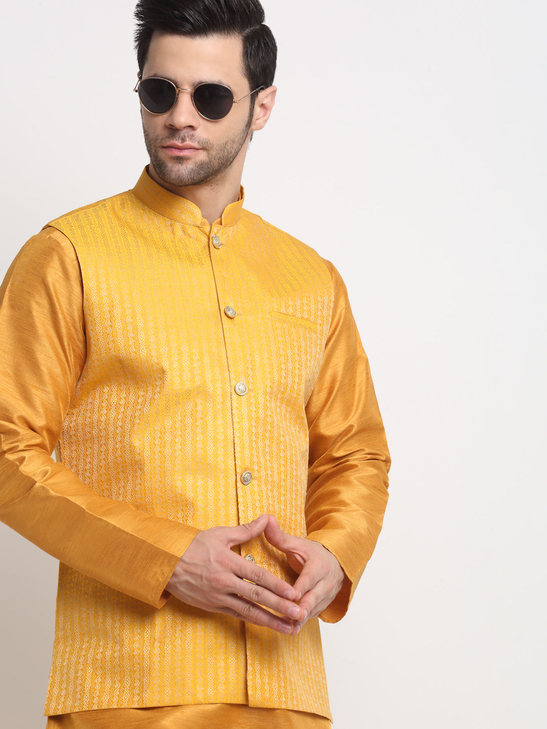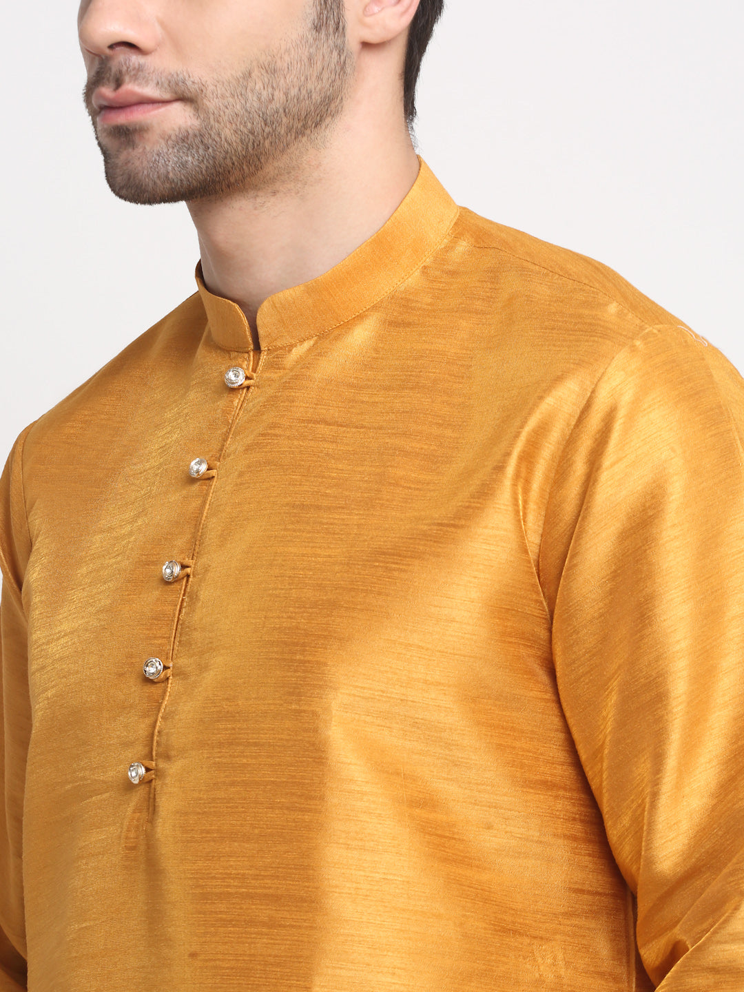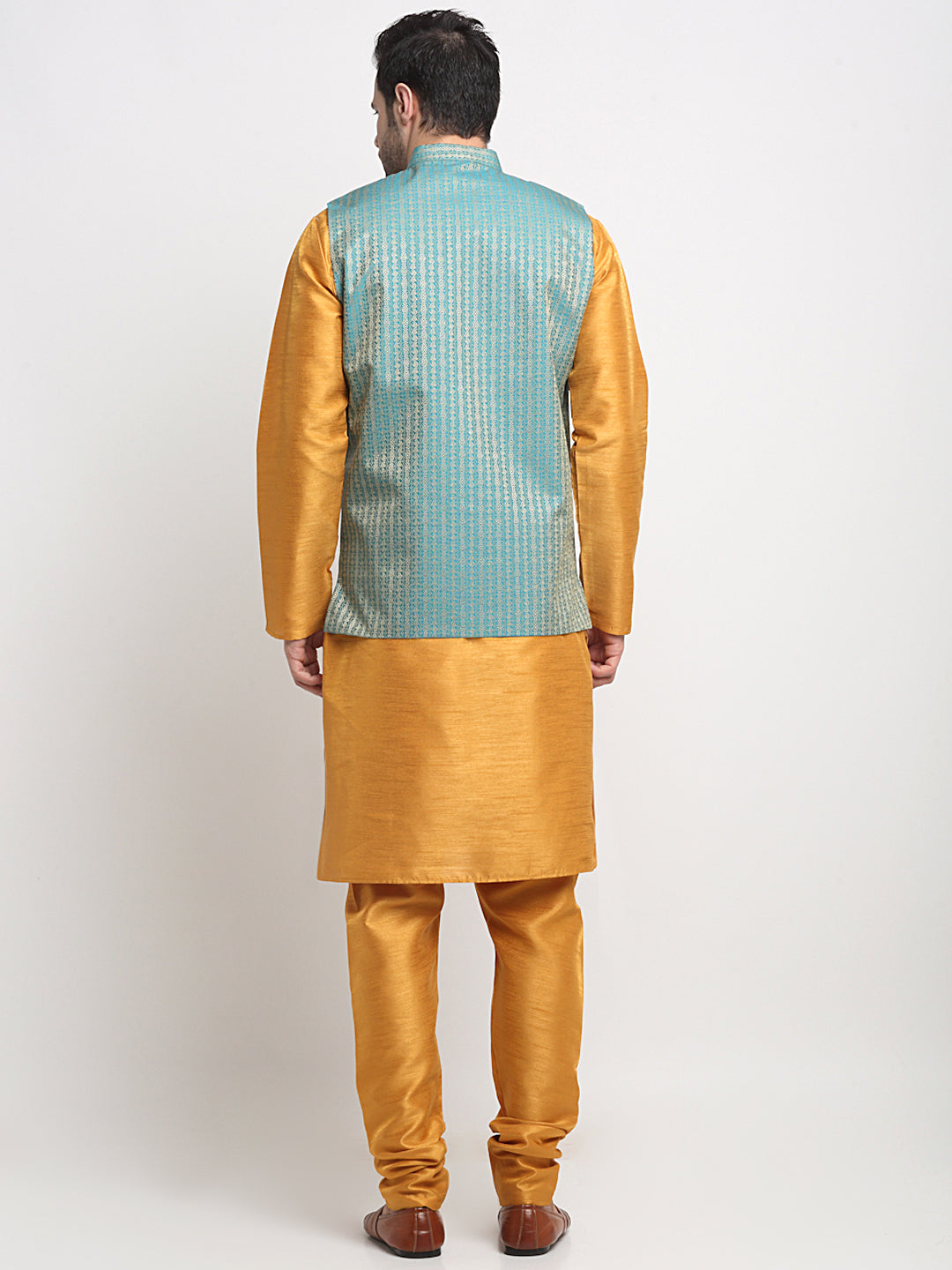 KRAFT INDIA Men's Silk Mustard Kurta Churidar with Nehru Jacket Set