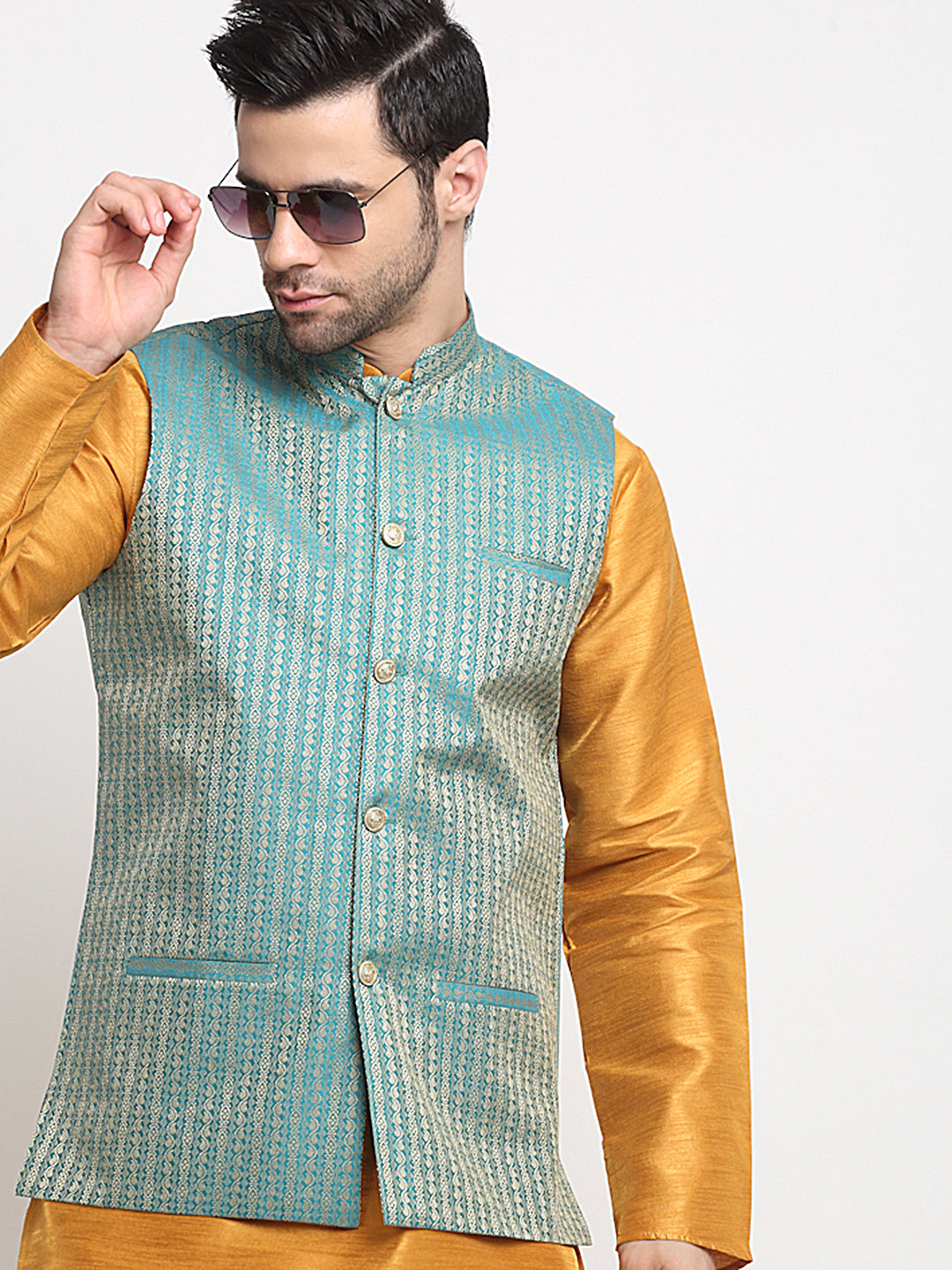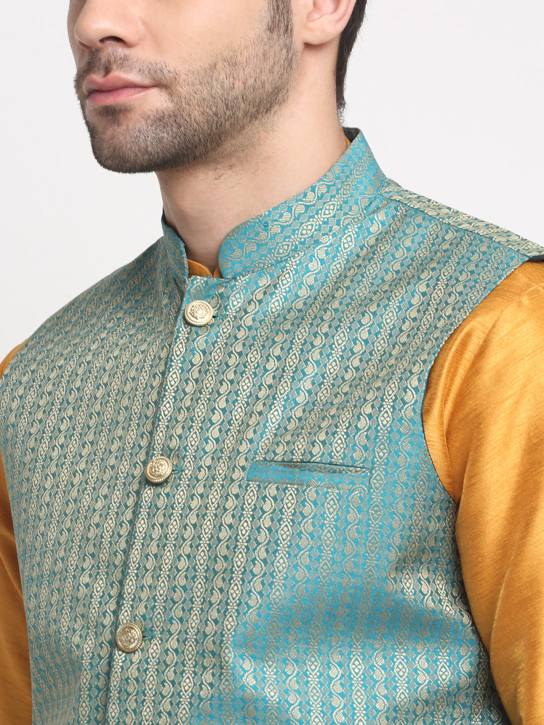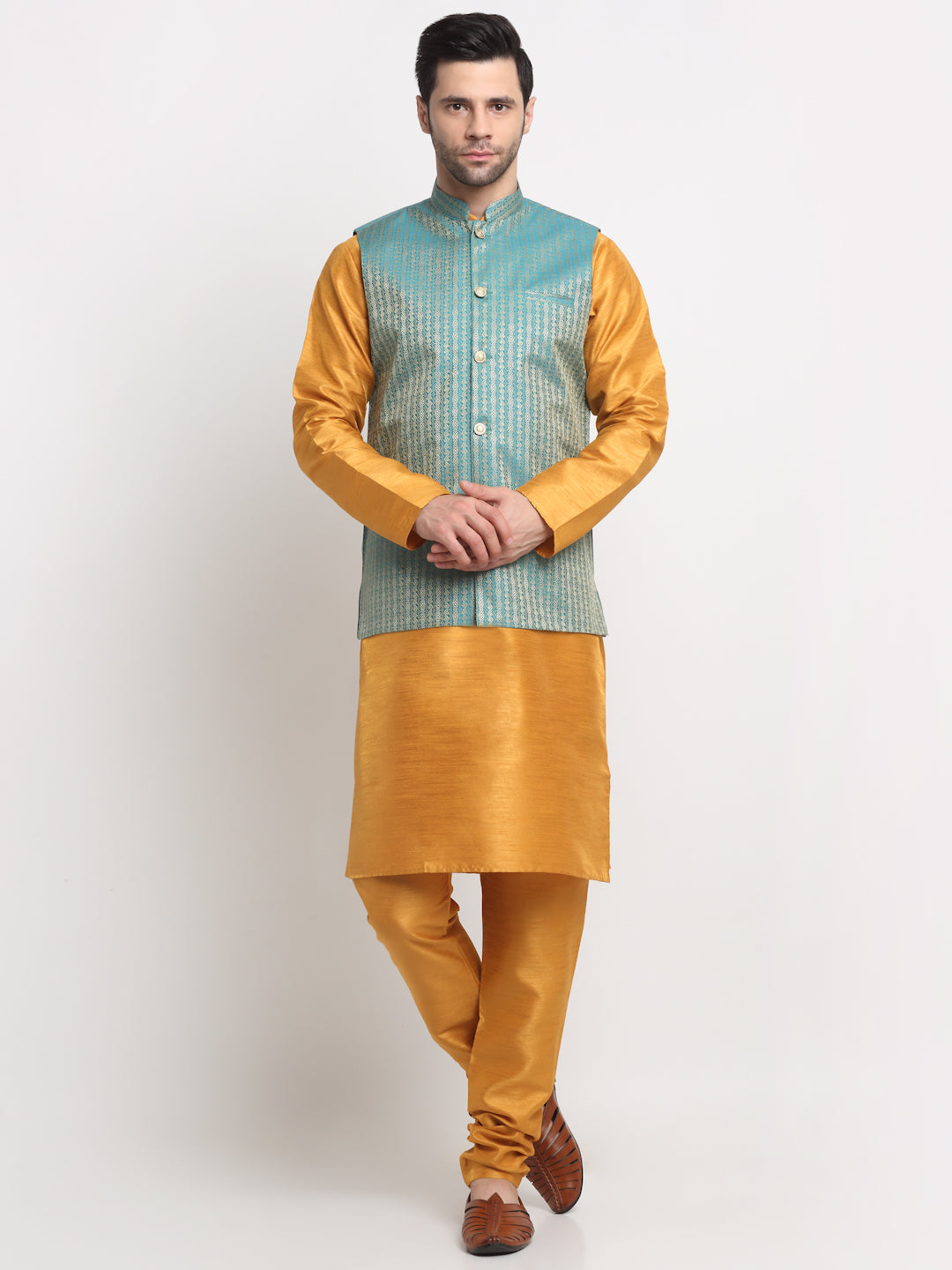 Mustard Solid Silk Kurta & Churidar with Nehru jacket Mustard solid straight knee length kurta has mandarin collar, long sleeves, side pockets, straight hem, loopi button closure, side slits, with drawstring closure Mustard churidar Silk Printed Nehru jacket, has a mandarin collar, sleeveless, button closure, three pockets, an attached lining