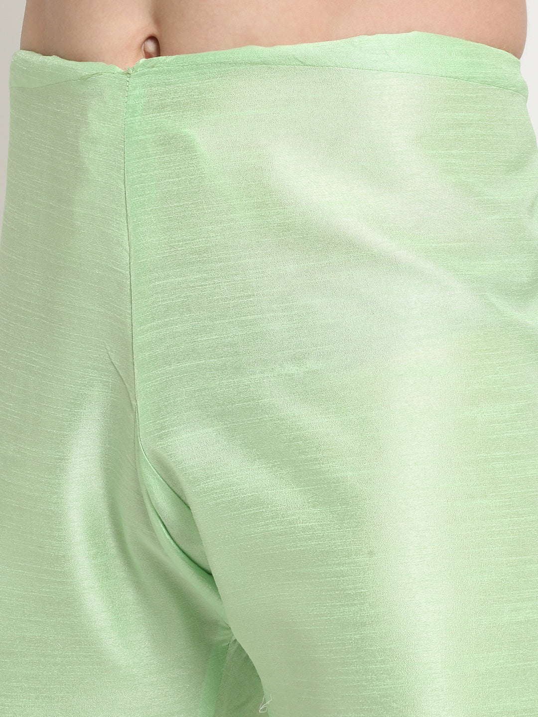 Sea Green Solid Silk Kurta & Churidar with Yellow Nehru jacket Sea Green solid straight knee length kurta has mandarin collar, long sleeves, side pockets, straight hem, loopi button closure, side slits, with drawstring closure Sea Green churidar Yellow Silk Printed Nehru jacket, has a mandarin collar, sleeveless, button closure, three pockets, an attached lining