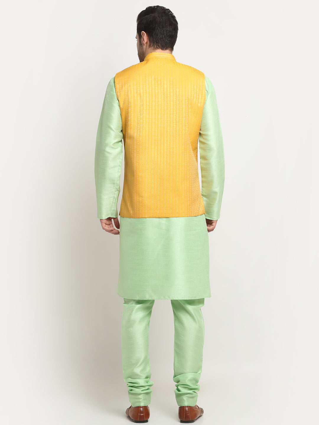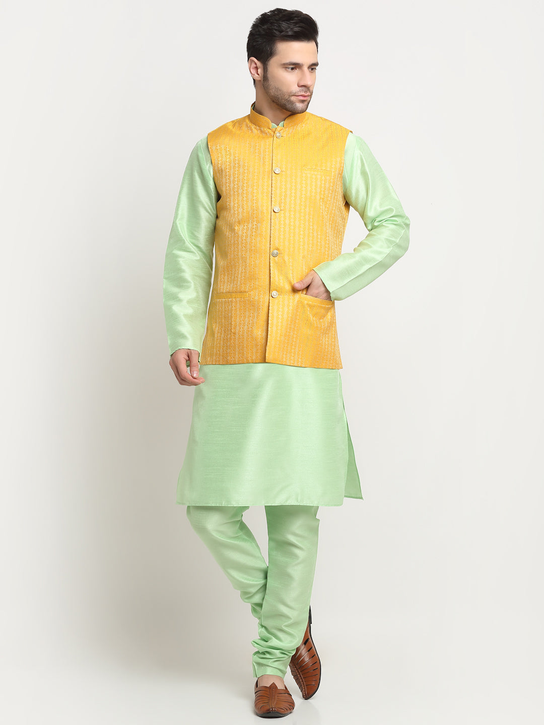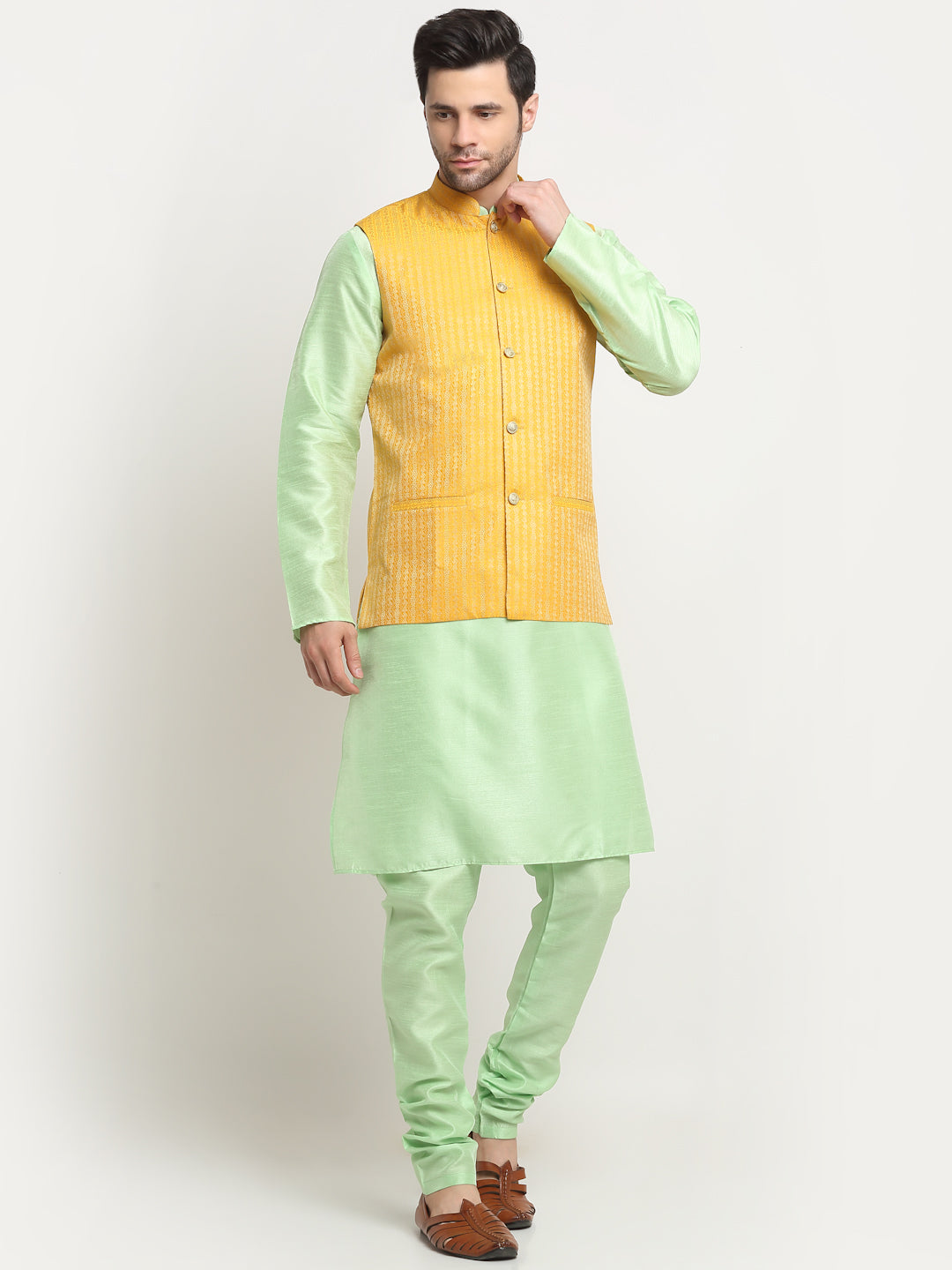 KRAFT INDIA Men's Silk Sea Green Kurta Churidar with Yellow Nehru Jacket Set