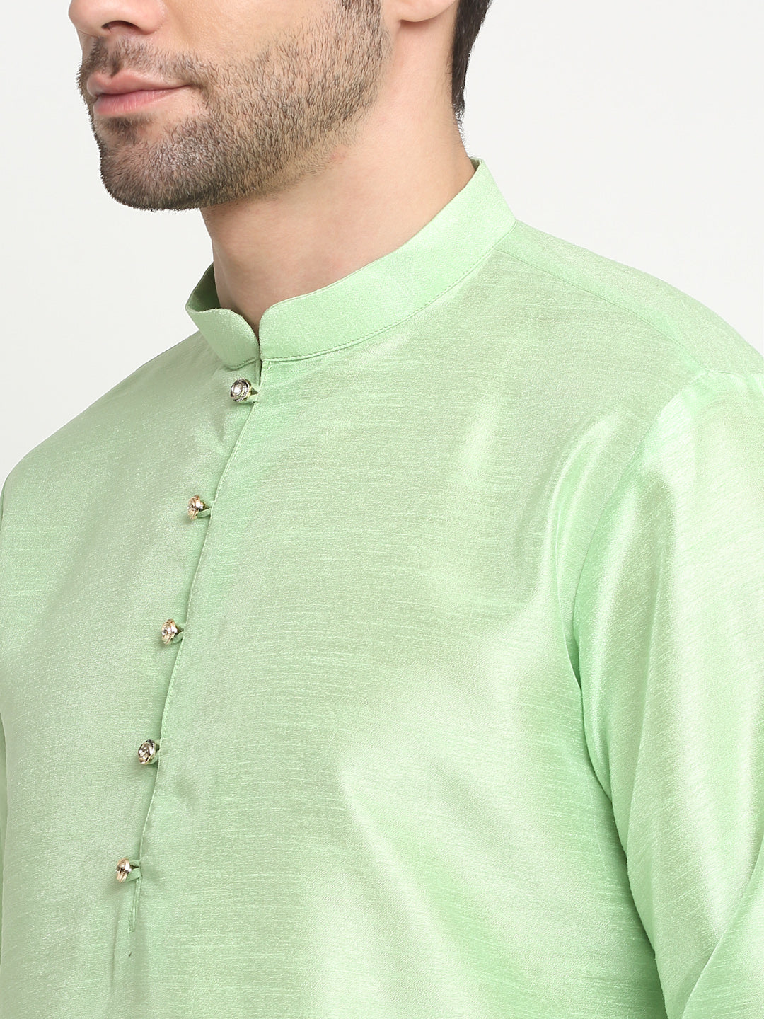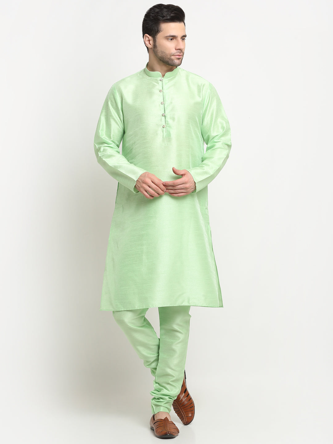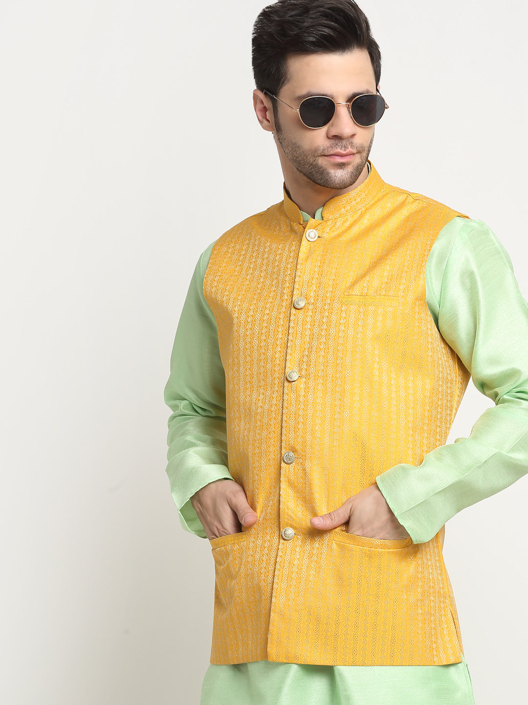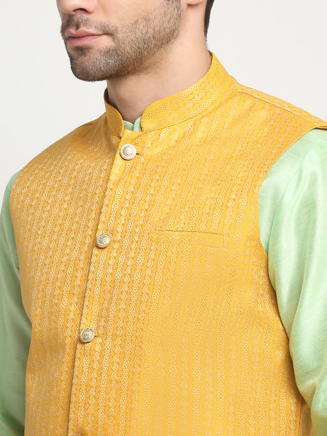 KRAFT INDIA Men's Silk Sea Green Kurta Churidar with Yellow Nehru Jacket Set