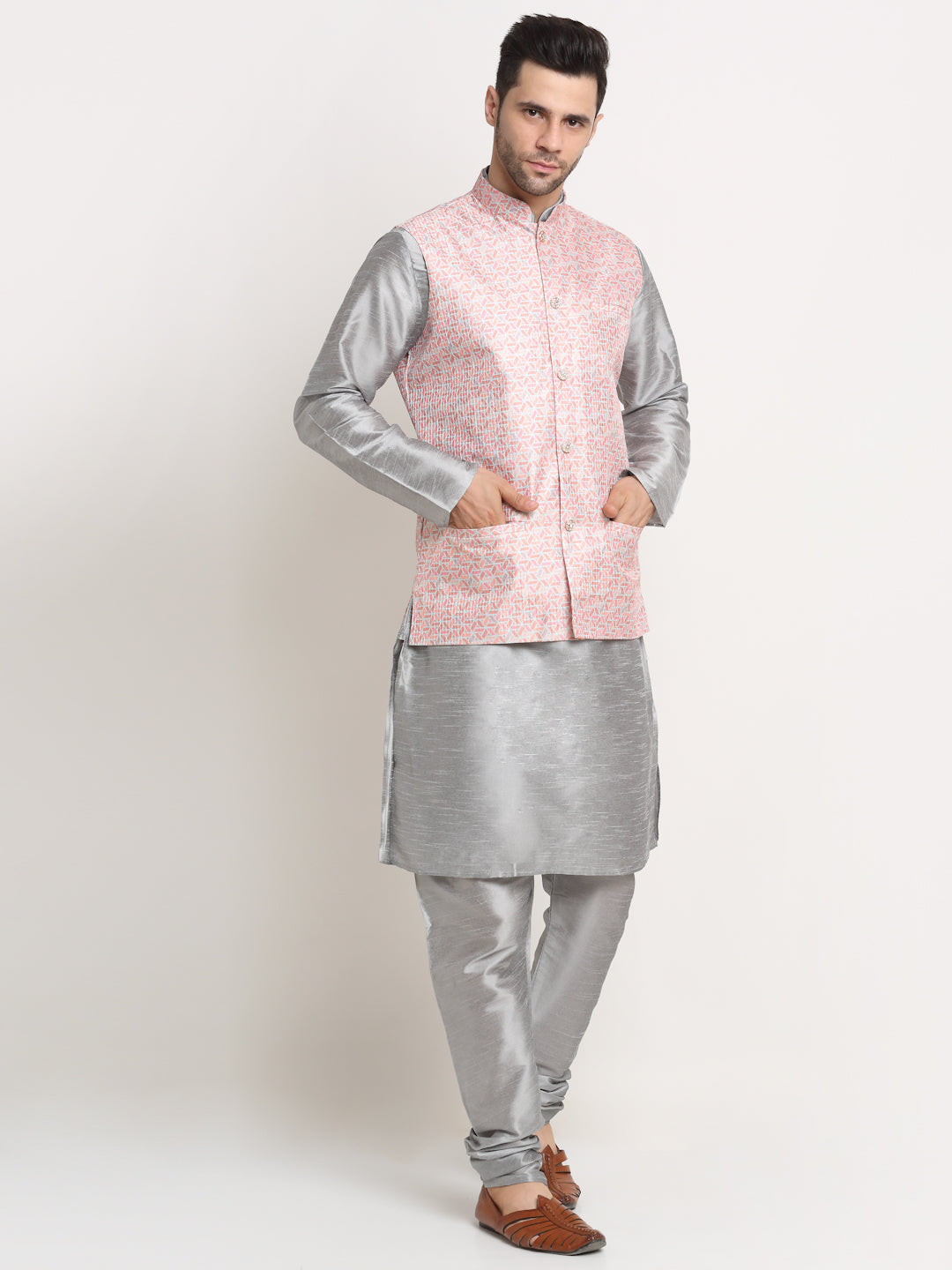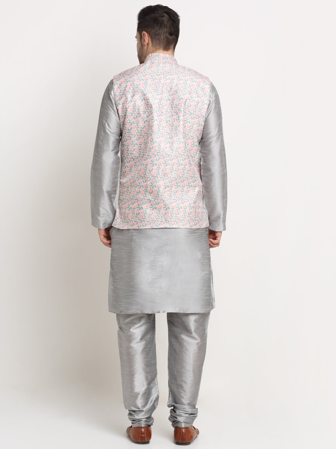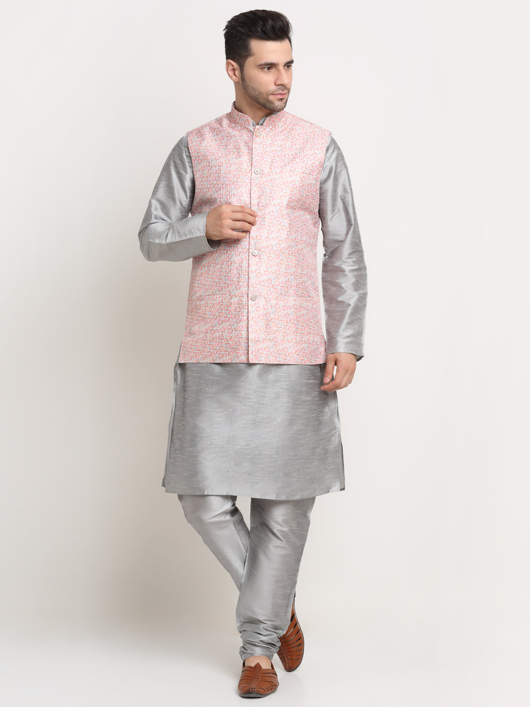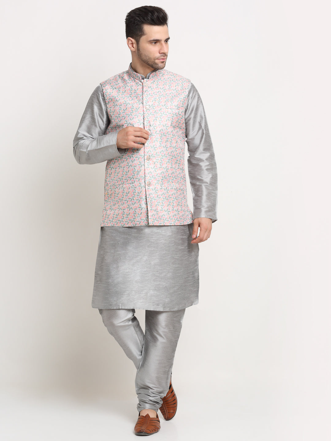KRAFT INDIA Mens Silver Silk Blend Kurta and churidar with embroided Nehru jacket