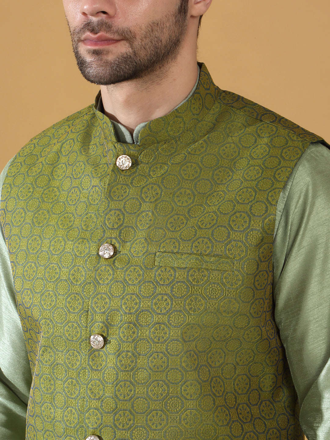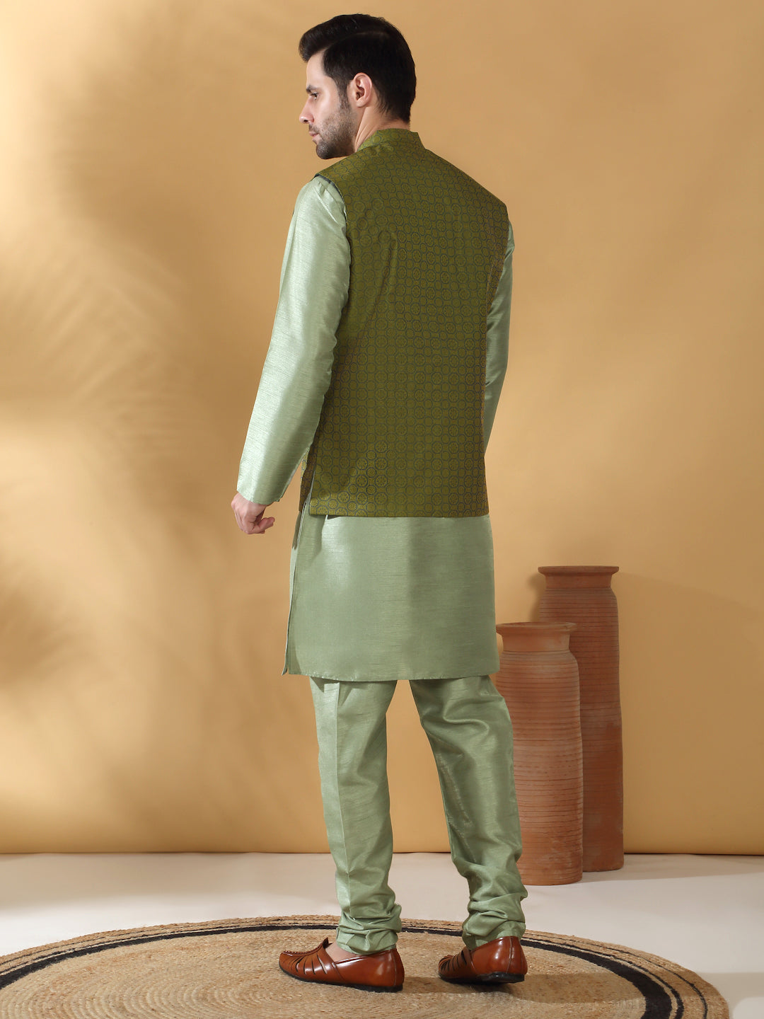 Olive Green Silk Blend Kurta churidar with Jacquard Geometric Sleeveless Nehru Jacket set