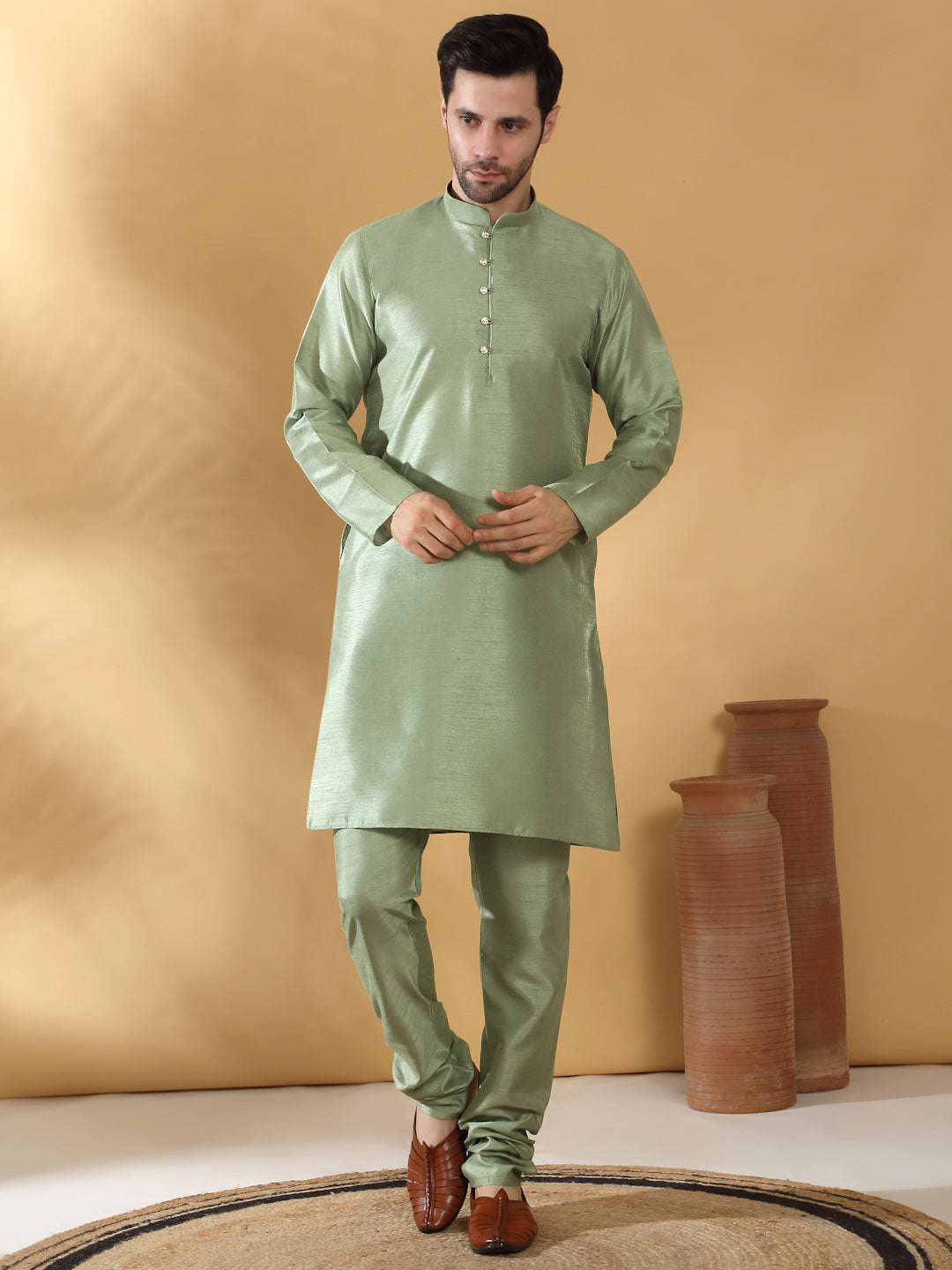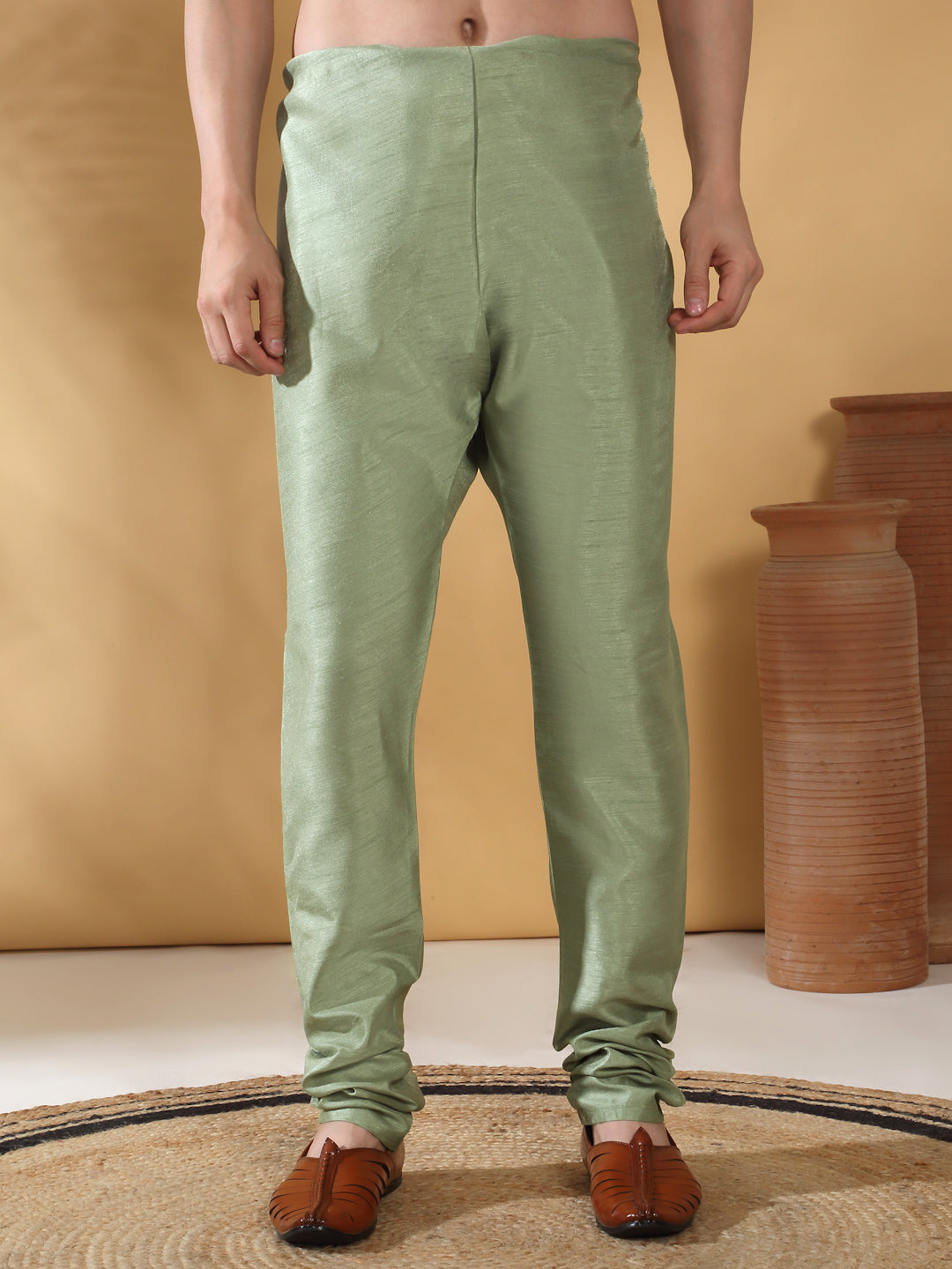 Elevate your ethnic attire with this Men's Silk Blend Kurta Churidar with Jacquard Geometric Sleeveless Nehru Jacket Set. Crafted from premium silk blend fabric, the kurta and churidar offer a graceful drape and superior comfort, while the sleeveless Nehru jacket boasts an intricate jacquard geometric design that adds a modern twist to a traditional silhouette. Perfect for festive occasions or formal events, this set effortlessly combines classic elegance with contemporary style.